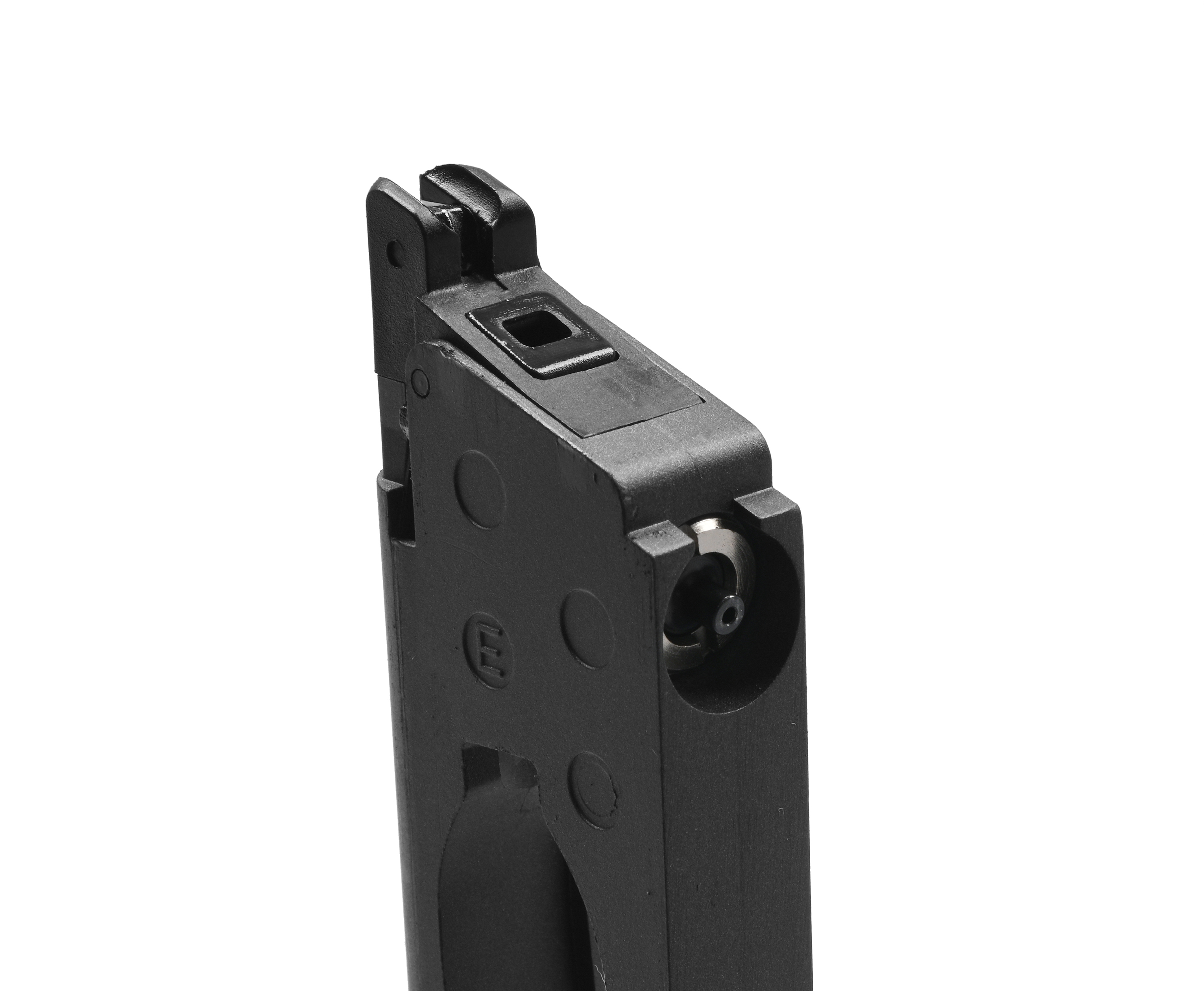 Магазин также исполняет свою прямую функцию боепитания оружия и снаряжается 4.5 мм шариками BB. Стальные сферические пули размещаются в направляющем желобе вручную и подпираются витой пружиной с бегунком, благодаря чему своевременно подаются в приемник пистолета. Заявленная вместимость составляет 17 зарядов.