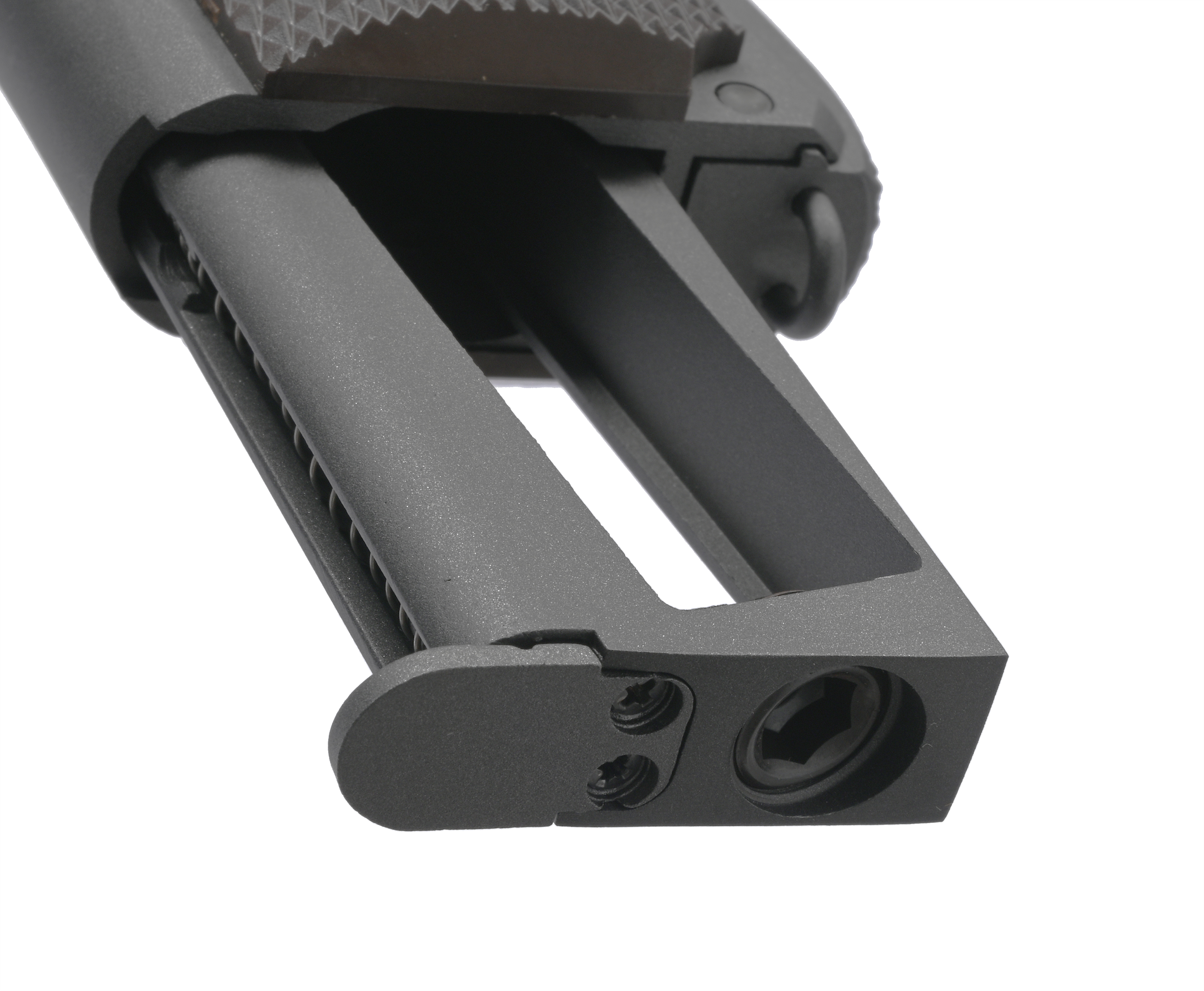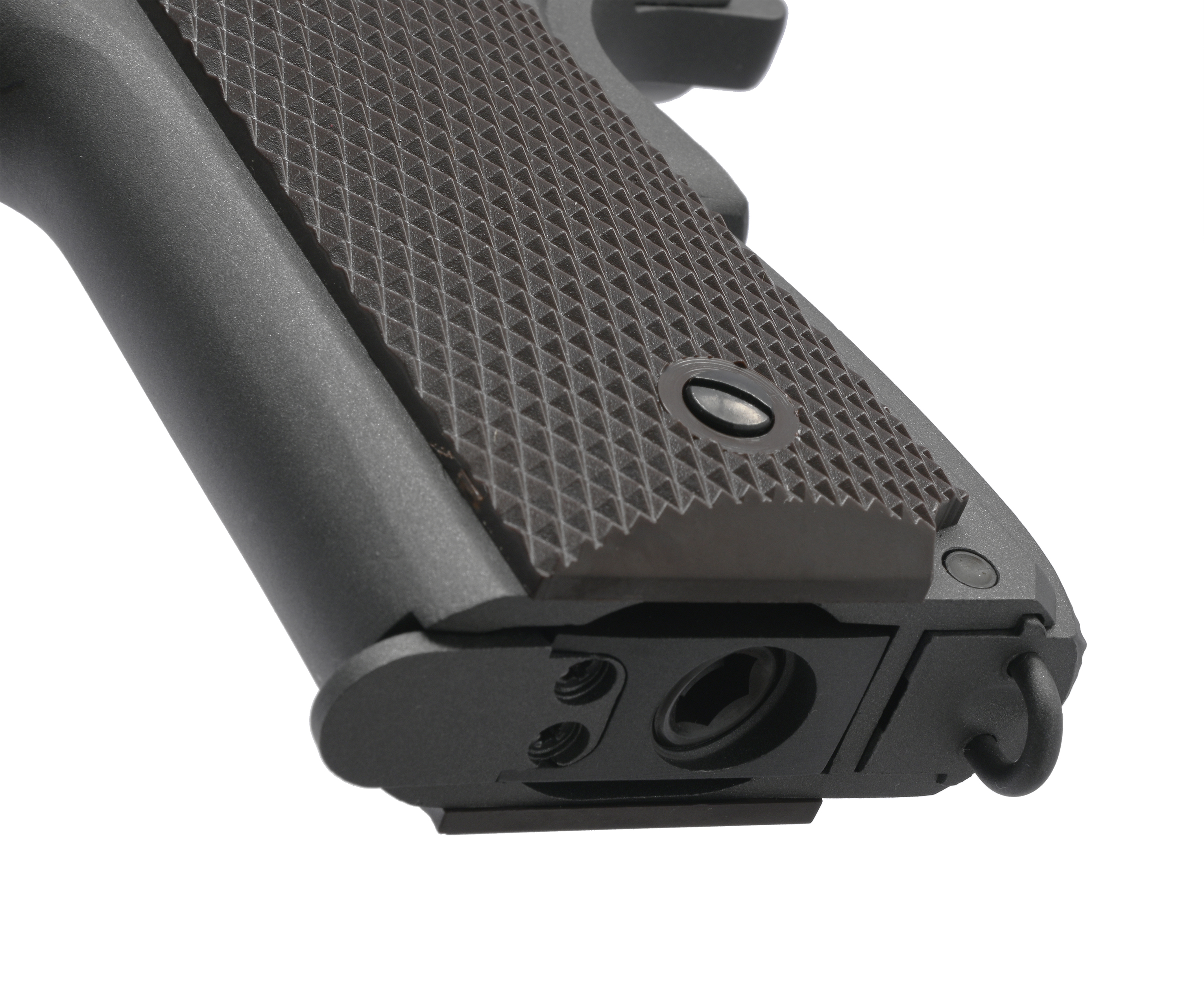 Пневматический KWC Colt 1911 сконструирован по газобаллонной схеме. Это значит, что для совершения выстрела потребуются сменные углекислотные резервуары. Одноразовая металлическая емкость CO2 12 грамм устанавливается непосредственно в полость магазина, совмещенного с клапаном, пропускающим смесь в канал ствола.