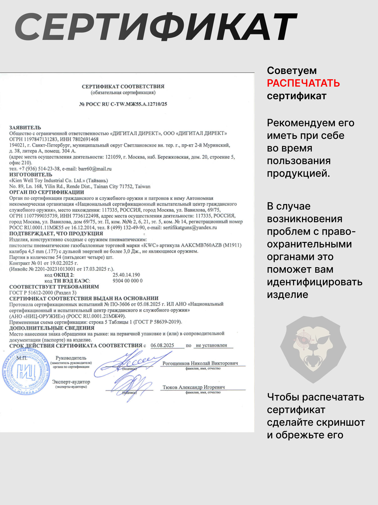 | Комплектация | Пистолет, магазин, ключ, упаковка, краткая документация, копия сертификата (по запросу покупателя) |