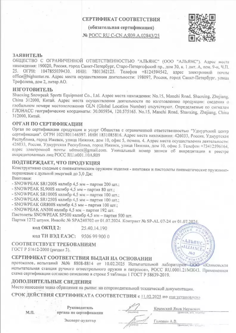 | Комплектация | Пистолет, упаковка, краткая документация, копия сертификата (по запросу покупателя) |