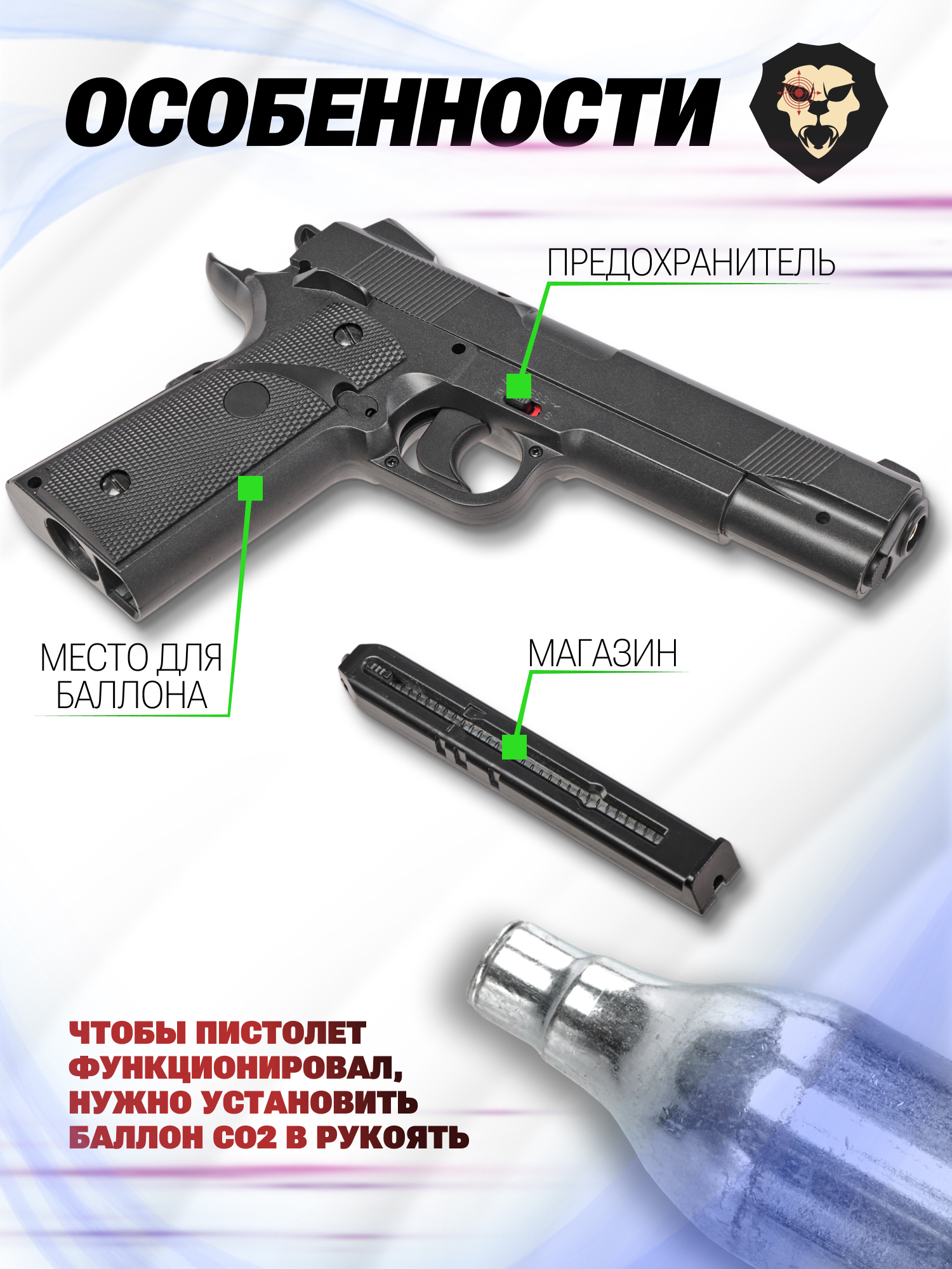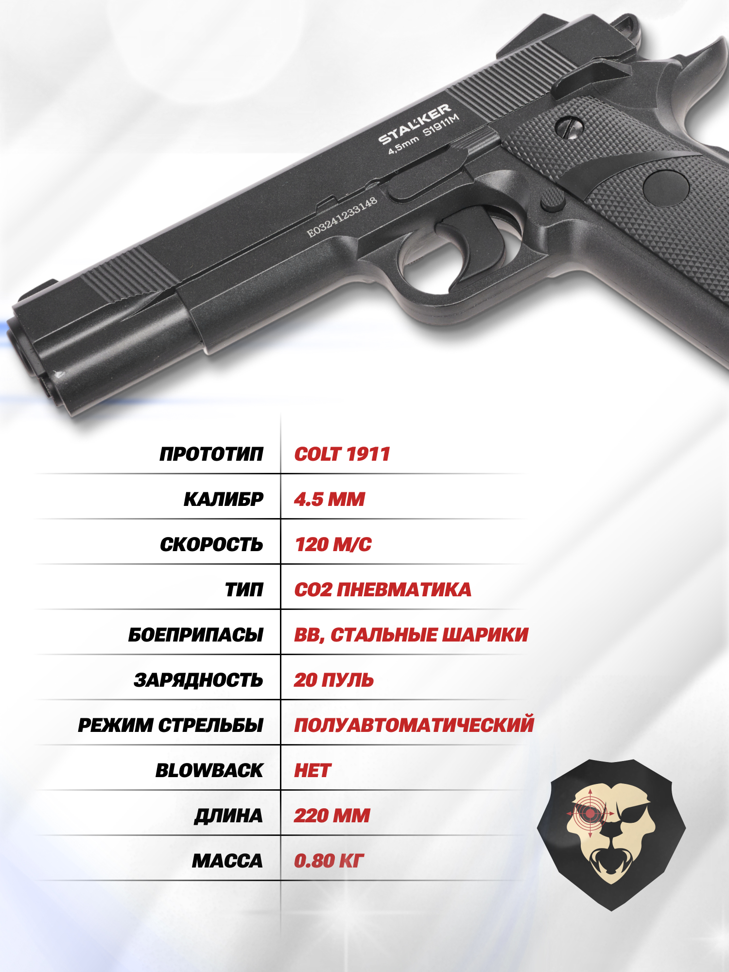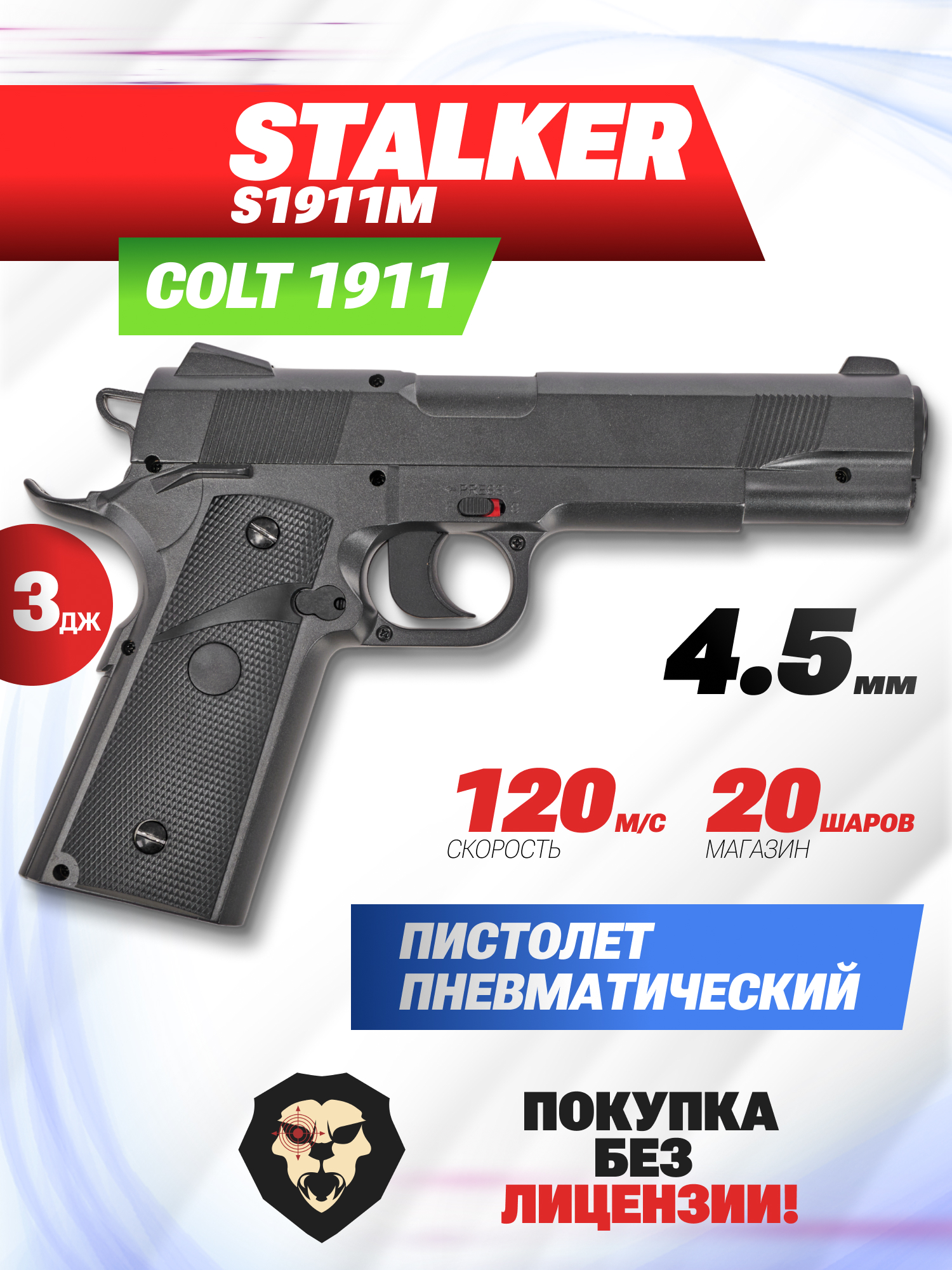 Шарик под действием газа разгоняется по каналу и выпускается со скоростью до 120 метров в секунду. Модель 1911 от Stalker характеризуется мощностью в пределах разрешенных законом РФ значений менее 3 Дж. Исходя из этой особенности, приобрести образец сможет каждый по достижении возраста совершеннолетия - требование к наличию лицензии отсутствует.