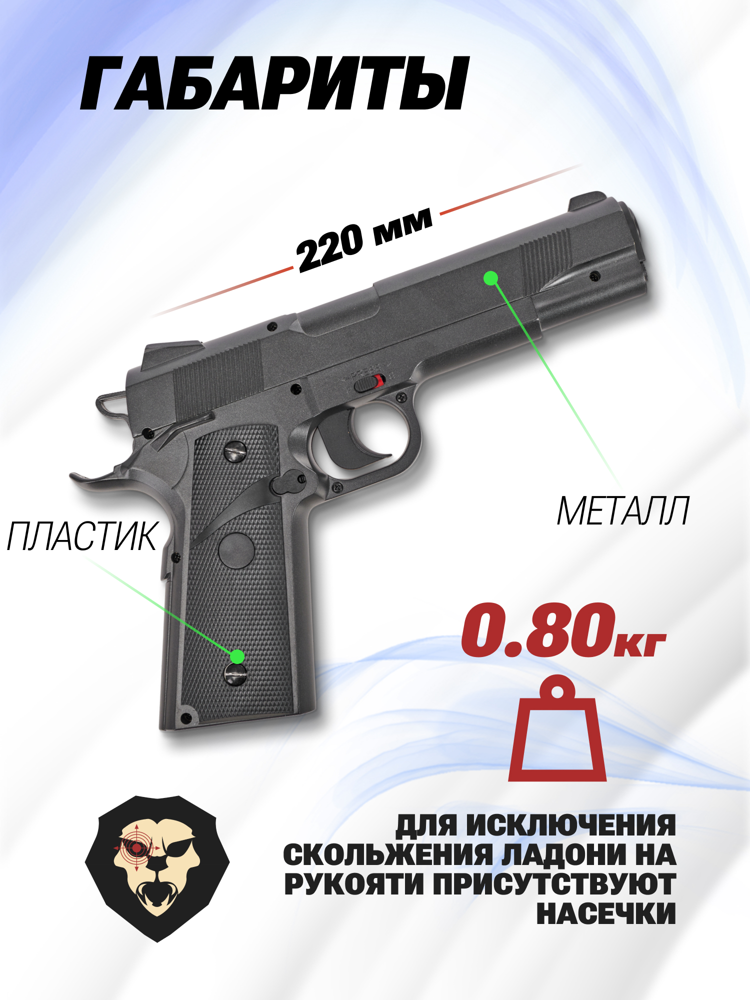 Длина экземпляра составляет 22 сантиметра, тогда как масса пневматики не превышает 800 г. Комфорт удержания достигается благодаря полимерным накладкам рукоятки с текстурированной поверхностью, из-за чего устраняется скольжение ладони. Для наведения предусмотрены стандартные механические приспособления открытого типа.