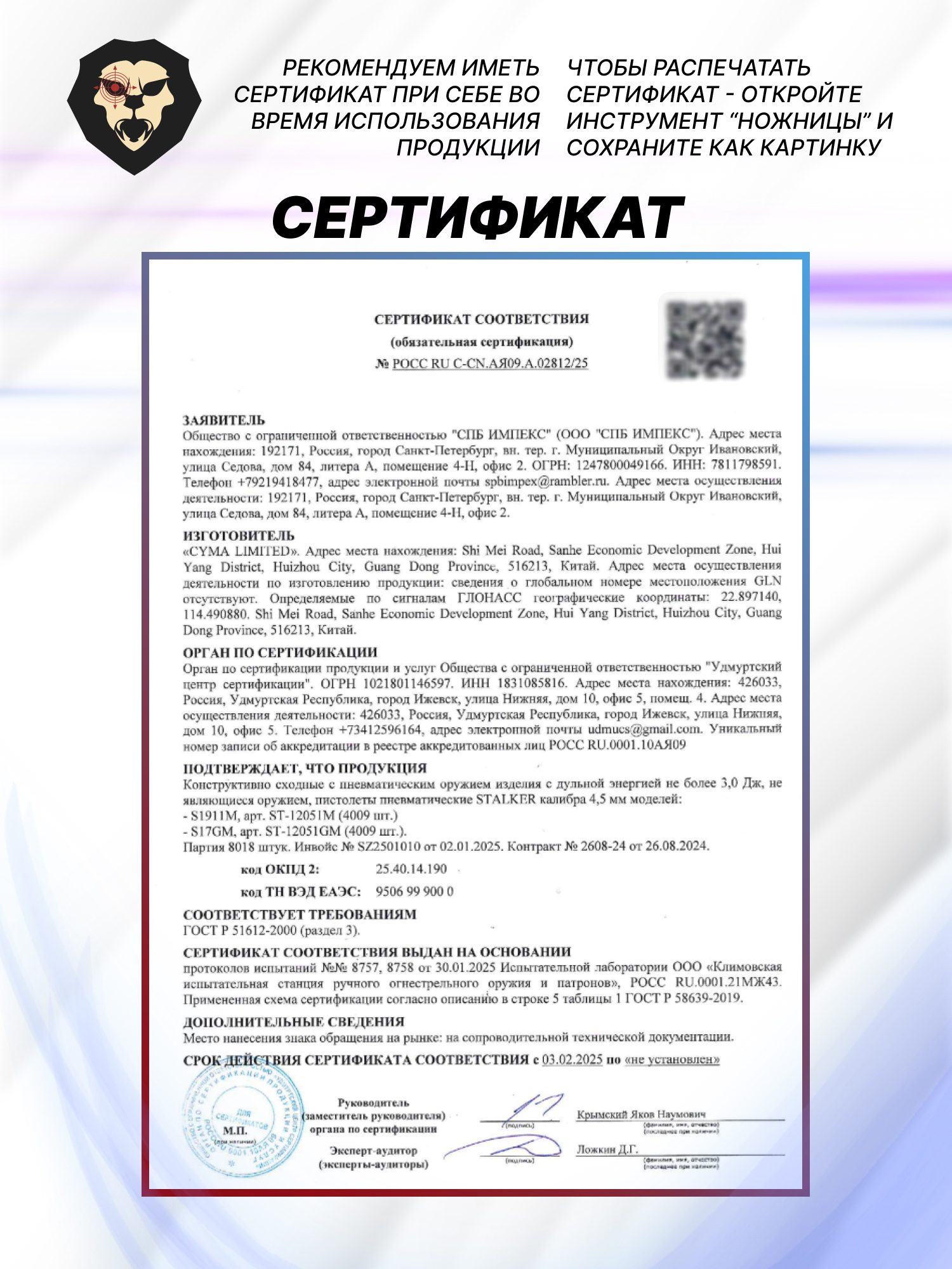 | Комплектация | Пистолет, магазин, ключ, краткая документация, копия сертификата (по запросу покупателя) |