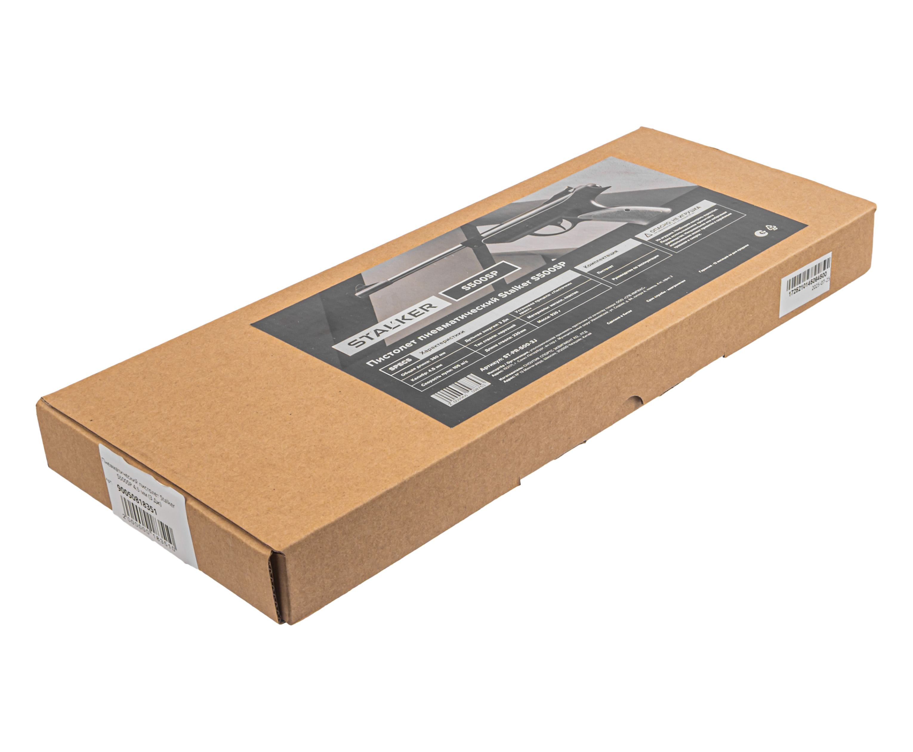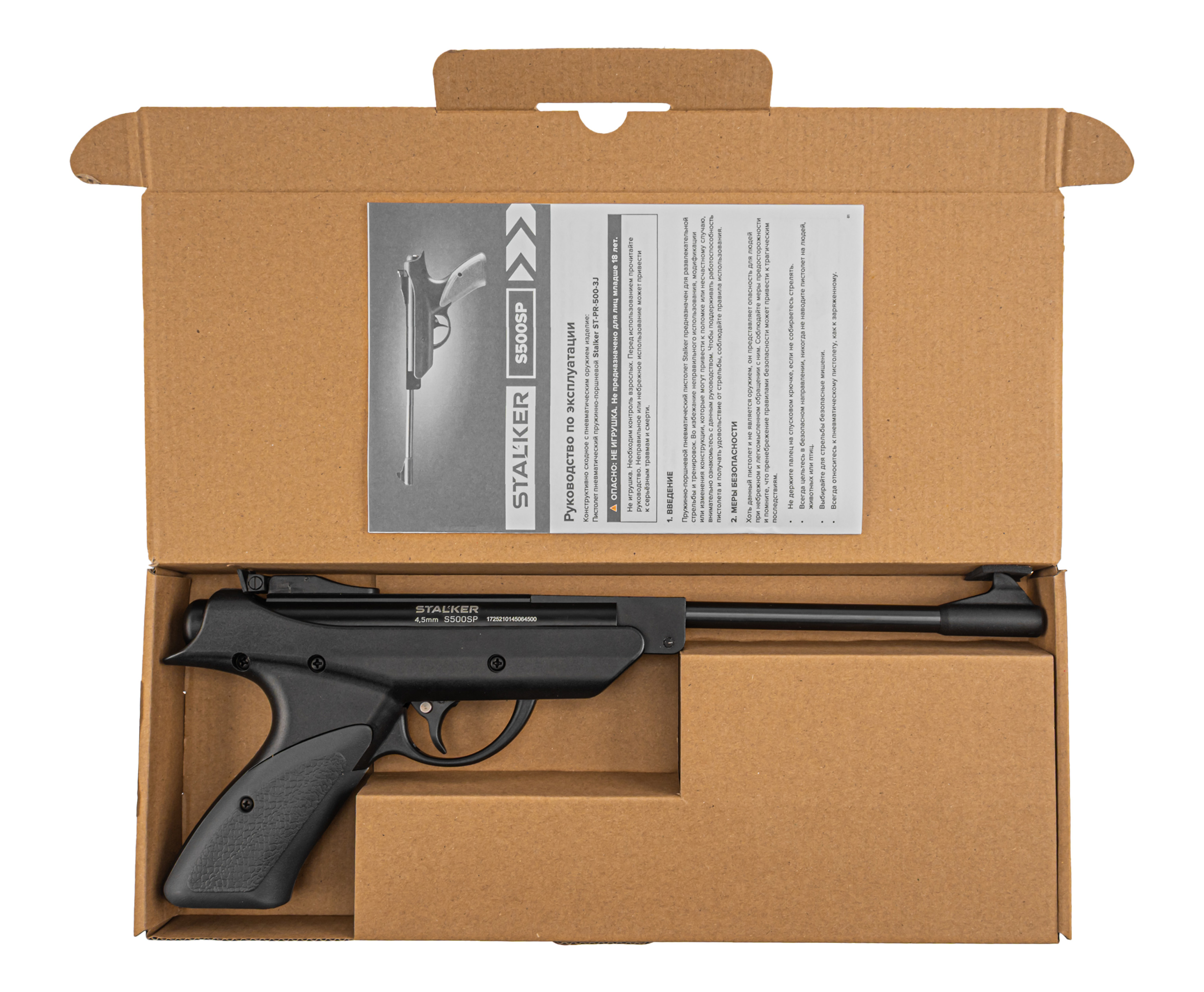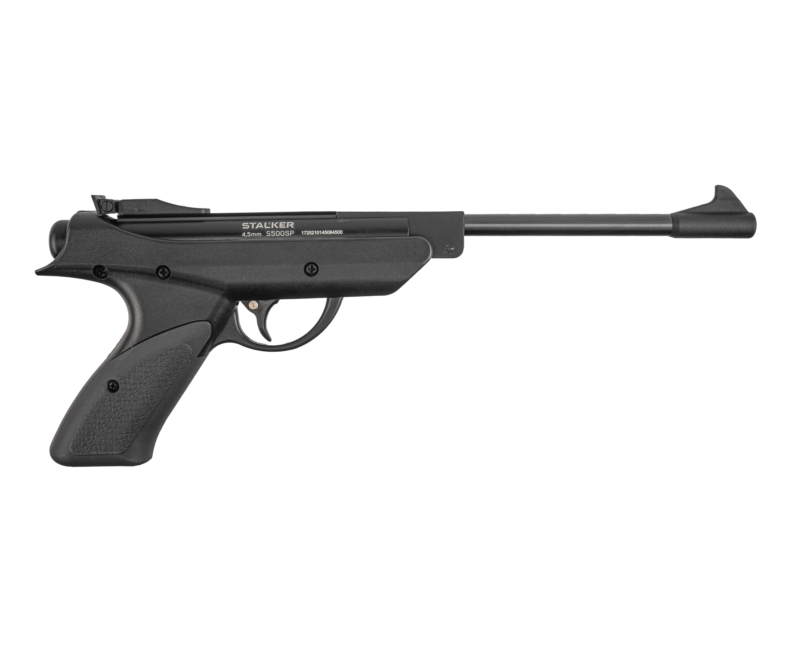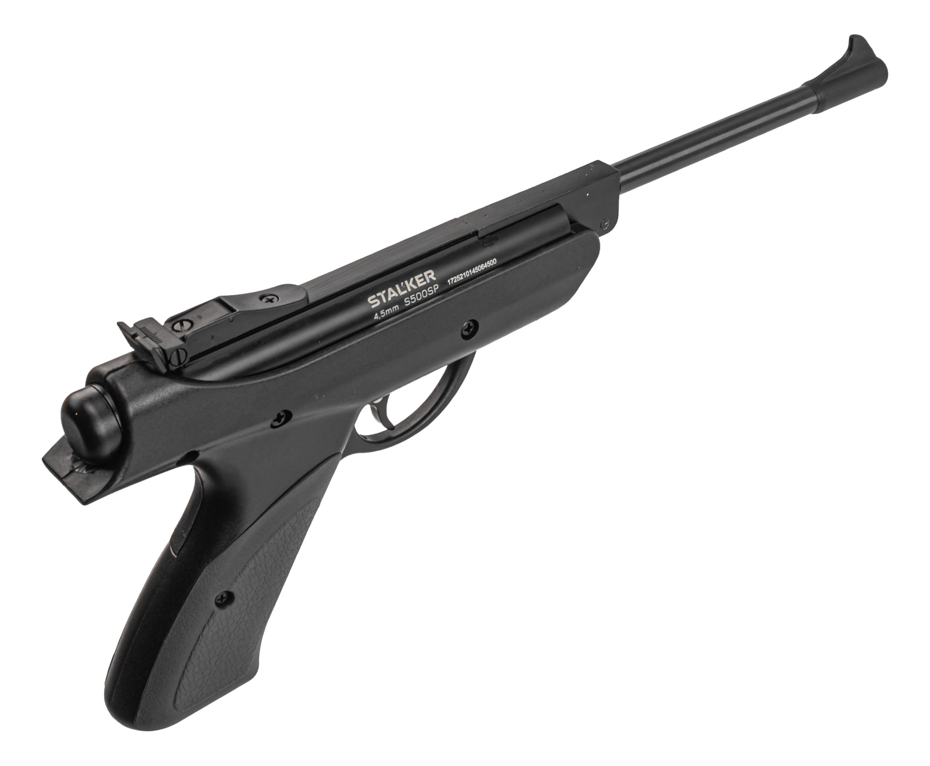 Собственные вариации таких изделий представила фирма Stalker, не первый год предлагающая доступную пневматику. При этом товарный ряд включает как полноразмерные винтовки, таки пистолеты. К числу последних относится рассматриваемый экземпляр S500SP, выполненный в калибре 4.5 миллиметра и рассчитанный на стрельбу воланчиковыми пулями.
