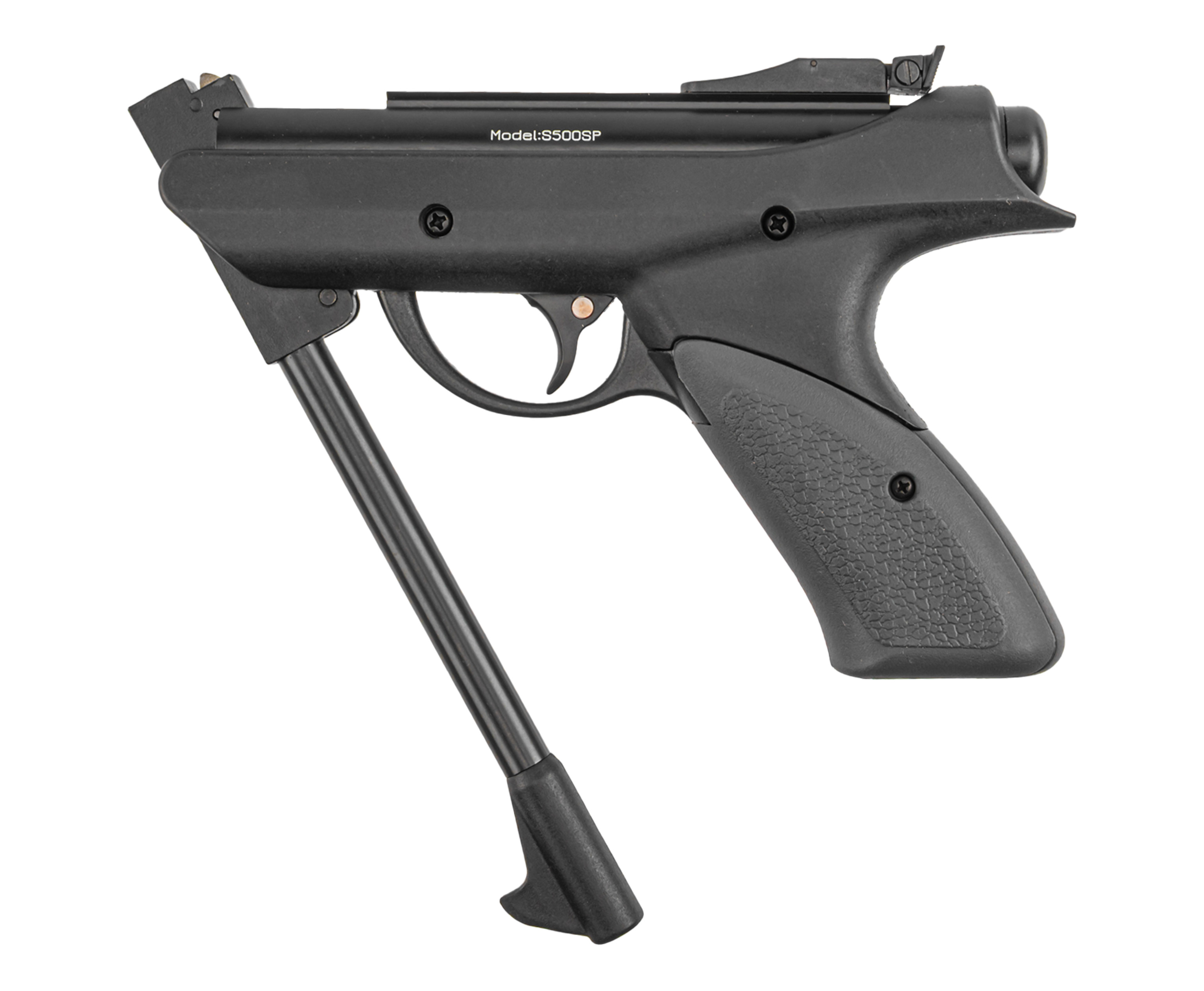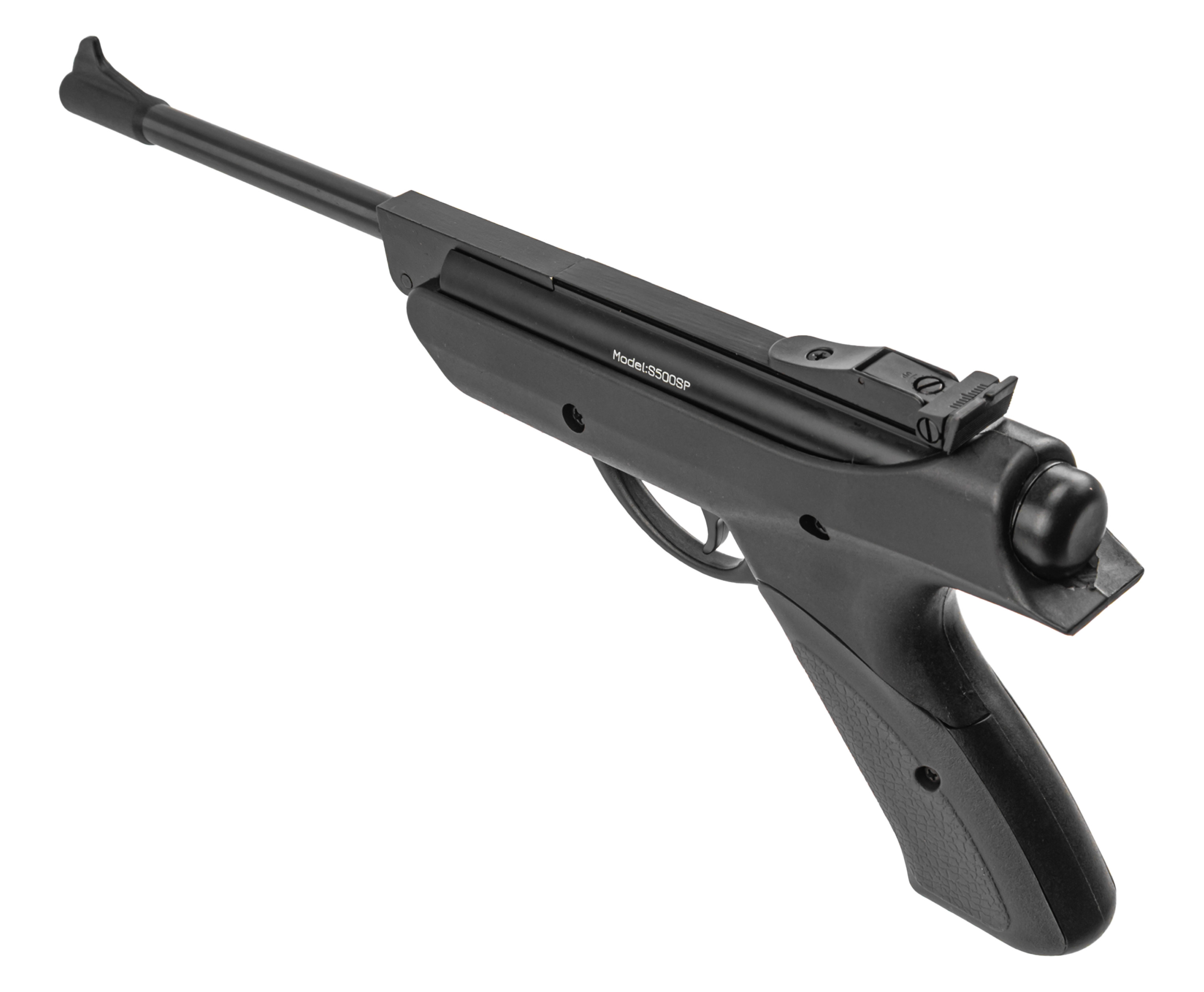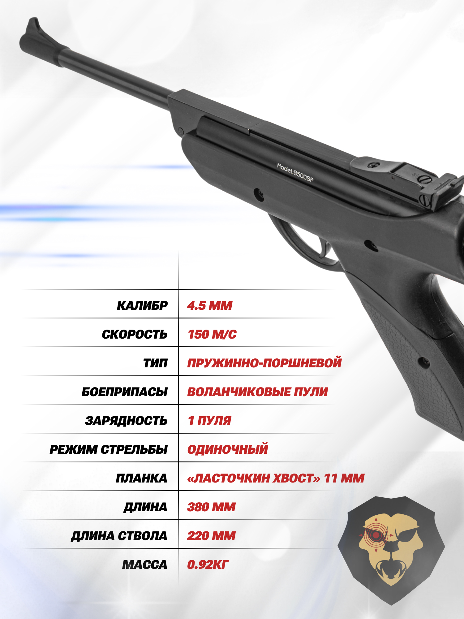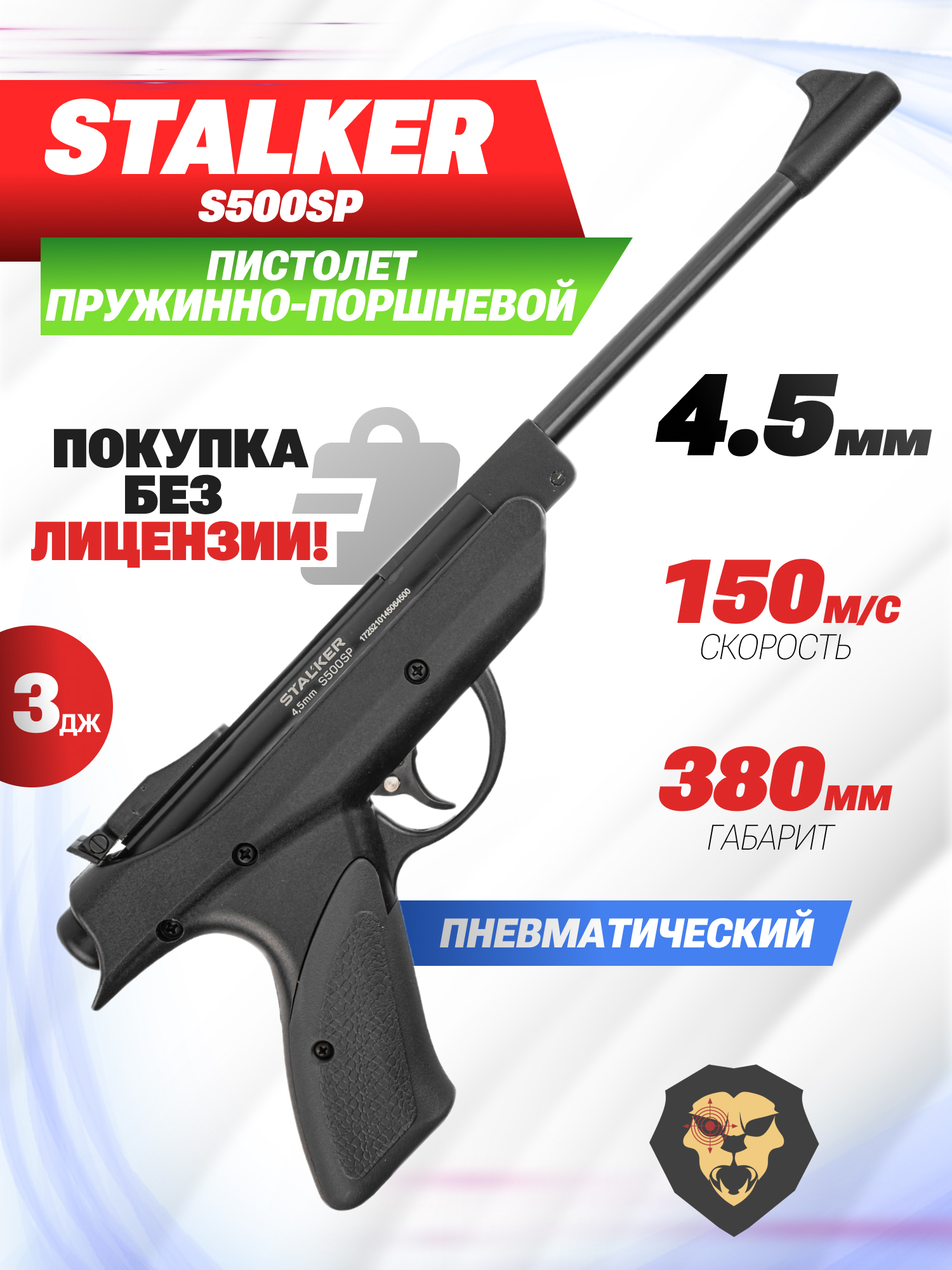 Собственные вариации таких изделий представила фирма Stalker, не первый год предлагающая доступную пневматику. При этом товарный ряд включает как полноразмерные винтовки, таки пистолеты. К числу последних относится рассматриваемый экземпляр S500SP, выполненный в калибре 4.5 миллиметра и рассчитанный на стрельбу воланчиковыми пулями.