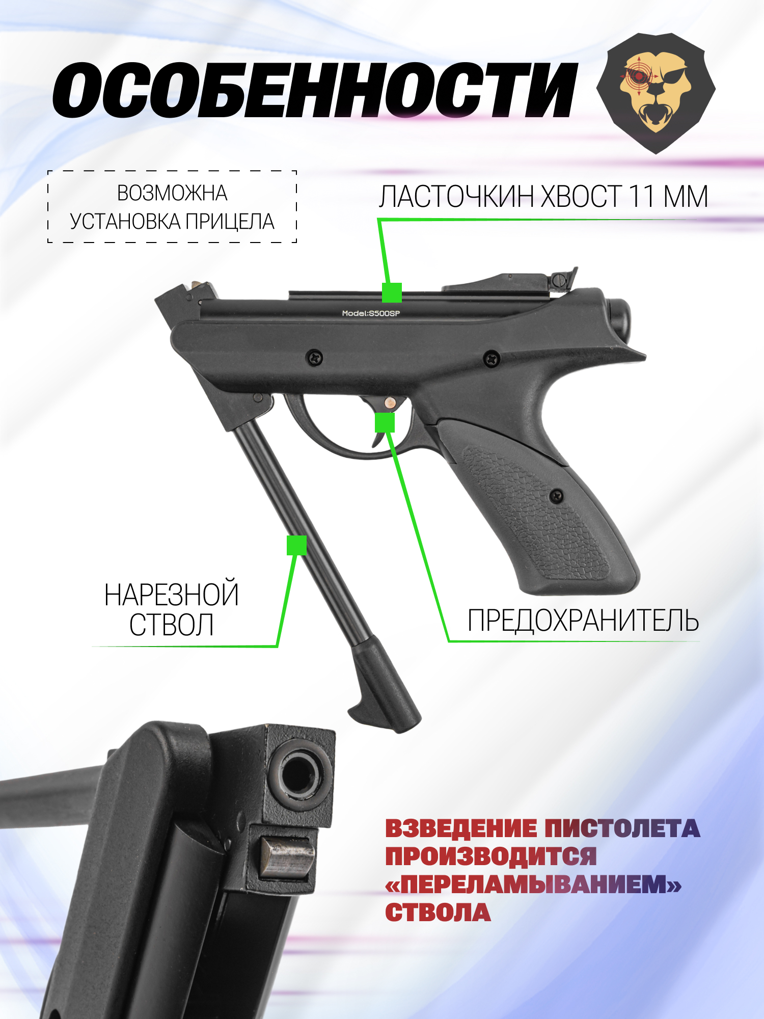 Кроме этого, конструктив пневматики Сталкер С500СП предрасполагает к дооснащению навесным оборудованием. На верхней части ствольной коробки есть посадочная направляющая стандарта «Ласточкин хвост» 11 мм. Интерфейс может задействоваться для размещения коллиматора или оптического прицела на совместимых кронштейнах.