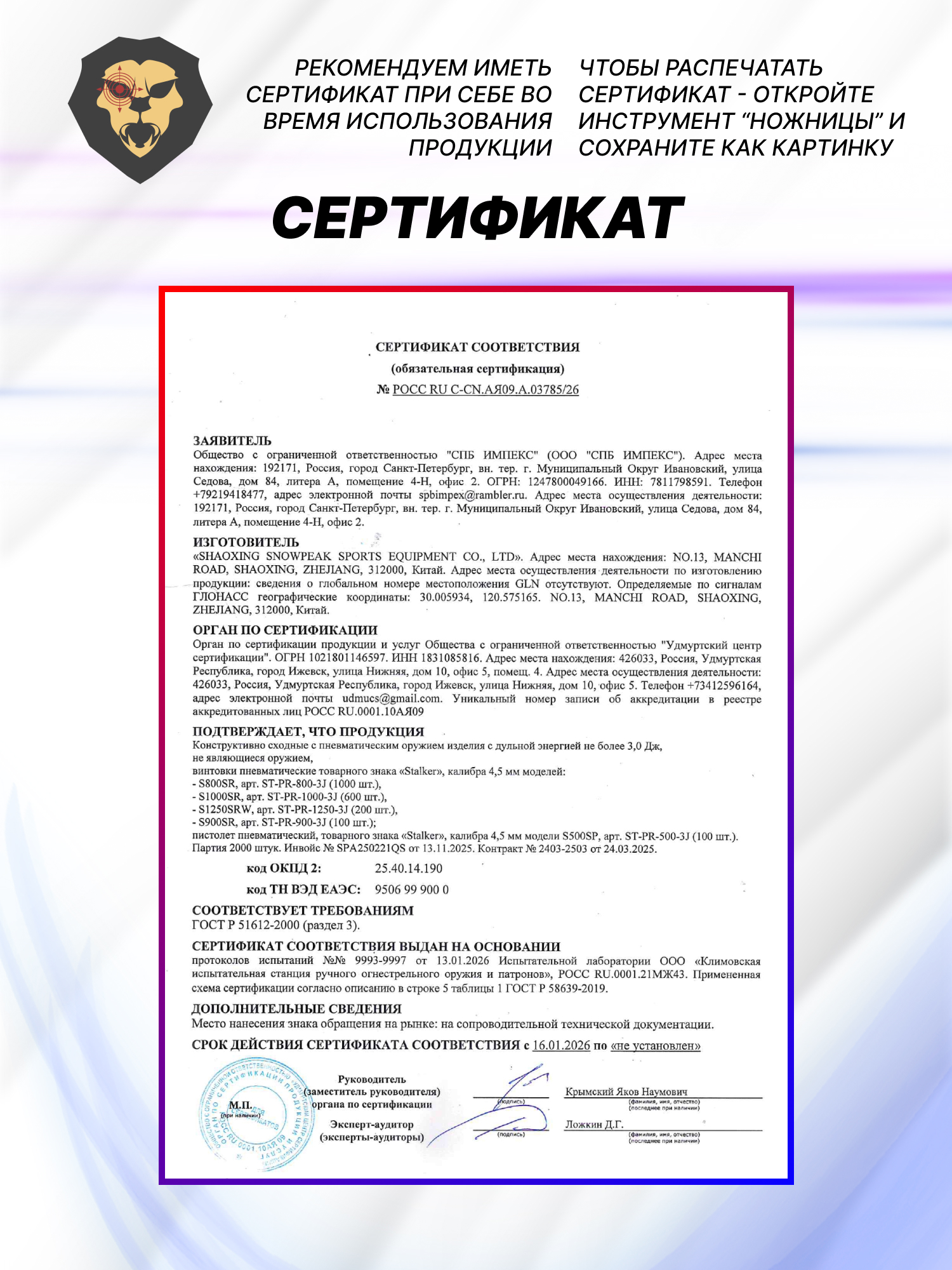 | Комплектация | Пистолет, упаковка, краткая документация, копия сертификата (по запросу покупателя) |