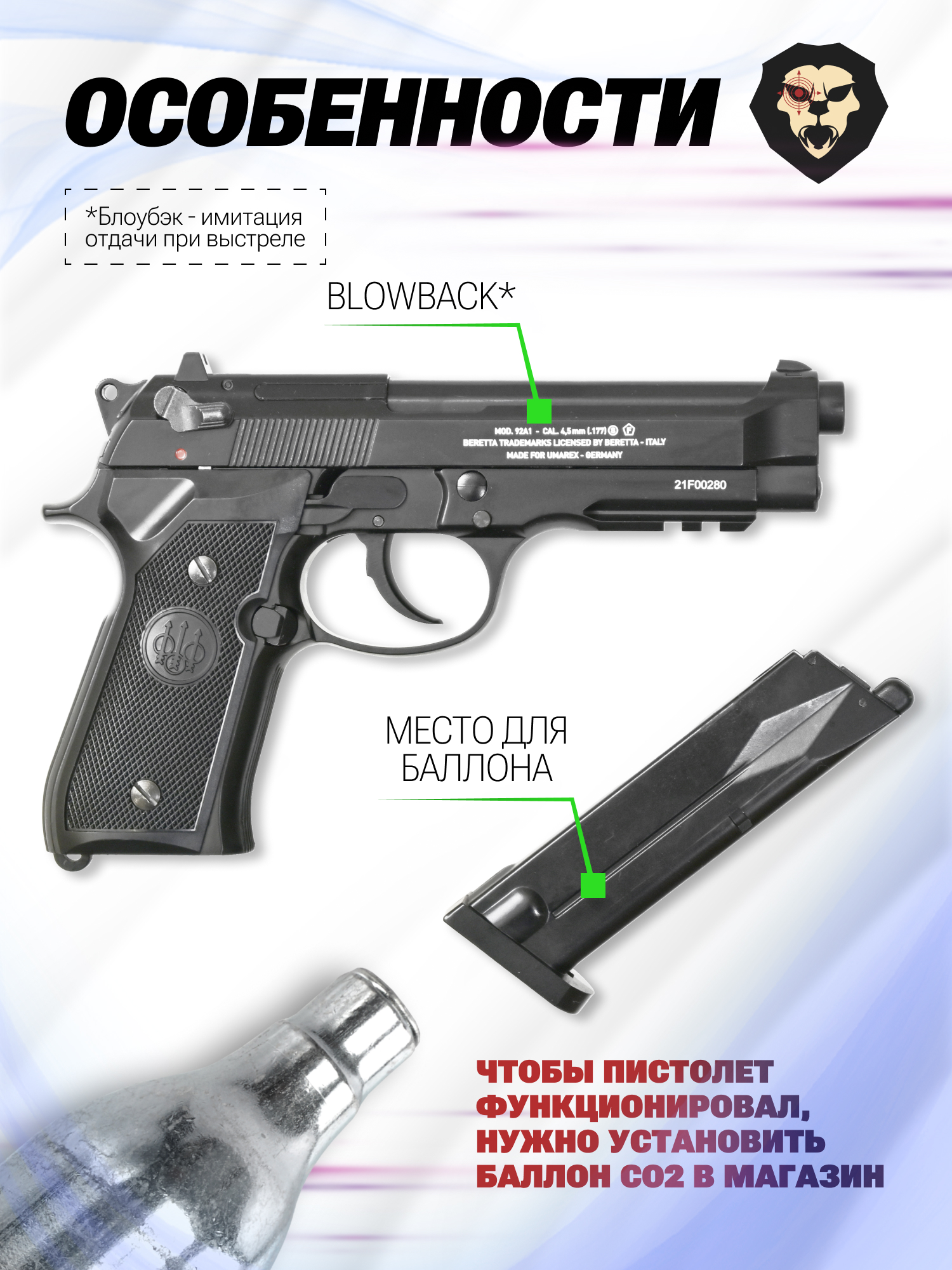 Информация о товаре "Пневматический пистолет Umarex Beretta M92 FS A1 4.5 мм (Черный, Blowback)" носит ознакомительный характер, и не является публичной офертой, определяемой положениями Статьи 437 Гражданского кодекса Российской Федерации, характеристики, внешний вид, цвет и комплектация могут быть изменены производителем без уведомления.