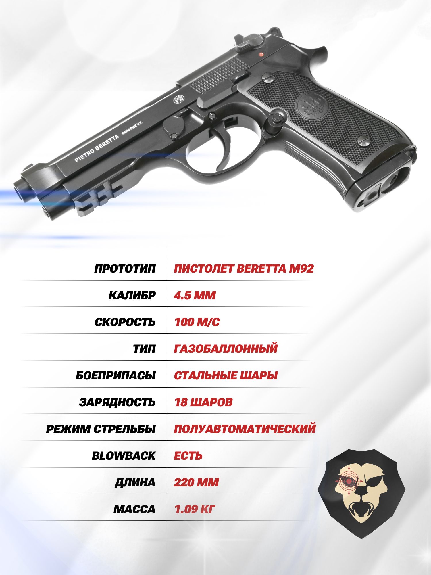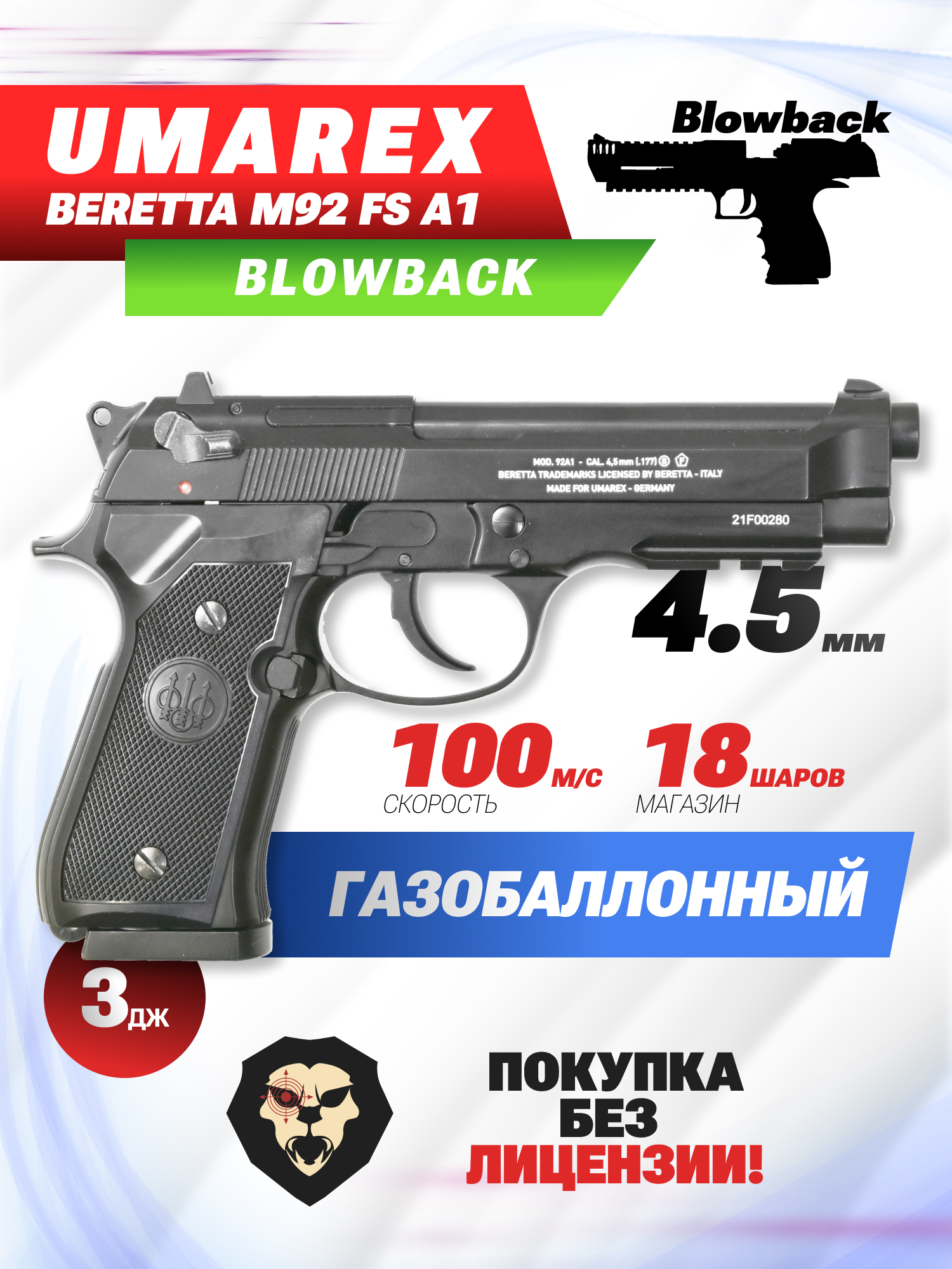 Умарекс Беретта М92 пневматика, которая при выстреле разгоняет боеприпас до скорости, превышающей отметку в 100 м/с. Приобретается пистолет свободно без лицензии, так как мощность выстрела из пистолета не превышает трех Джоулей.