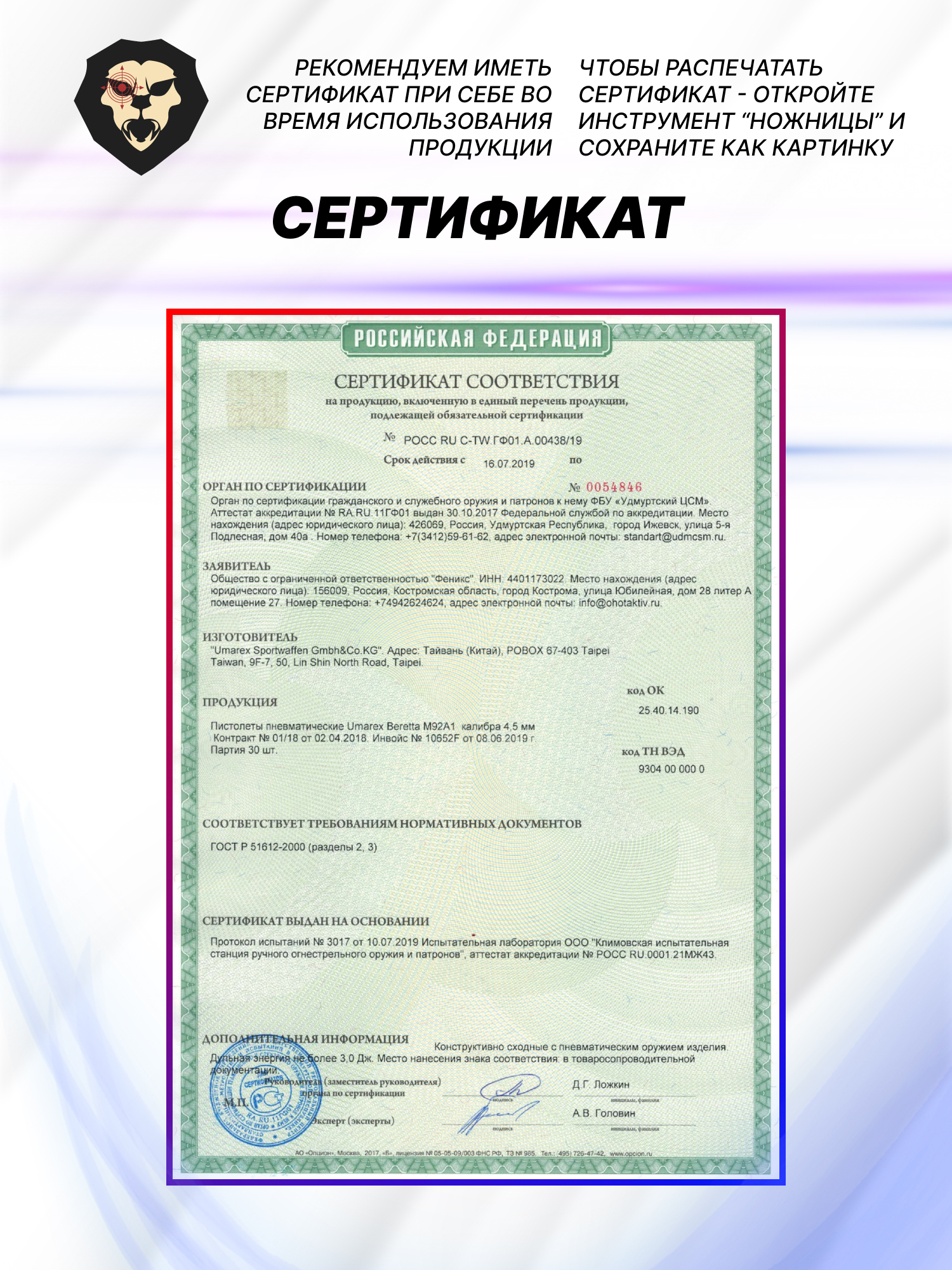 | Комплектация | Пистолет, упаковка, краткая документация, копия сертификата (по запросу покупателя) |