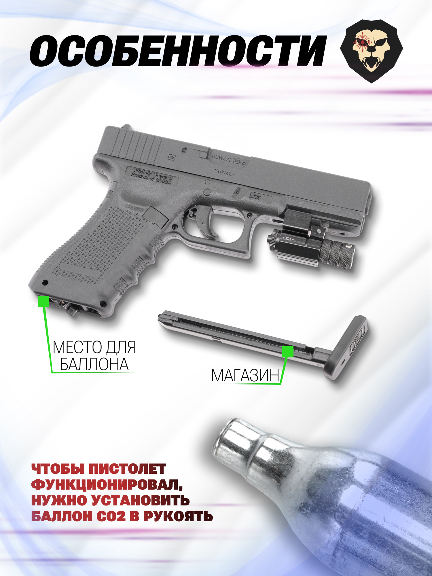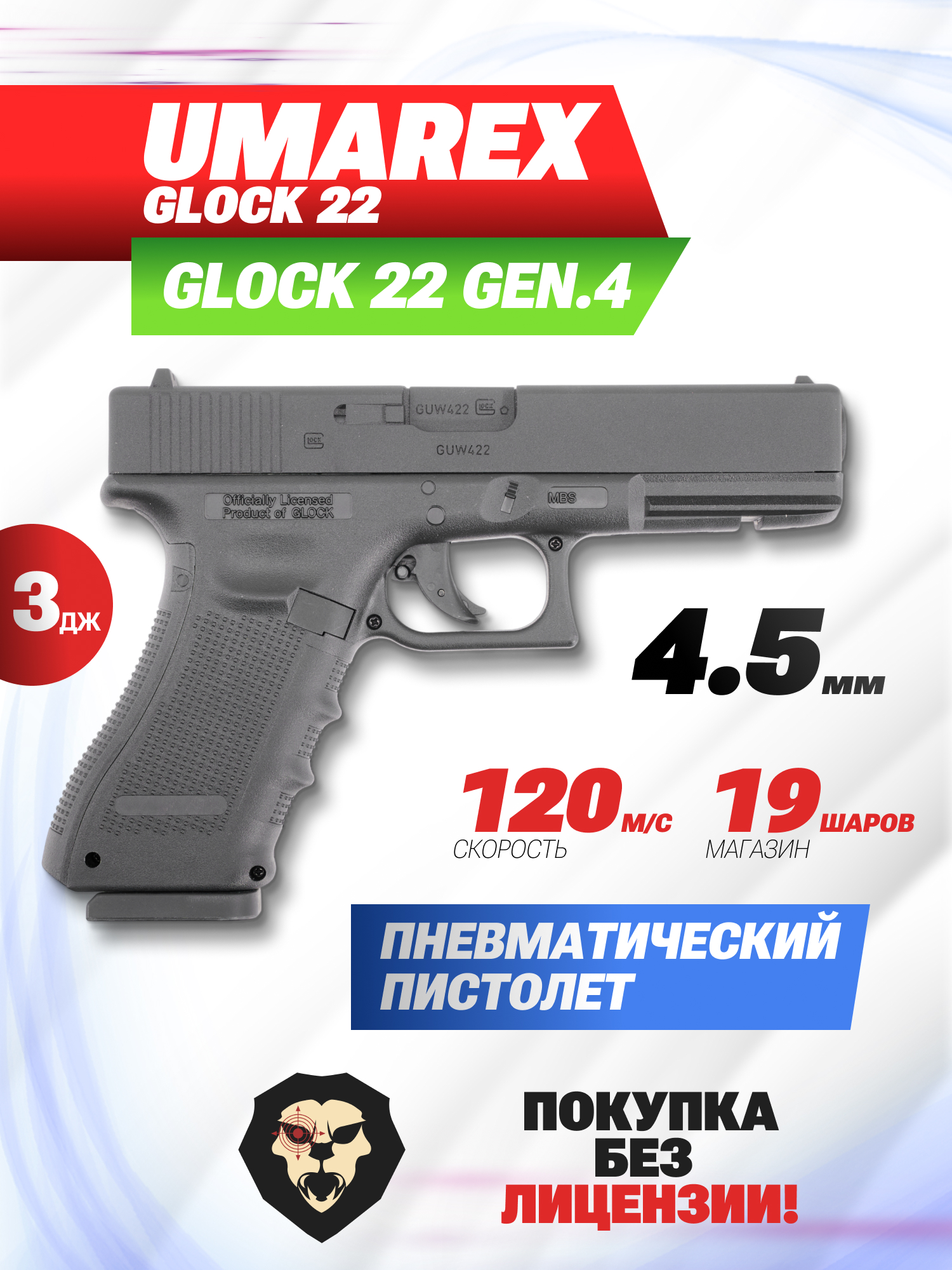 Информация о товаре "Пневматический пистолет Umarex Glock 22 (4.5 мм, Глок)" носит ознакомительный характер, и не является публичной офертой, определяемой положениями Статьи 437 Гражданского кодекса Российской Федерации, характеристики, внешний вид, цвет и комплектация могут быть изменены производителем без уведомления.