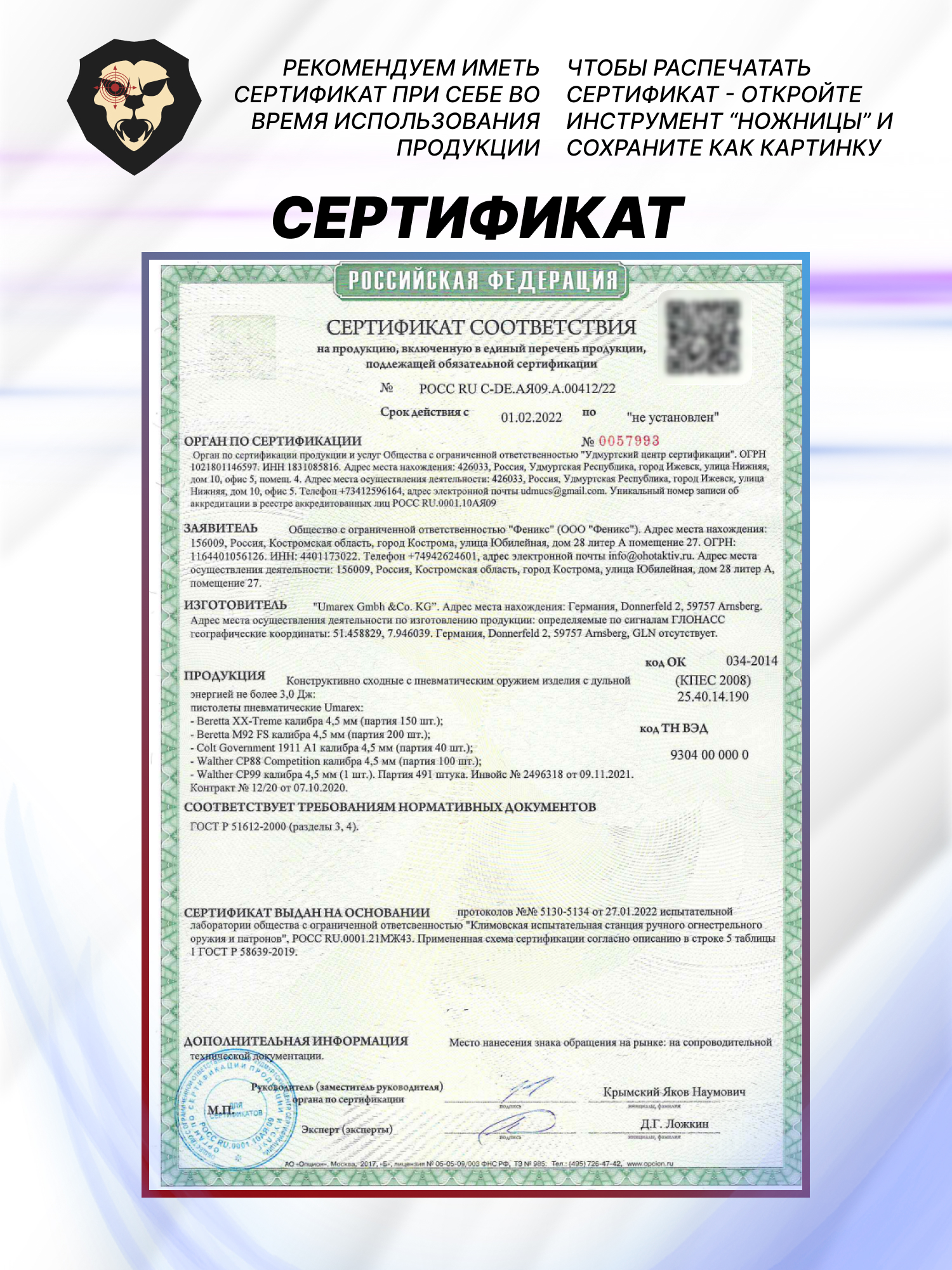| Комплектация | Пистолет, 2 барабанных магазина, шестигранный ключ, упаковка, краткая документация, копия сертификата (по запросу покупателя) |