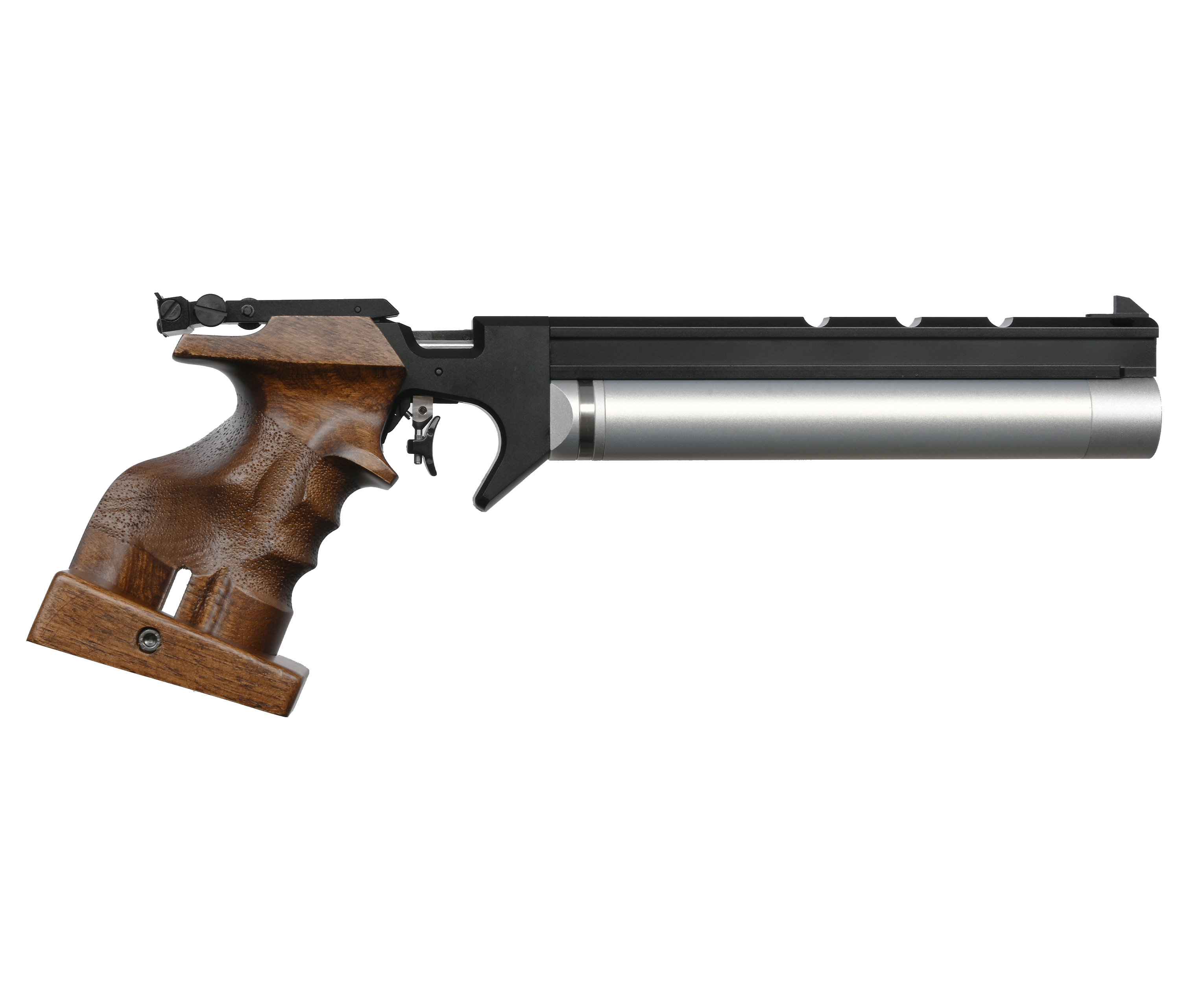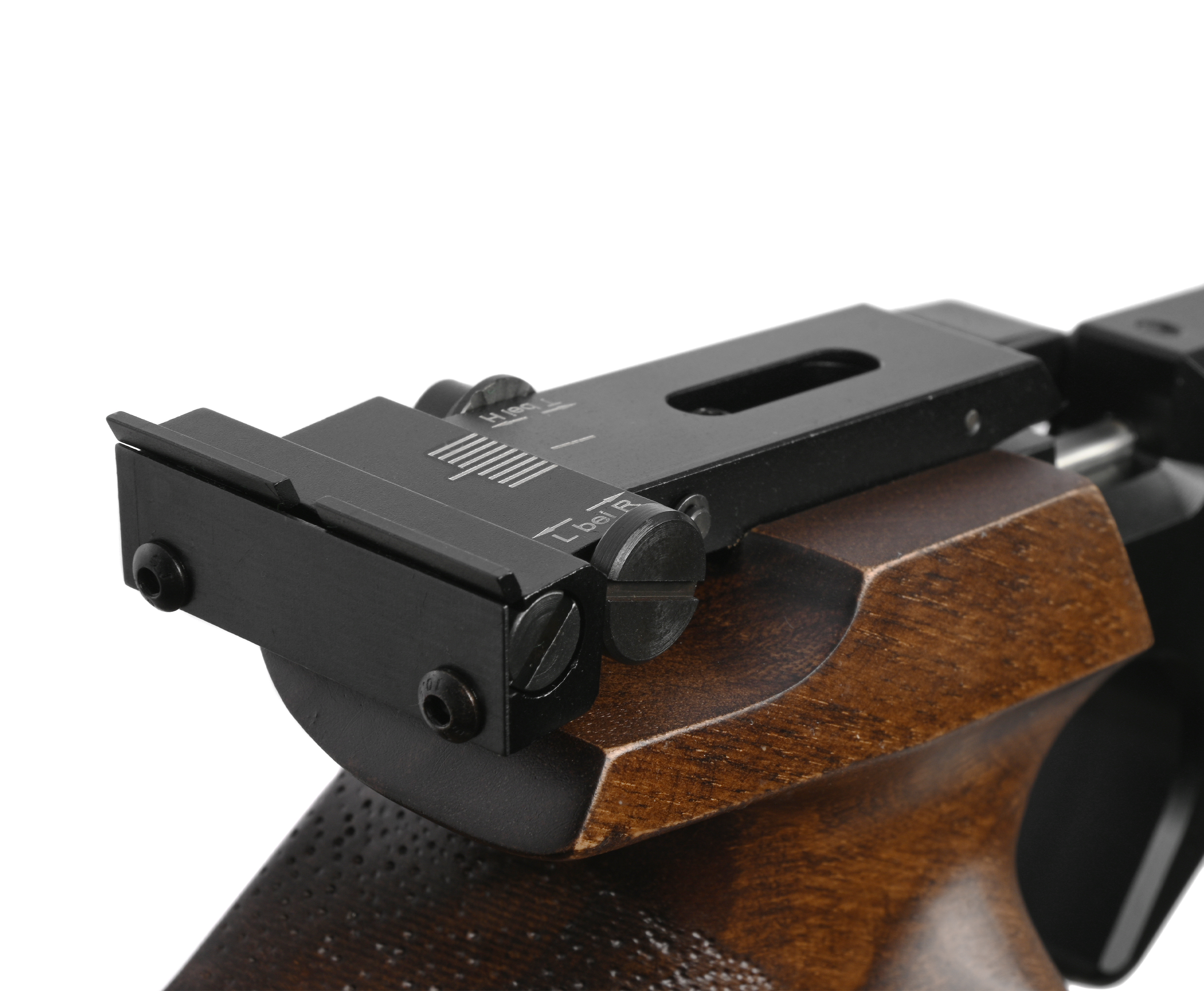 Образец предназначен для дисциплин, где упражнения выполняют на олимпийской дистанции - 10 метров. Оружие в них удерживается вытянутой рукой - для комфорта пребывания в такой стойке модель оснастили анатомической рукояткой со специальным упором под тыльную часть ладони. Элемент выполнили из бука, что обеспечило долговечность и достойный вид детали.