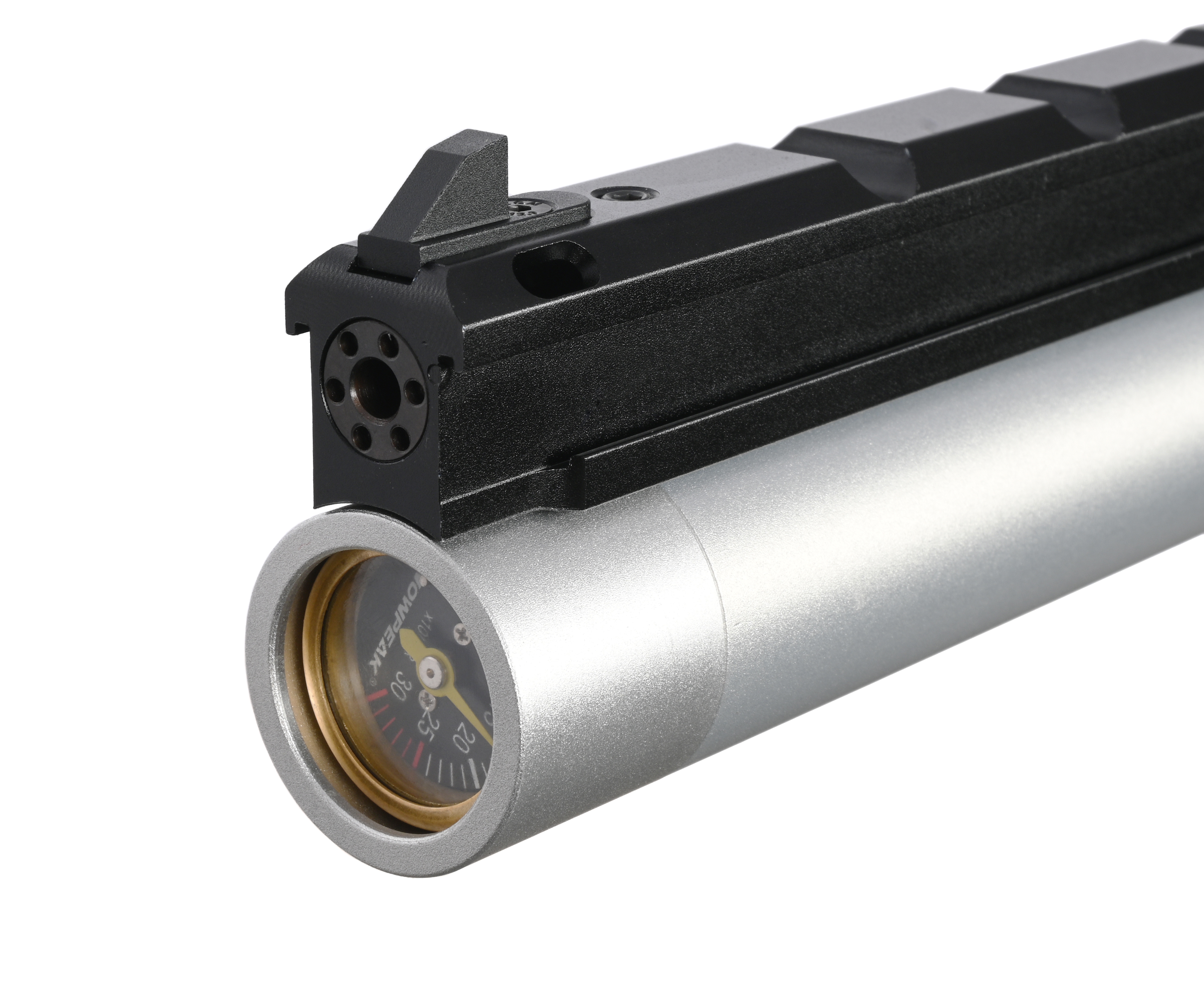 При наполнении ресиверов следует помнить, что параметр рабочего давления составляет 200 Бар. Отследить текущий показатель можно по встроенному в фронтальную часть резервуара ЗР Армс манометру. В комплекте с моделью присутствует два переходника под разные типы заправочного оборудования.