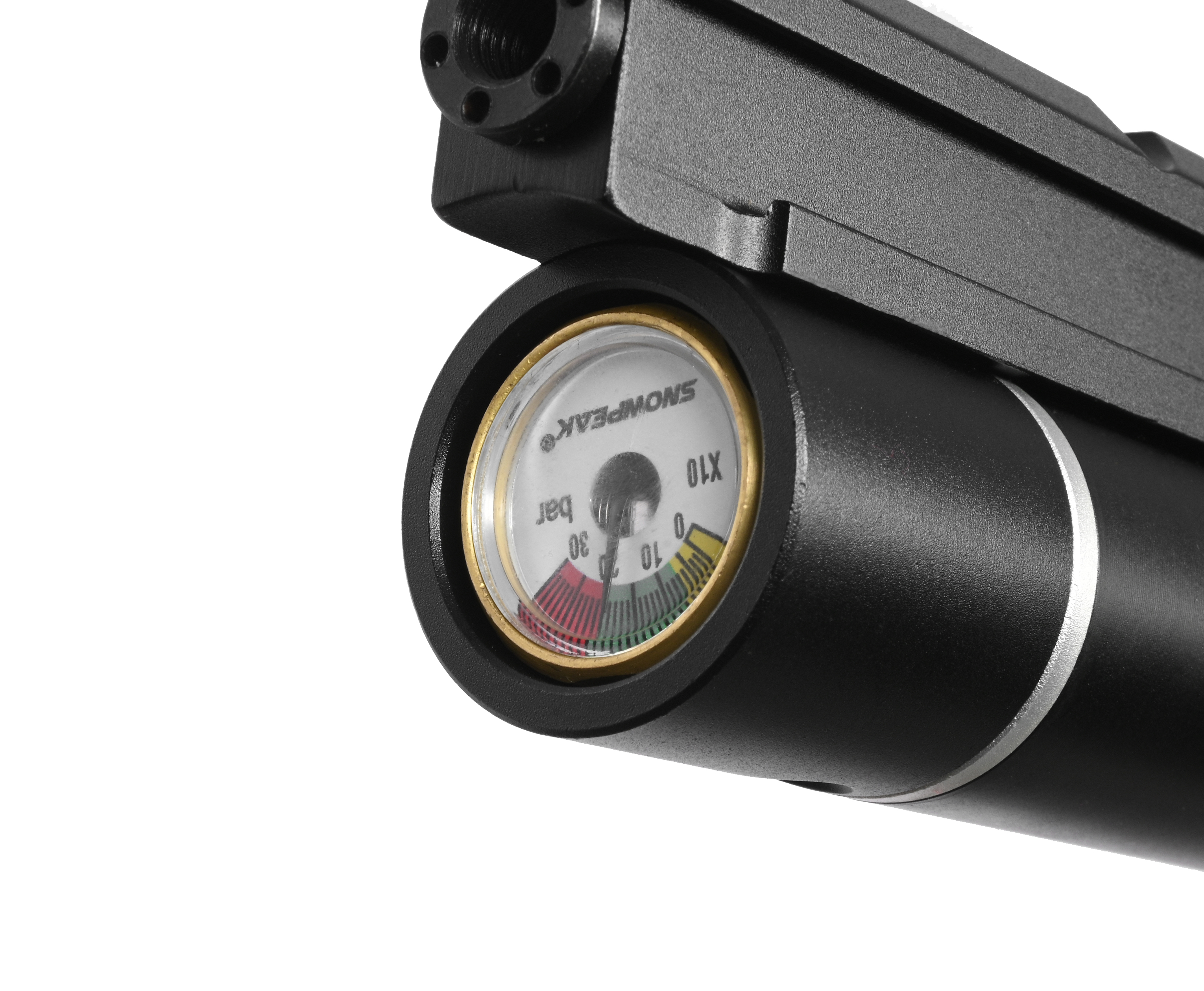 Заявленный объем последнего - 72 кубических сантиметра. Для закачки газа потребуются ручные или электрические насосы ВД, подключаемые к заправочному порту при помощи переходного комплектного штуцера. В торцевую часть изготовитель вмонтировал стрелочный манометр, глядя на показания которого определяется текущее давление в системе.