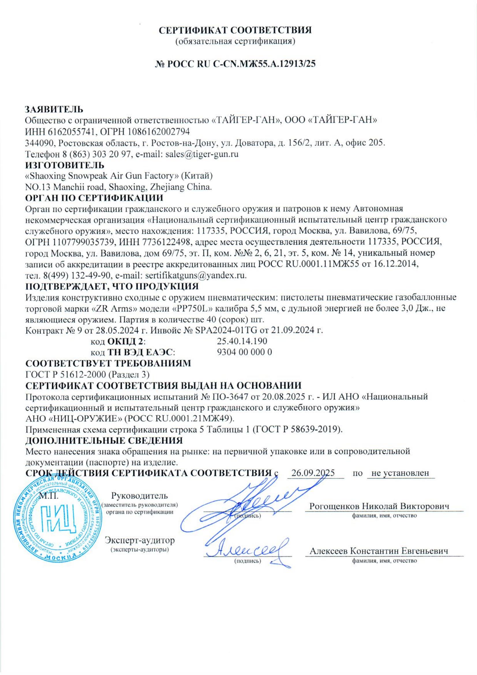 | Комплектация | Пистолет, магазин, упаковка, заправочный штуцер, ЗИП, краткая документация, копия сертификата (по запросу покупателя) |