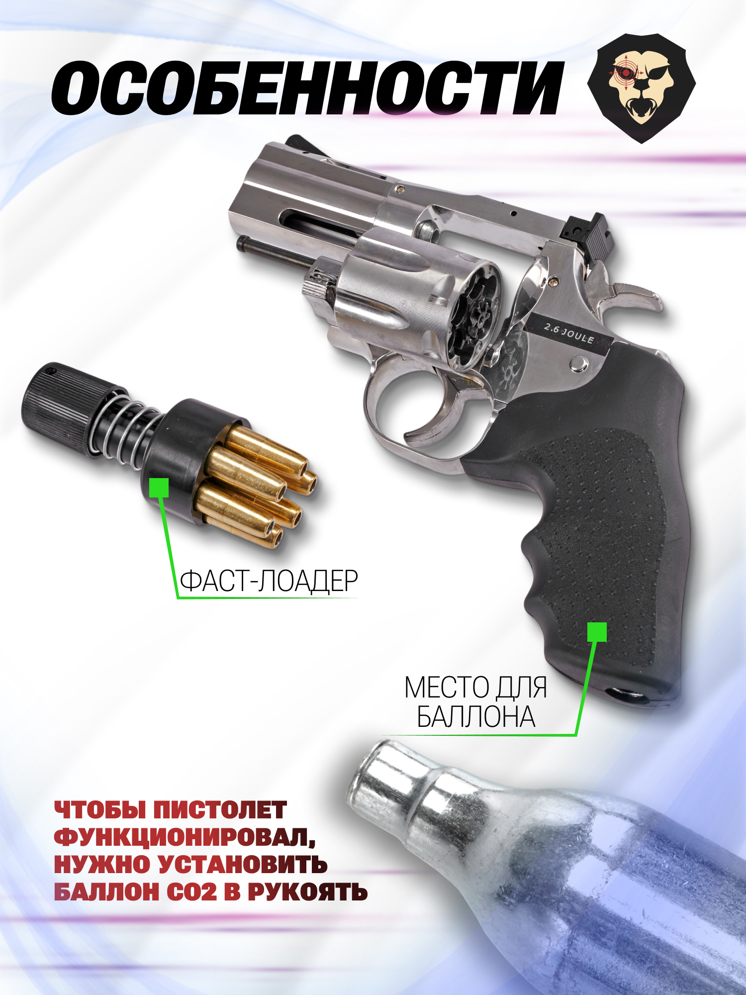 Револьвер АСГ собран из деталей, выполненных из металла. В обозреваемой конфигурации поверхность имеет серебристый окрас. Для комфортного обращения рукоятка дополнена выемками под пальцы, что вкупе с резиновым покрытием исключает скольжение ладони.