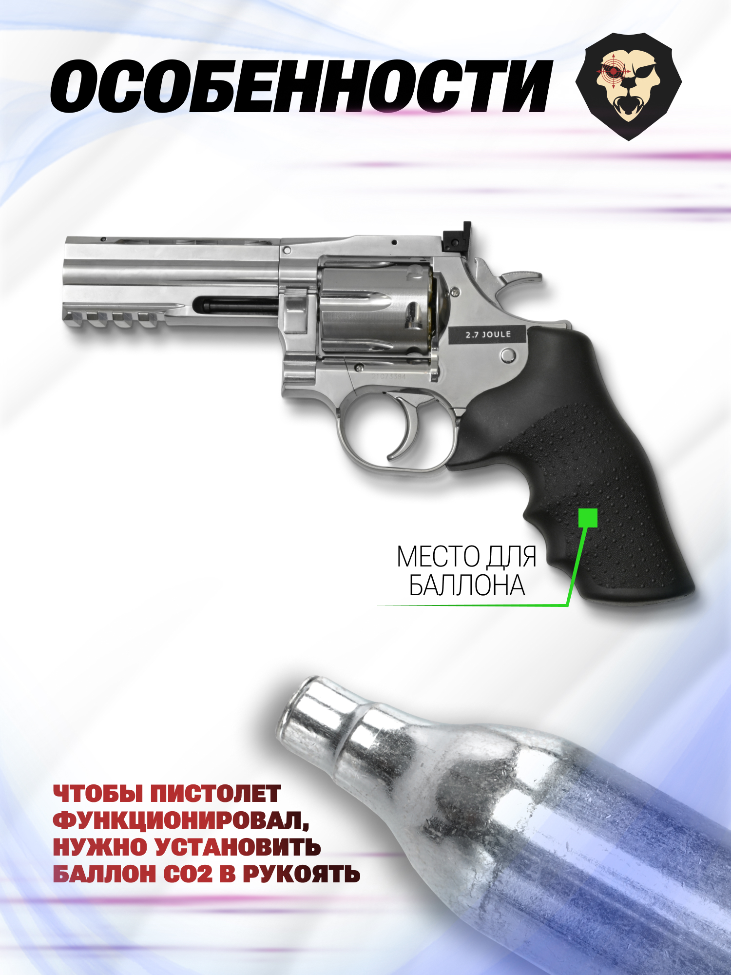 Для функционирования револьвера также понадобится разместить баллончик 12 грамм CO2 в соответствующем отсеке. Отделение находится в полости рукояти под съемной накладкой. Сменный резервуар укладывается внутрь и поджимается винтом до появления шипящего звука травления газа в момент накола носовой части.