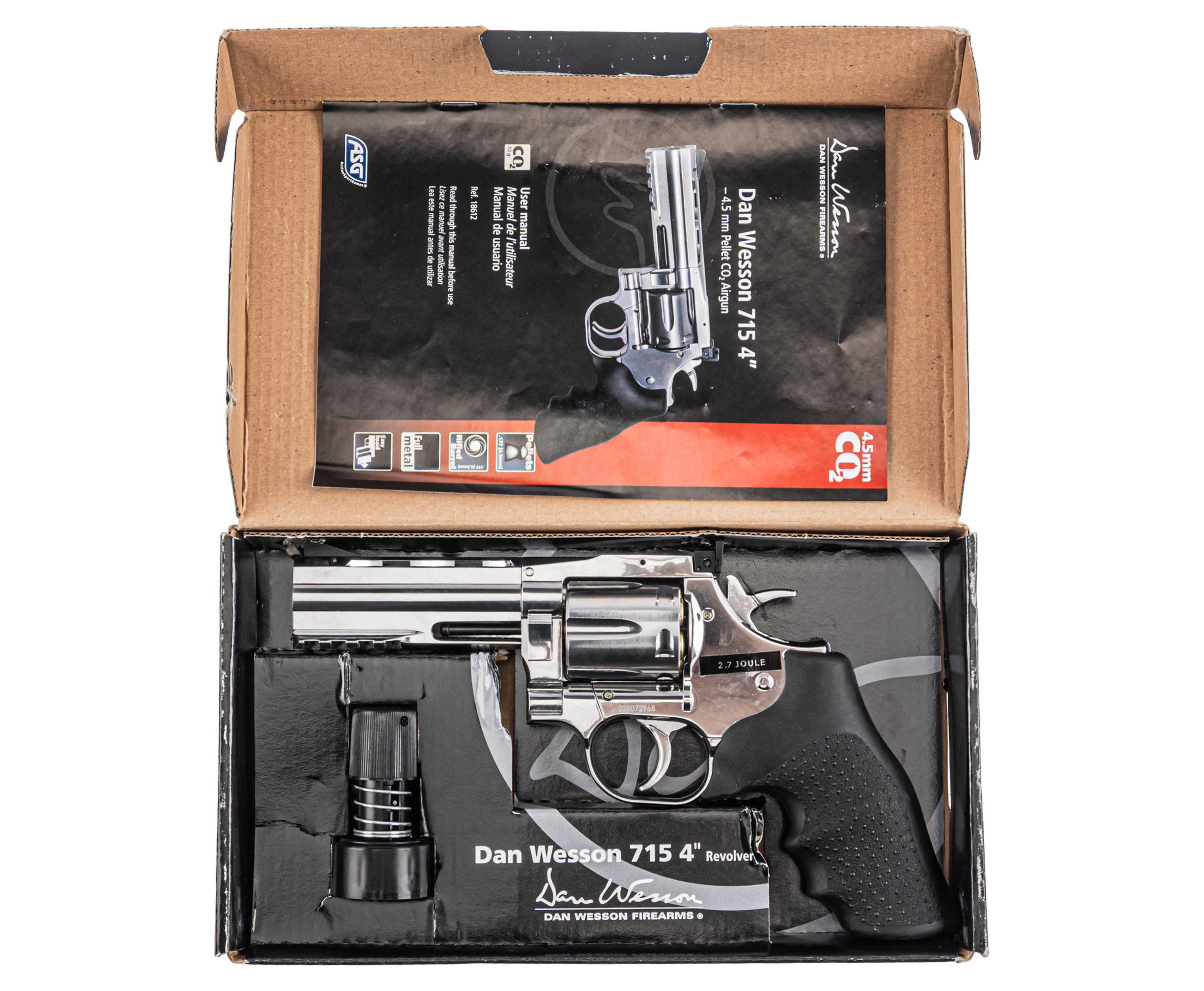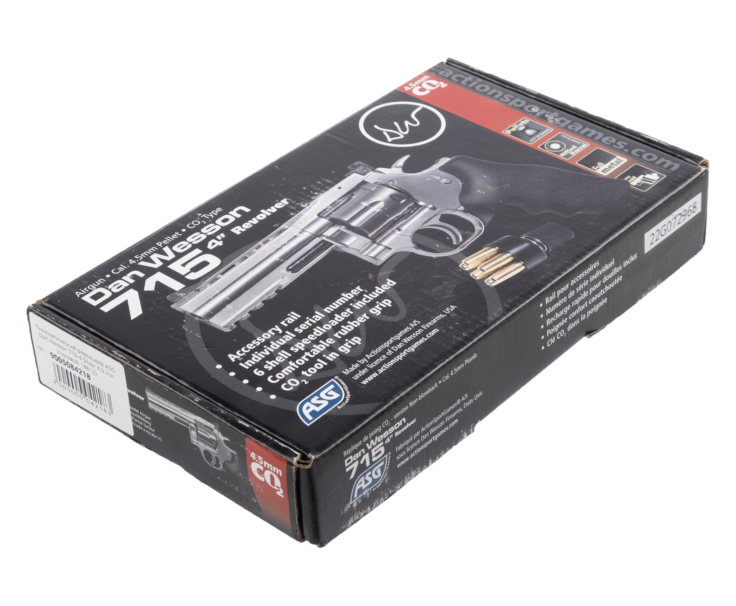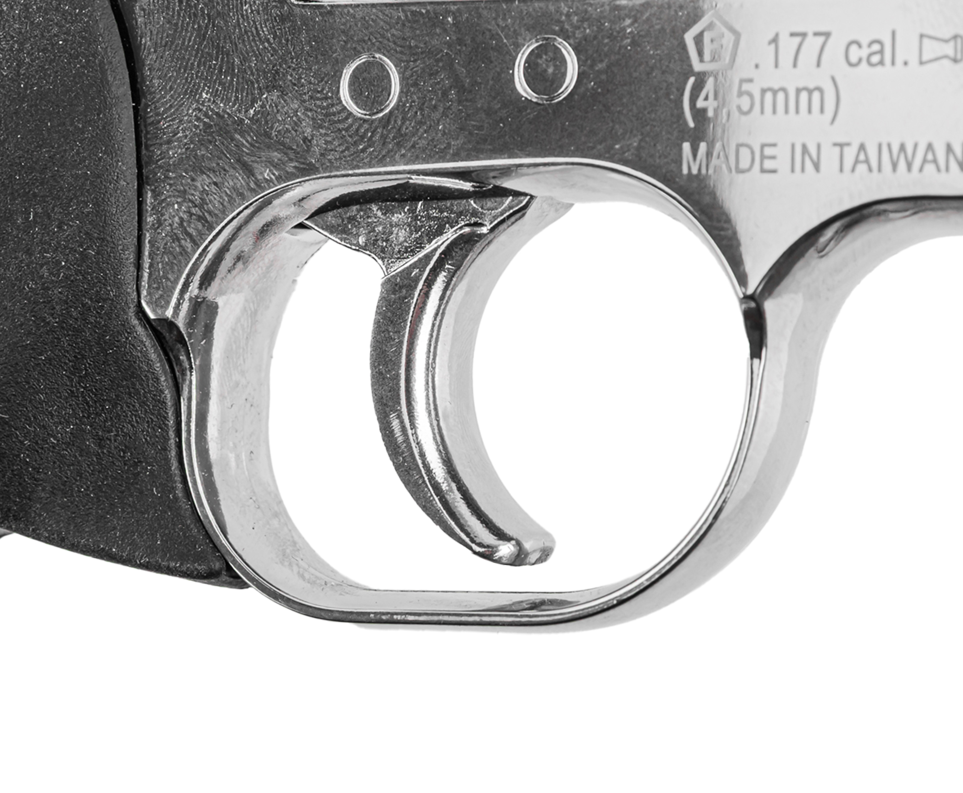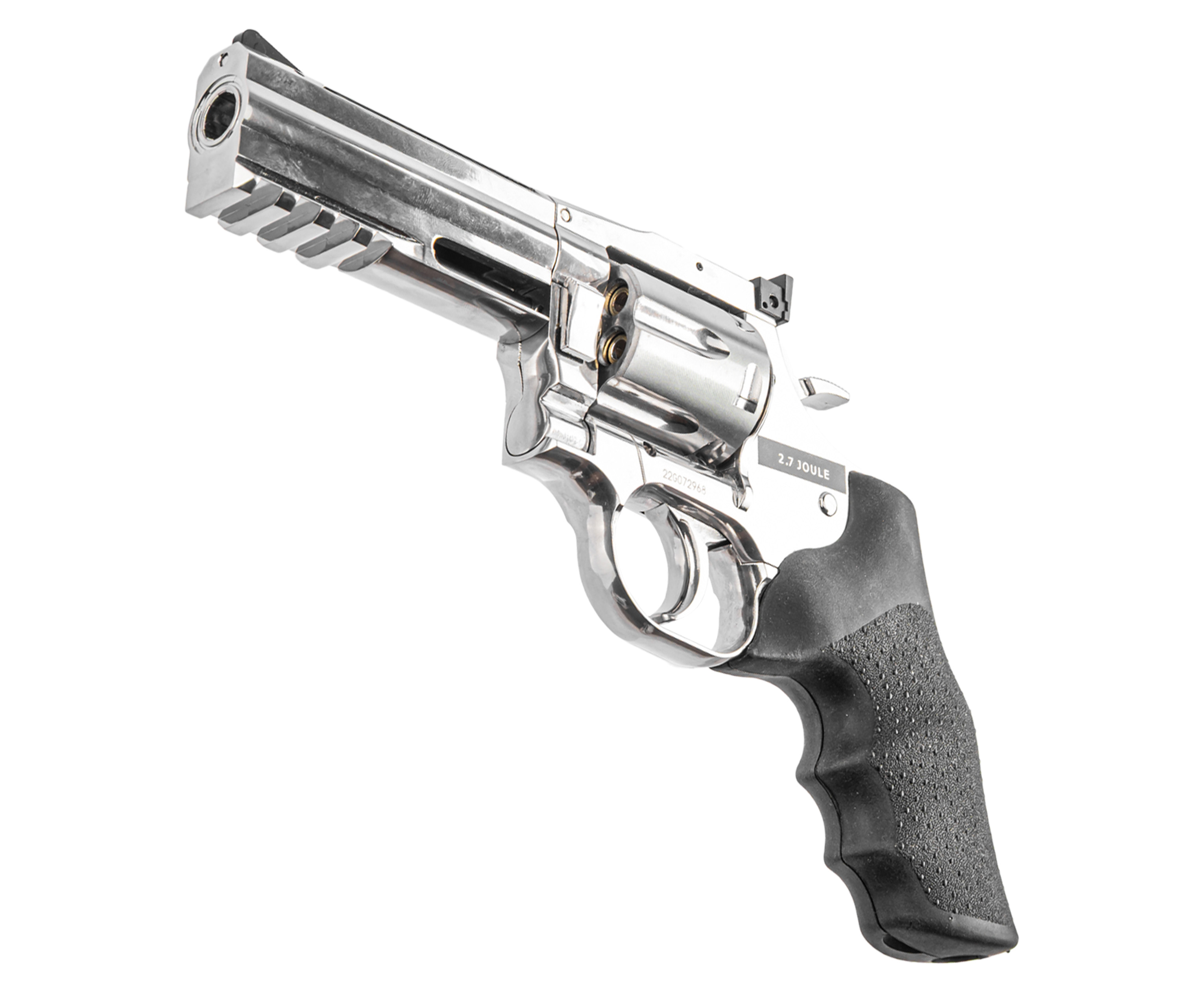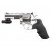 Крепление заворачивается шестигранником, встроенным в откидную накладку, что исключает утерю инструмента. Пневматический револьвер ASG 715-4 Dan Wesson выполнен из металла с серебристым покрытием под хром. Рукоять для удобства удержания обрезинена и дополнена подпальцевыми выемками, что вкупе предотвращает скольжение.
