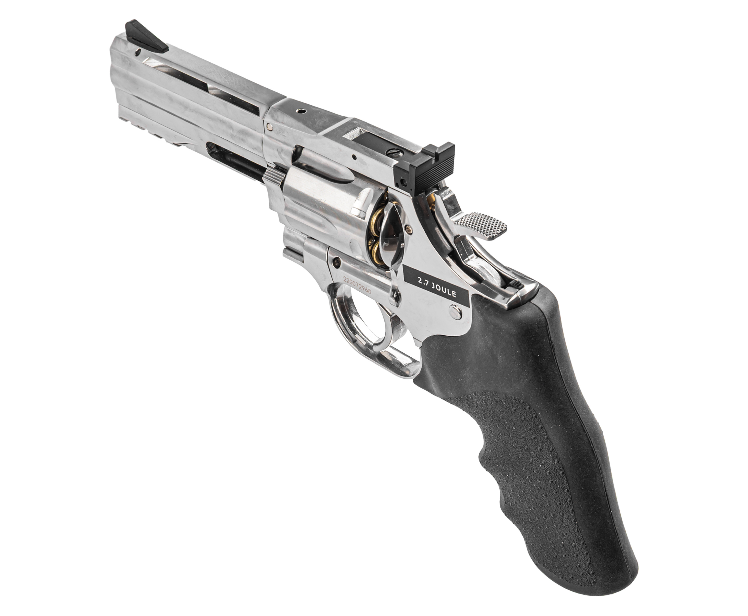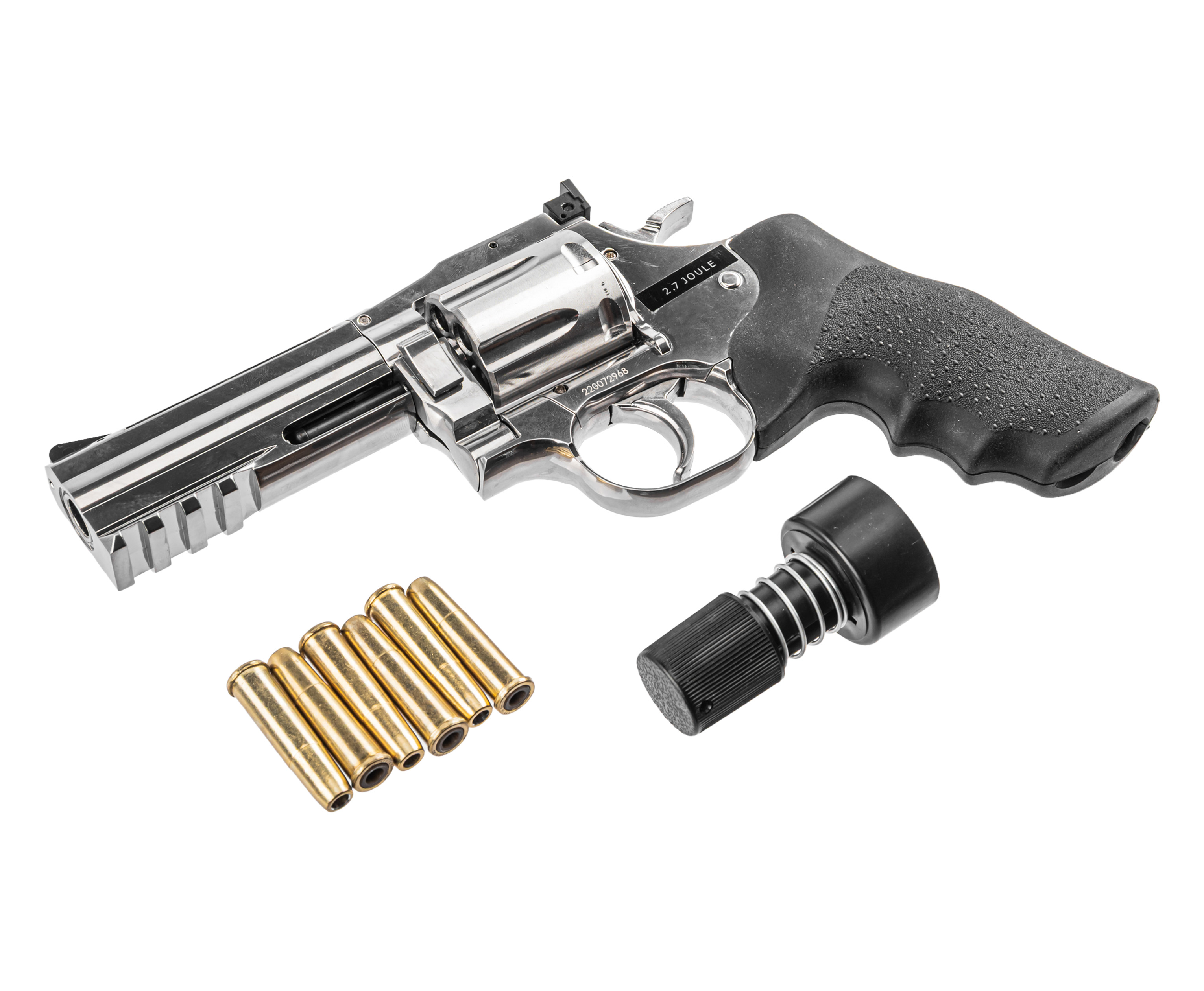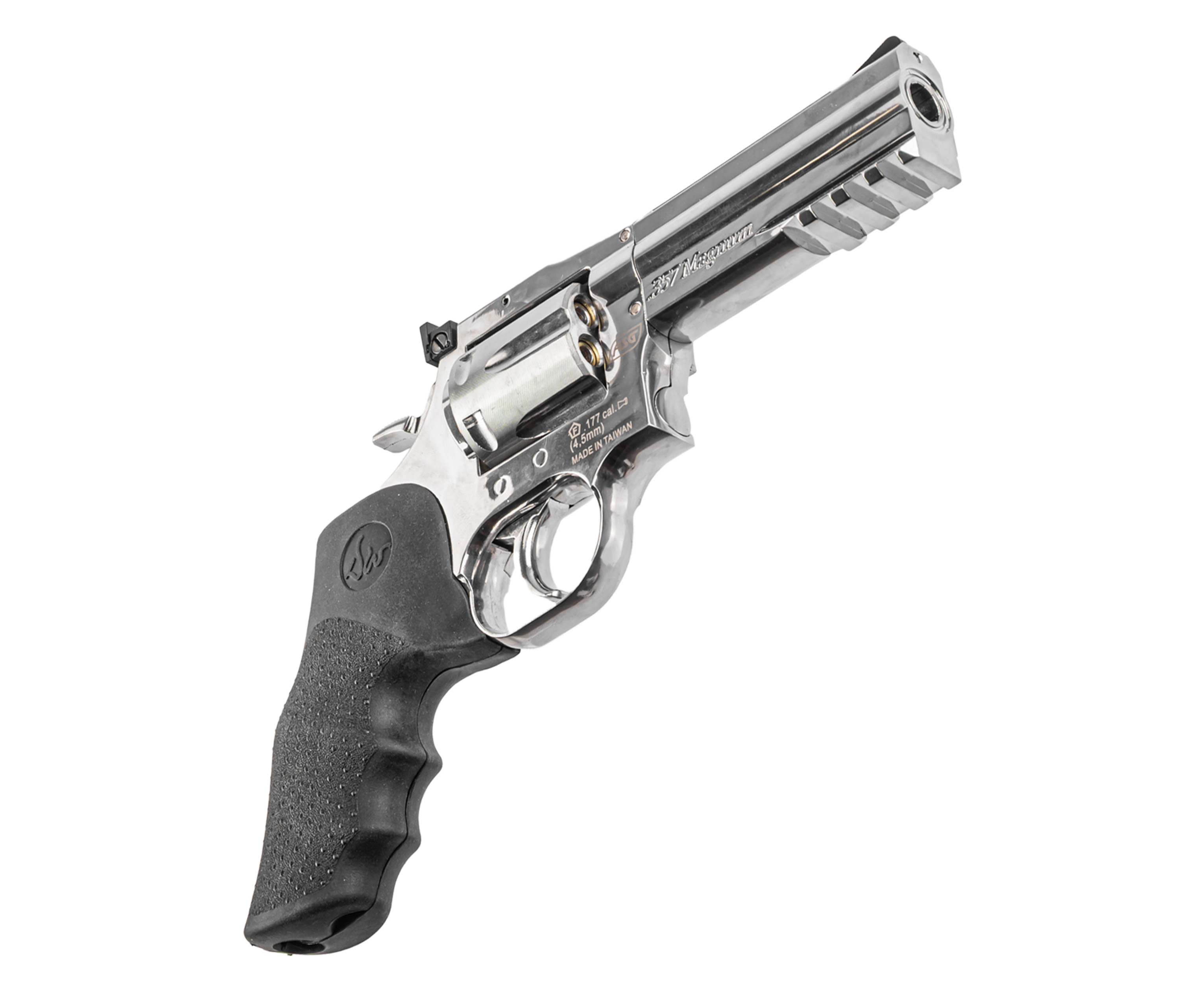 Крепление заворачивается шестигранником, встроенным в откидную накладку, что исключает утерю инструмента. Пневматический револьвер ASG 715-4 Dan Wesson выполнен из металла с серебристым покрытием под хром. Рукоять для удобства удержания обрезинена и дополнена подпальцевыми выемками, что вкупе предотвращает скольжение.