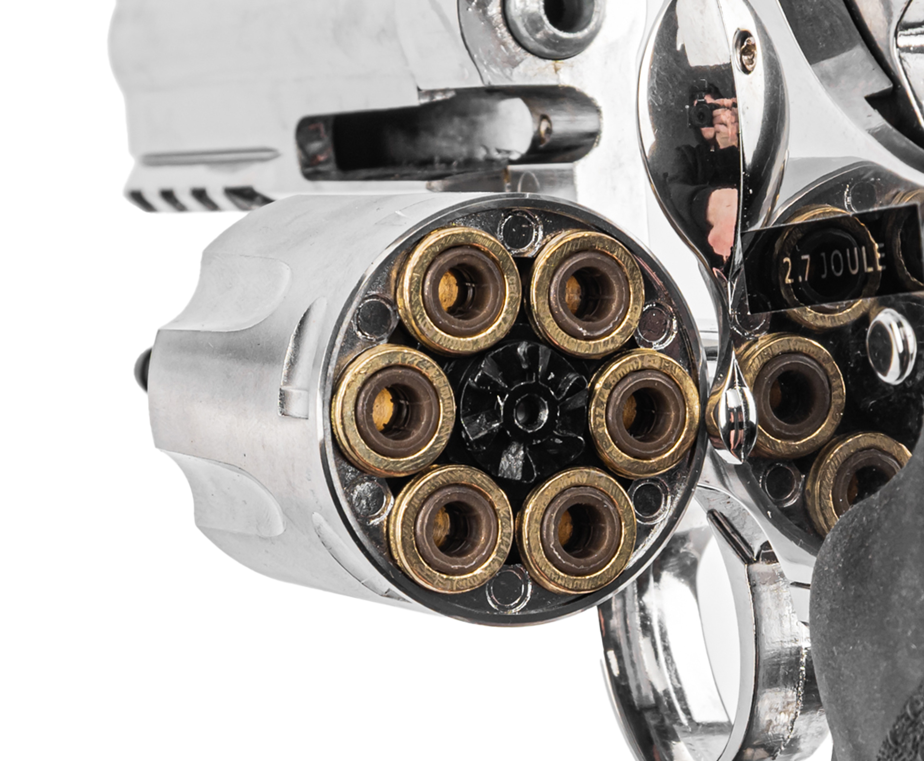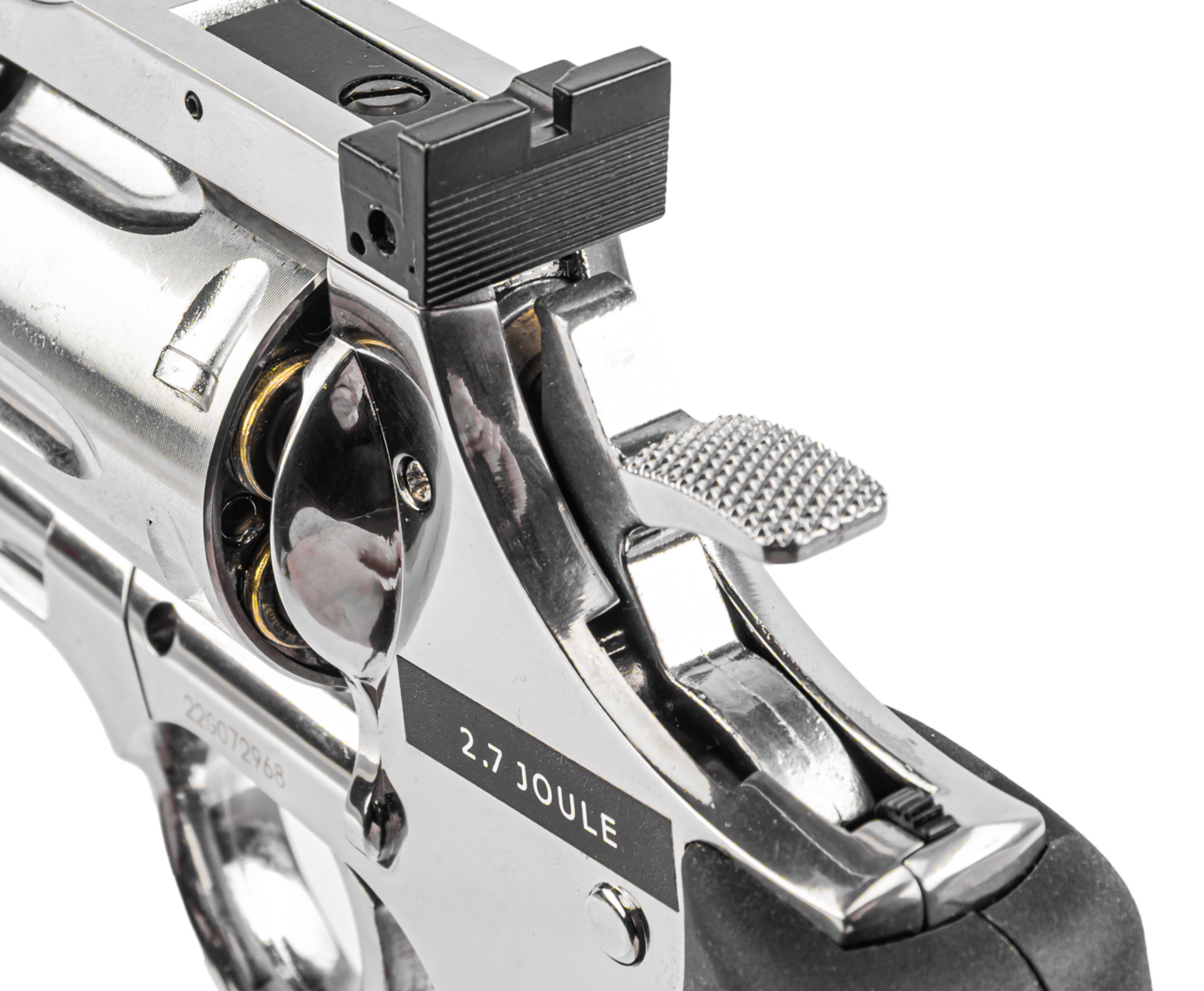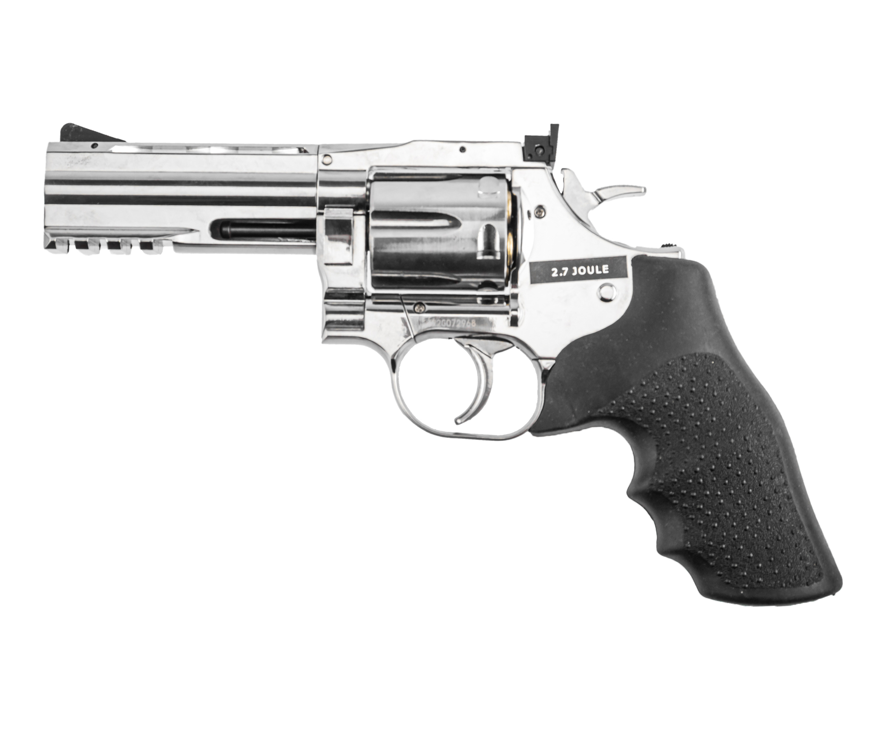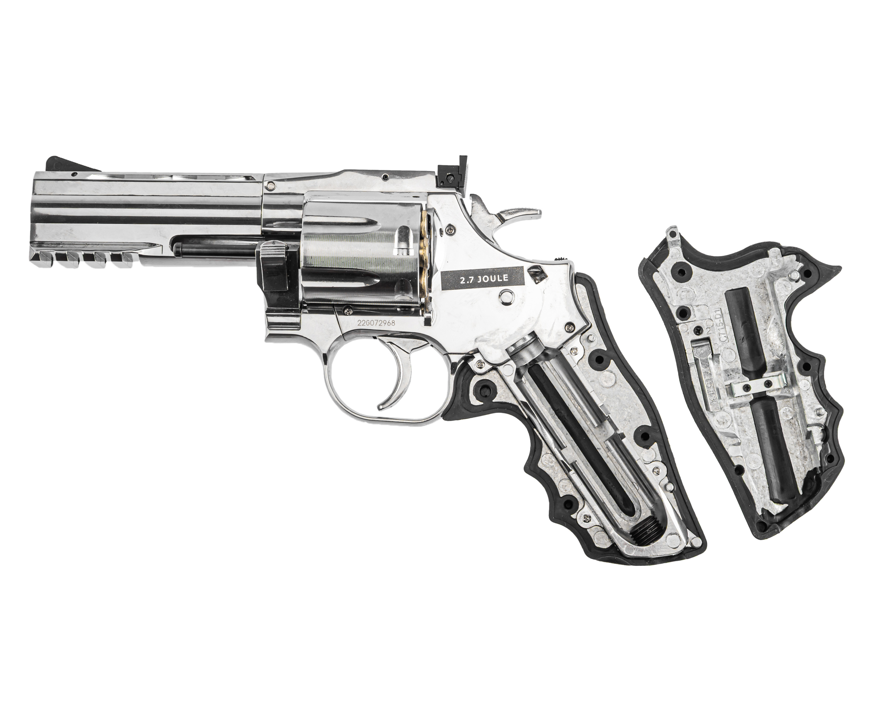 Крепление заворачивается шестигранником, встроенным в откидную накладку, что исключает утерю инструмента. Пневматический револьвер ASG 715-4 Dan Wesson выполнен из металла с серебристым покрытием под хром. Рукоять для удобства удержания обрезинена и дополнена подпальцевыми выемками, что вкупе предотвращает скольжение.