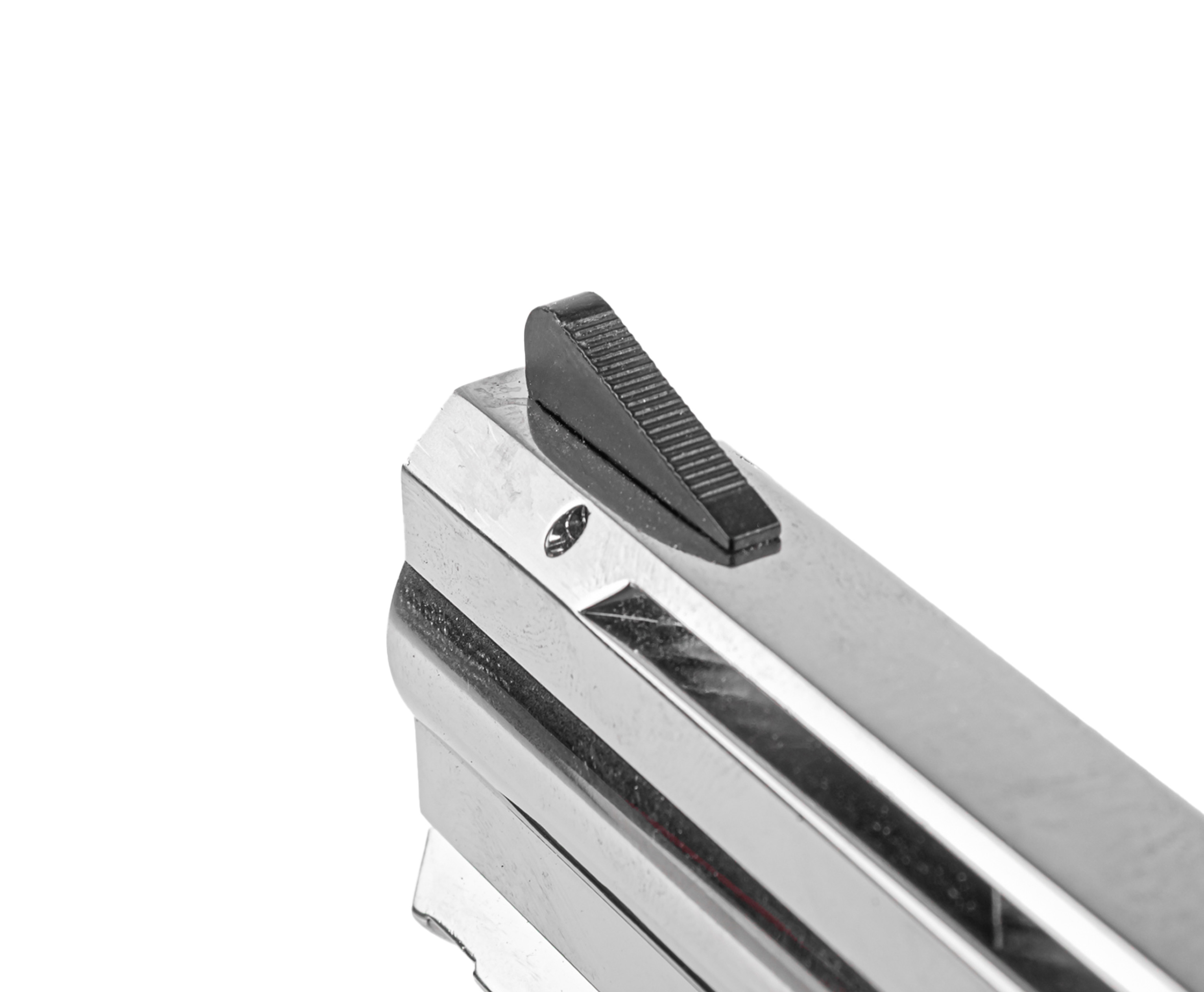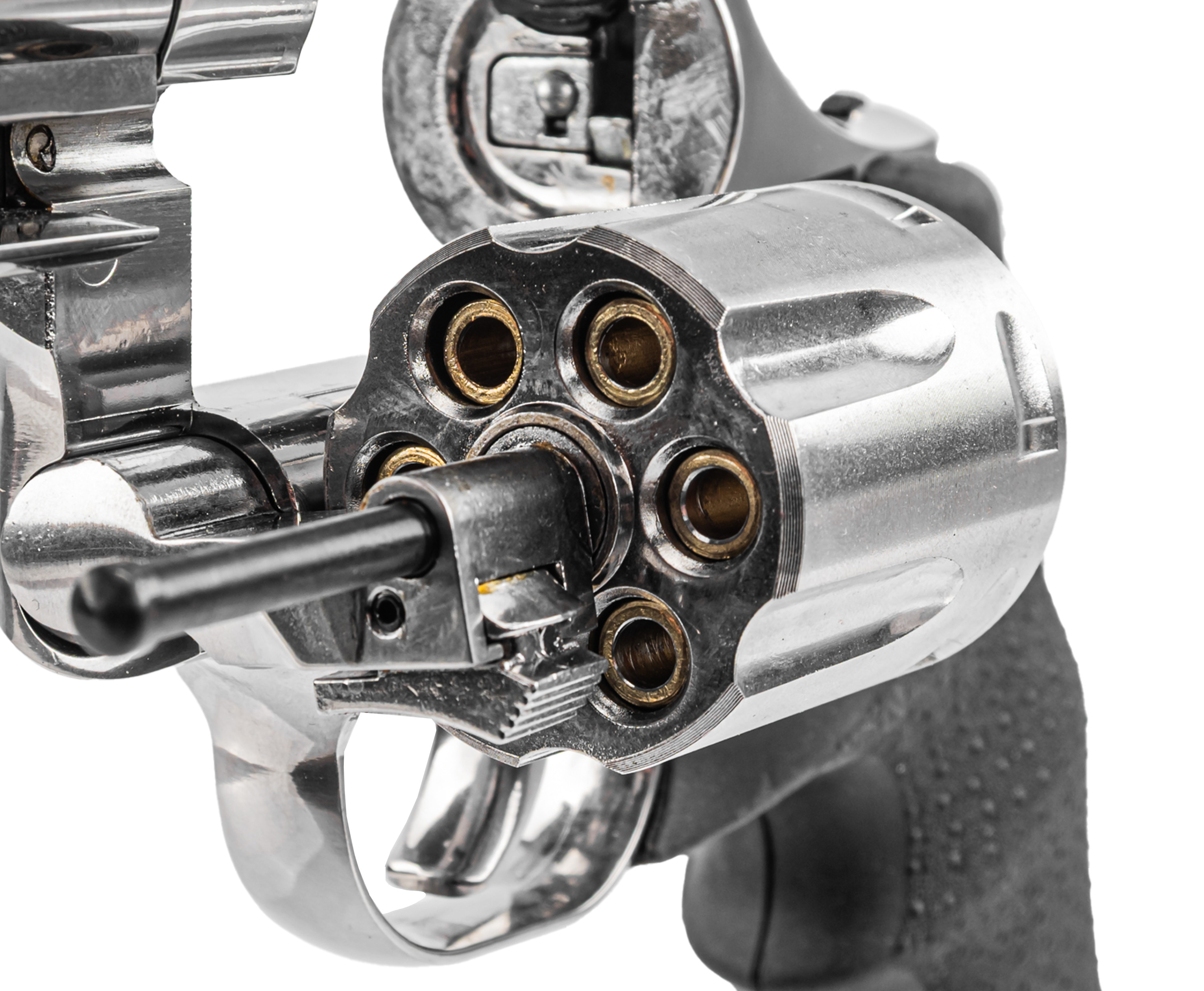После стрельбы опустошение камор выполняется нажатием на специальный экстрактор. В конструкции ASG Dan Wesson ось барабана смещается в левую сторону. Для этого потребуется отжать фиксатор - последний расположен с левой стороны рамы у основания ствола.
