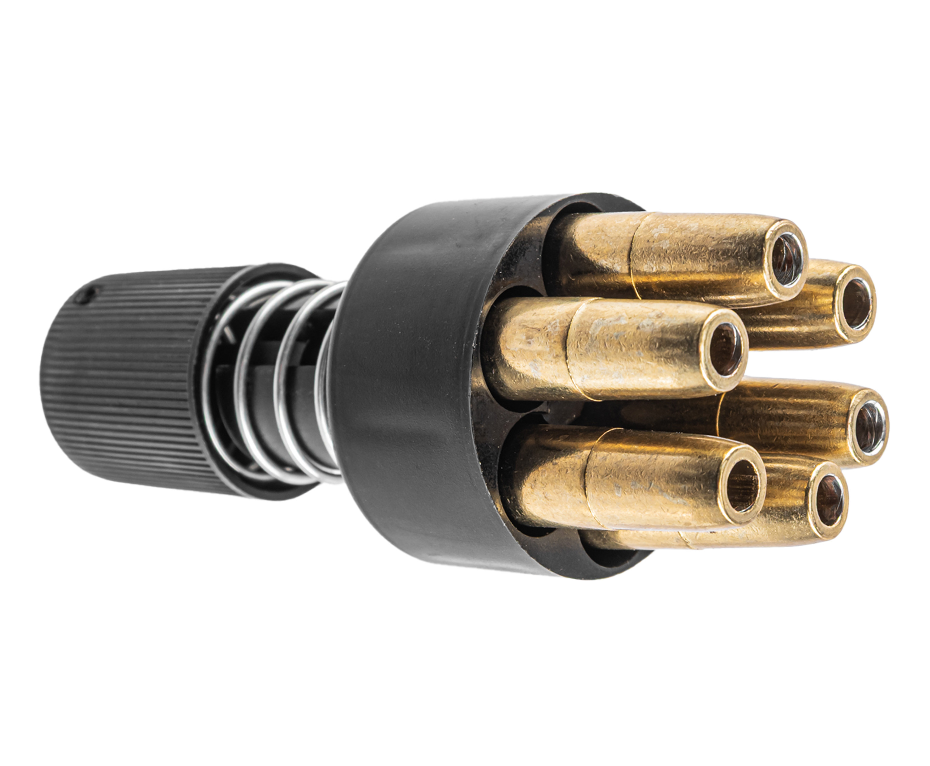 Таким образом, цикл заряжания получился максимально аутентичным. Барабан, вмещающий шесть картриджей, заполняется вручную или посредством специального ускорителя. Приспособление поставляется в комплекте и представляет собой лоадер для заряжания сразу всех ячеек одновременно.