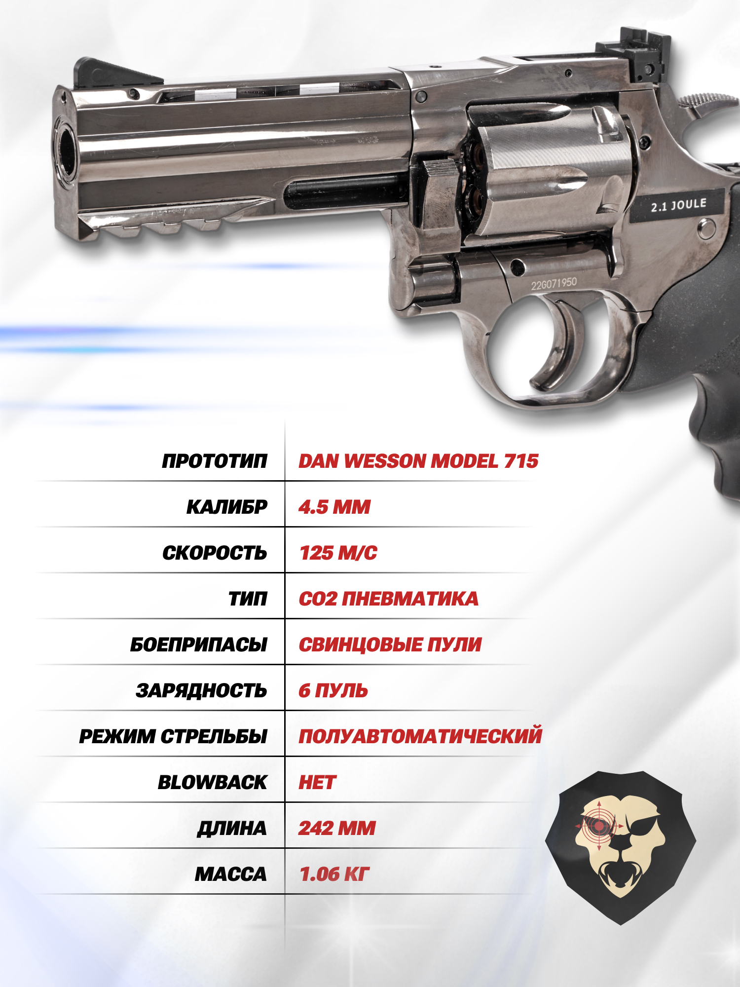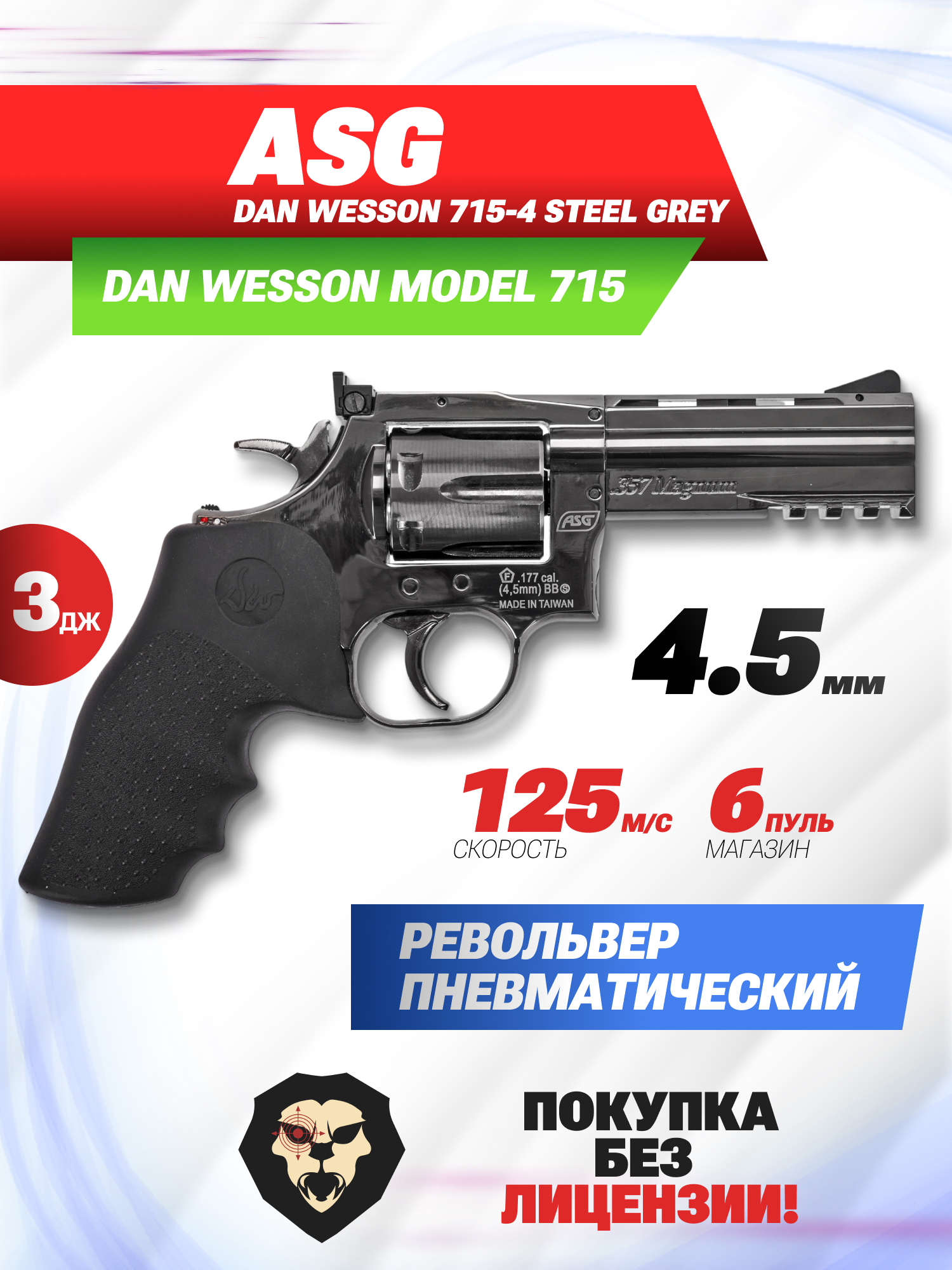 Револьверы АСГ выпускаются с различным типом ствола. В рассматриваемой модели Dan Wesson 715-4 Steel Grey установлен бланк с гладким каналом, следовательно, образец рассчитан на стрельбу шариками BB. Их скорость достигает показателя 125 метров в секунду. При этом мощность экземпляра не превышает разрешенного законом РФ значения в 3 Дж, ввиду чего для покупки не понадобится лицензия - достаточно быть старше восемнадцати лет.