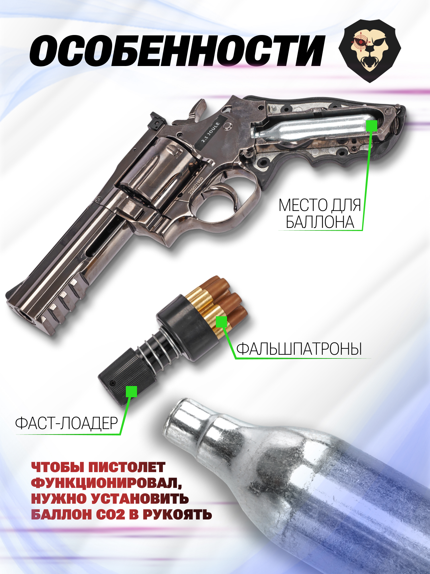 На разгон боеприпасов по каналу ствола в момент выстрела расходуется углекислый газ. Исходя из этого, потребуется предварительно установить одноразовый сменный баллон 12 грамм CO2 в полость рукояти. После размещения в отсеке необходимо затянуть поджимной винт - шестигранный ключ встроен в съемную боковую накладку.