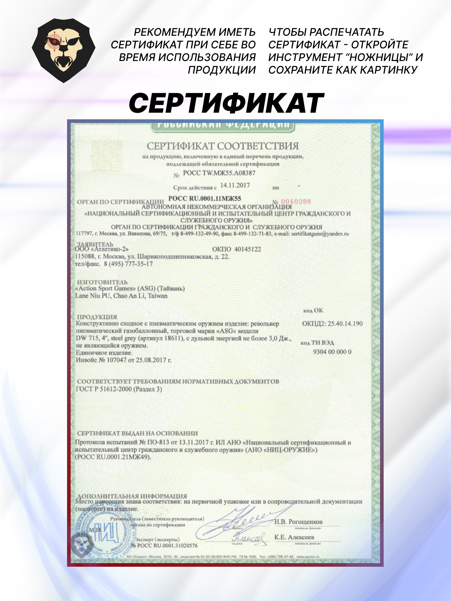 | Комплектация | Пистолет, фальшпатроны - 6 шт, ускоритель заряжания, упаковка, краткая документация, копия сертификата (по запросу покупателя) |