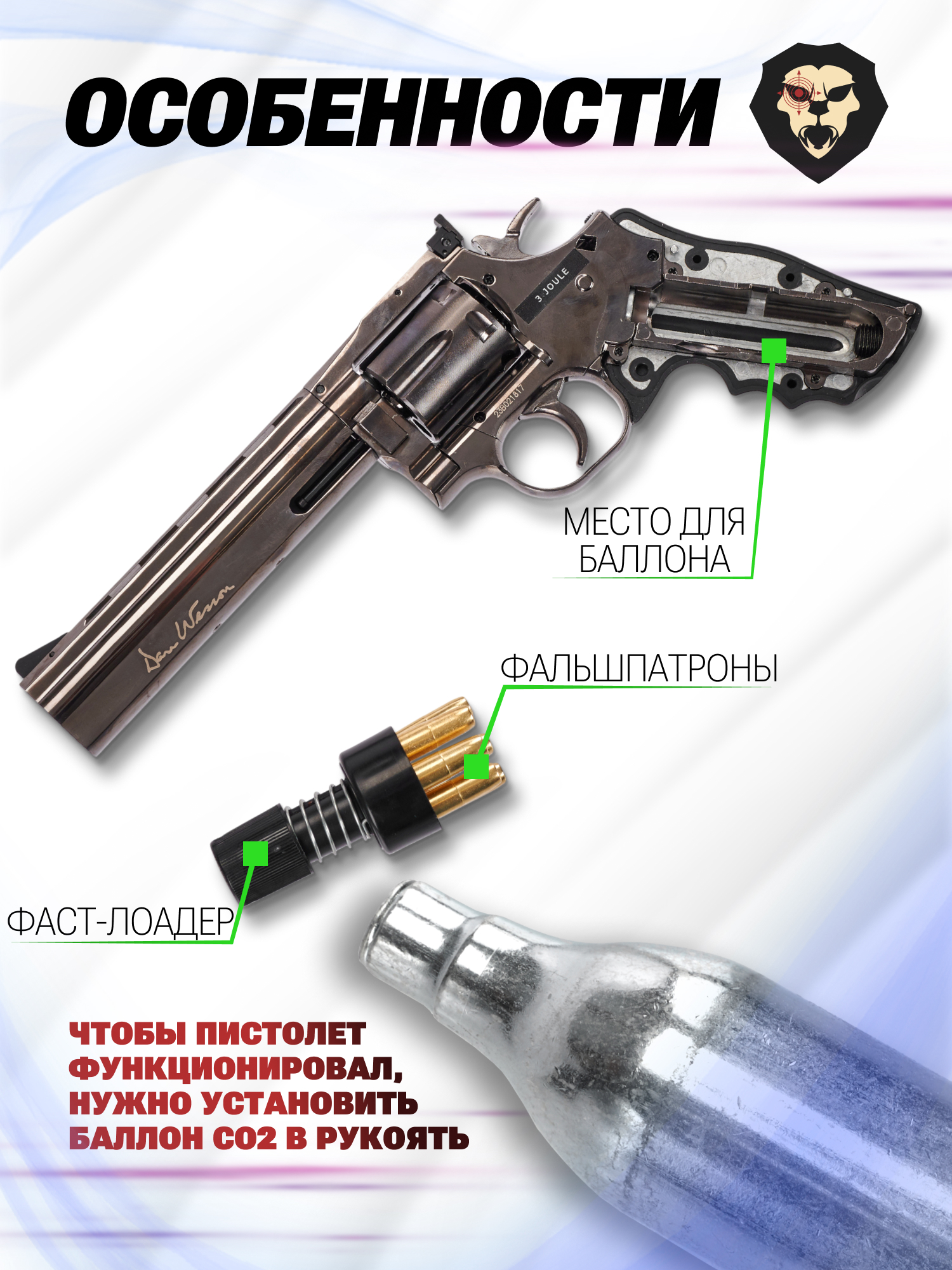 Нарезной ствол с внутренним диаметром 4.5 миллиметра предполагает использование воланчиковых боеприпасов из свинца калибра .177 - система заряжания через имитационные патроны в количестве шести штук добавляет реализма процессу подготовки к стрельбе. Комплектный быстрозарядник позволяет заполнить барабан за 2-3 секунды, а экстрактор для оперативного опустошения камор от гильз воспроизводит механику работы, как у боевого оружия.