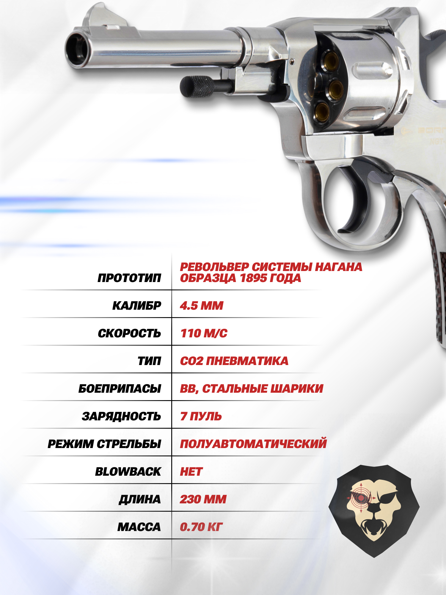 Пневматический револьвер Borner NGT-B 4.5 мм (Silver, Nagant) купить в интернет-магазине Popadiv10.