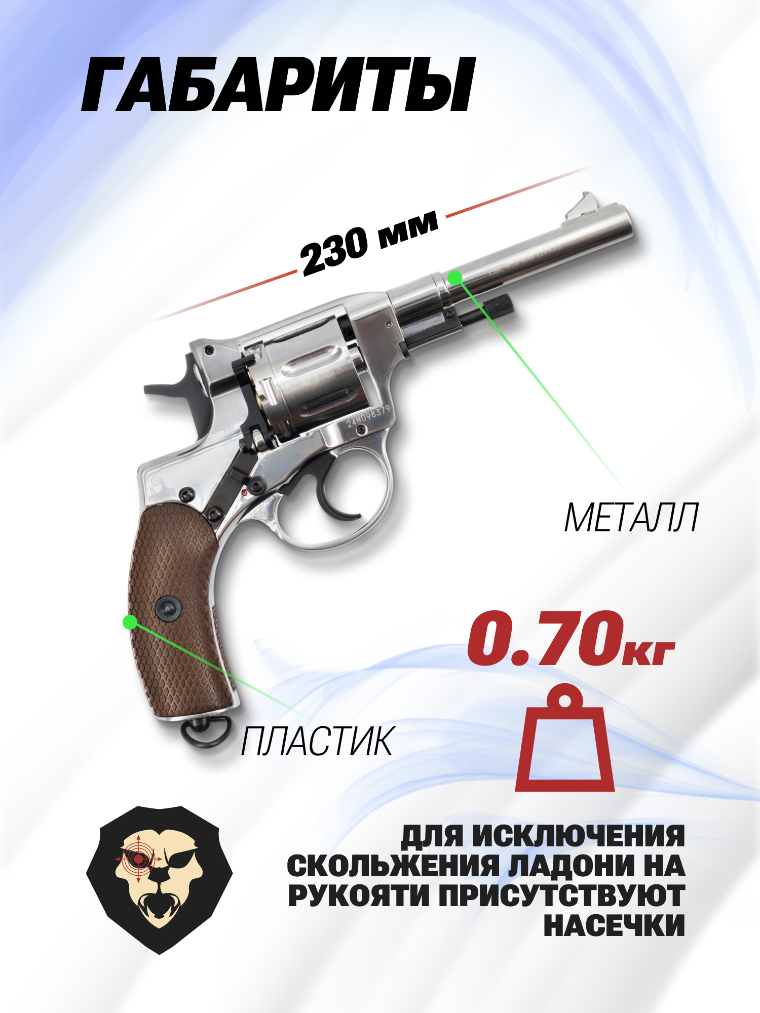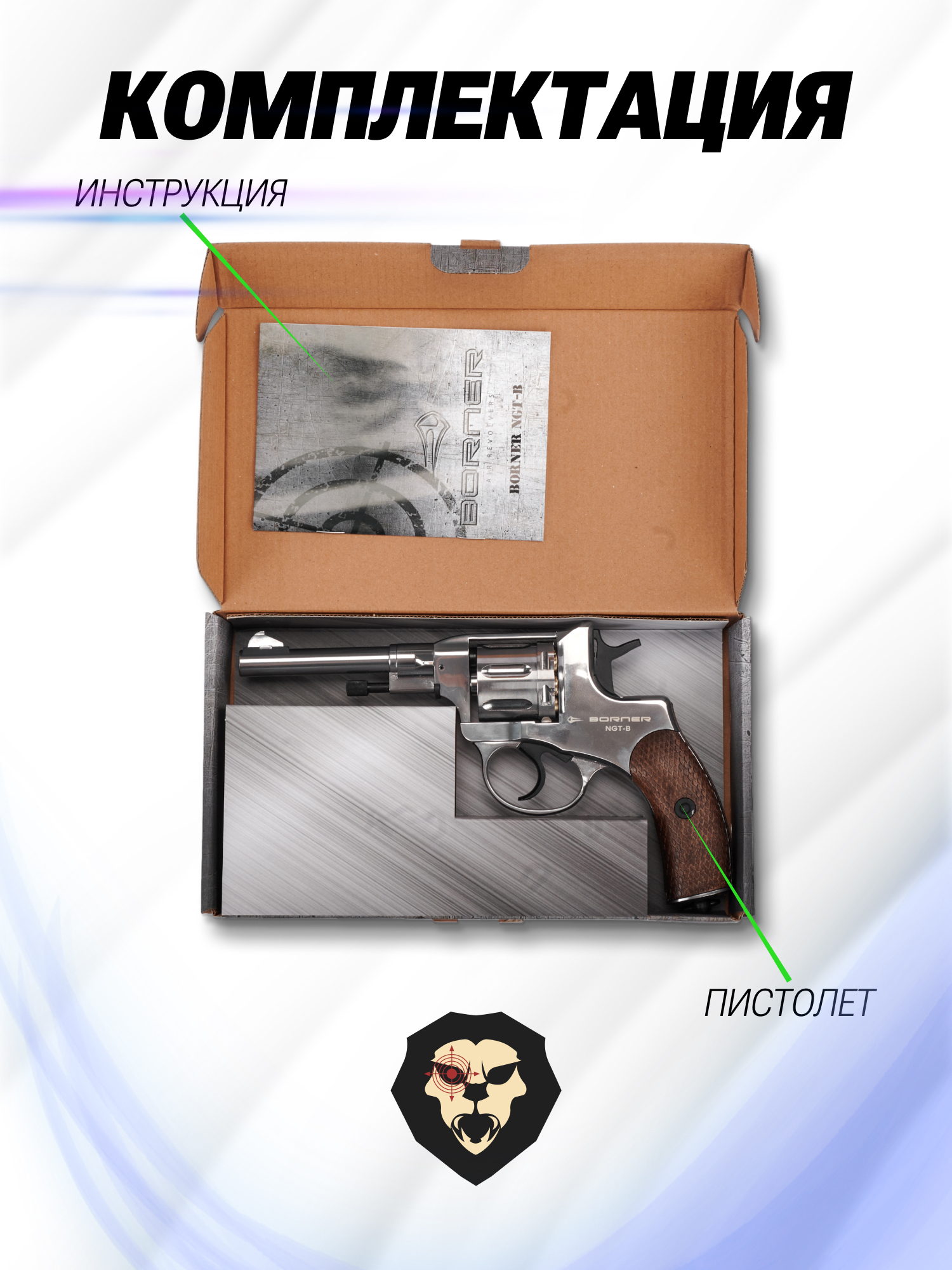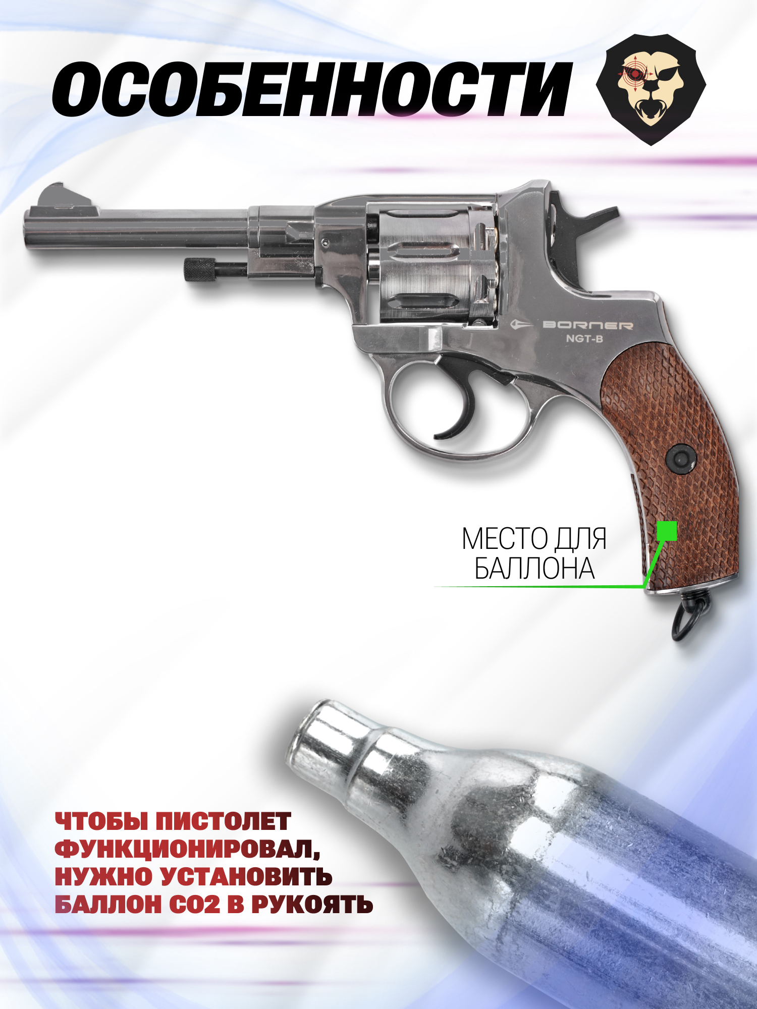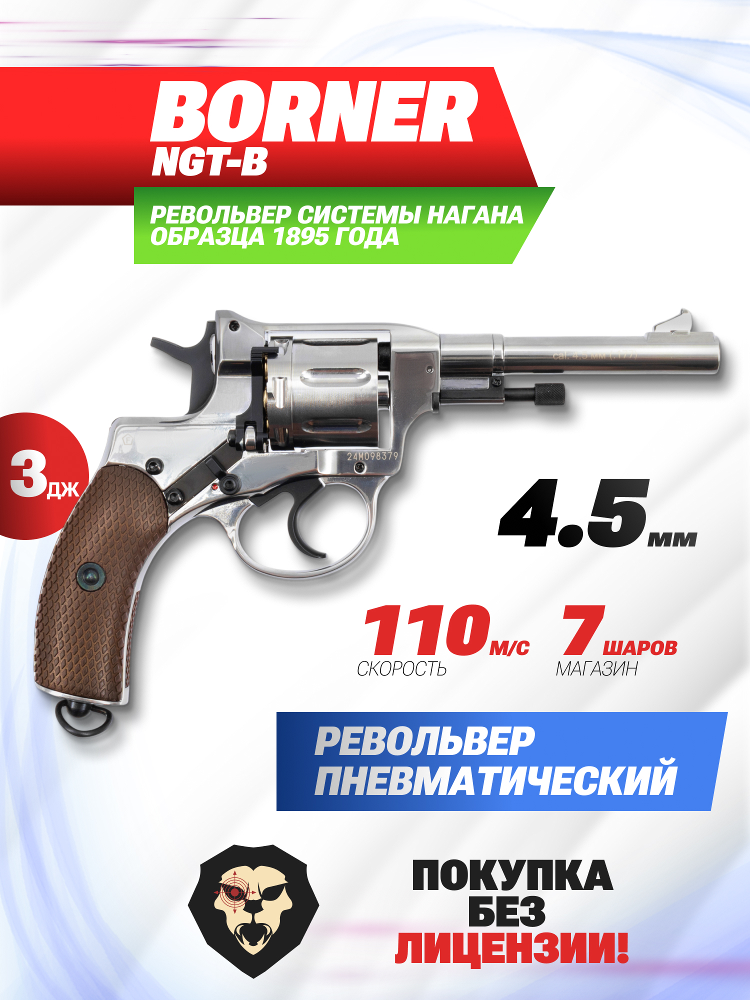 Информация о товаре "Пневматический револьвер Borner NGT-B 4.5 мм (Silver, Nagant)" носит ознакомительный характер, и не является публичной офертой, определяемой положениями Статьи 437 Гражданского кодекса Российской Федерации, характеристики, внешний вид, цвет и комплектация могут быть изменены производителем без уведомления.
