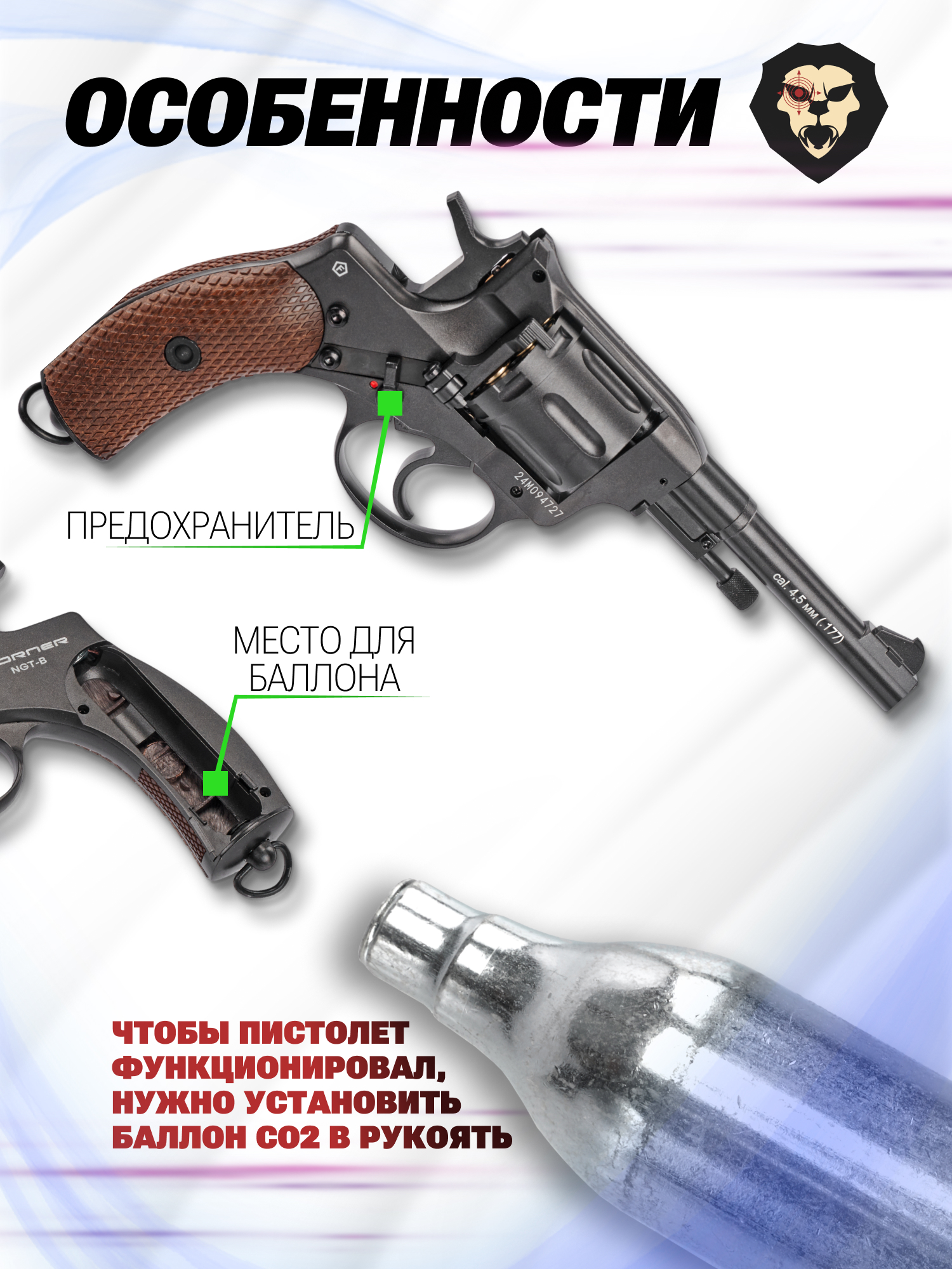 Оружие Наган револьвер озвученной фирмы относится к категории пневматики - снаряд, выпускаемый этим образцом, продвигается по стволу с помощью углекислоты. Причем скорость пульки составляет 110 метров в секунду - благодаря этому модель пригодна для любительской соревновательной стрельбы. В то же время изделие не относится к категории оружия за счет энергии меньше 3 Джоулей, в соответствии с чем предъявлять лицензию на его покупку не понадобится.