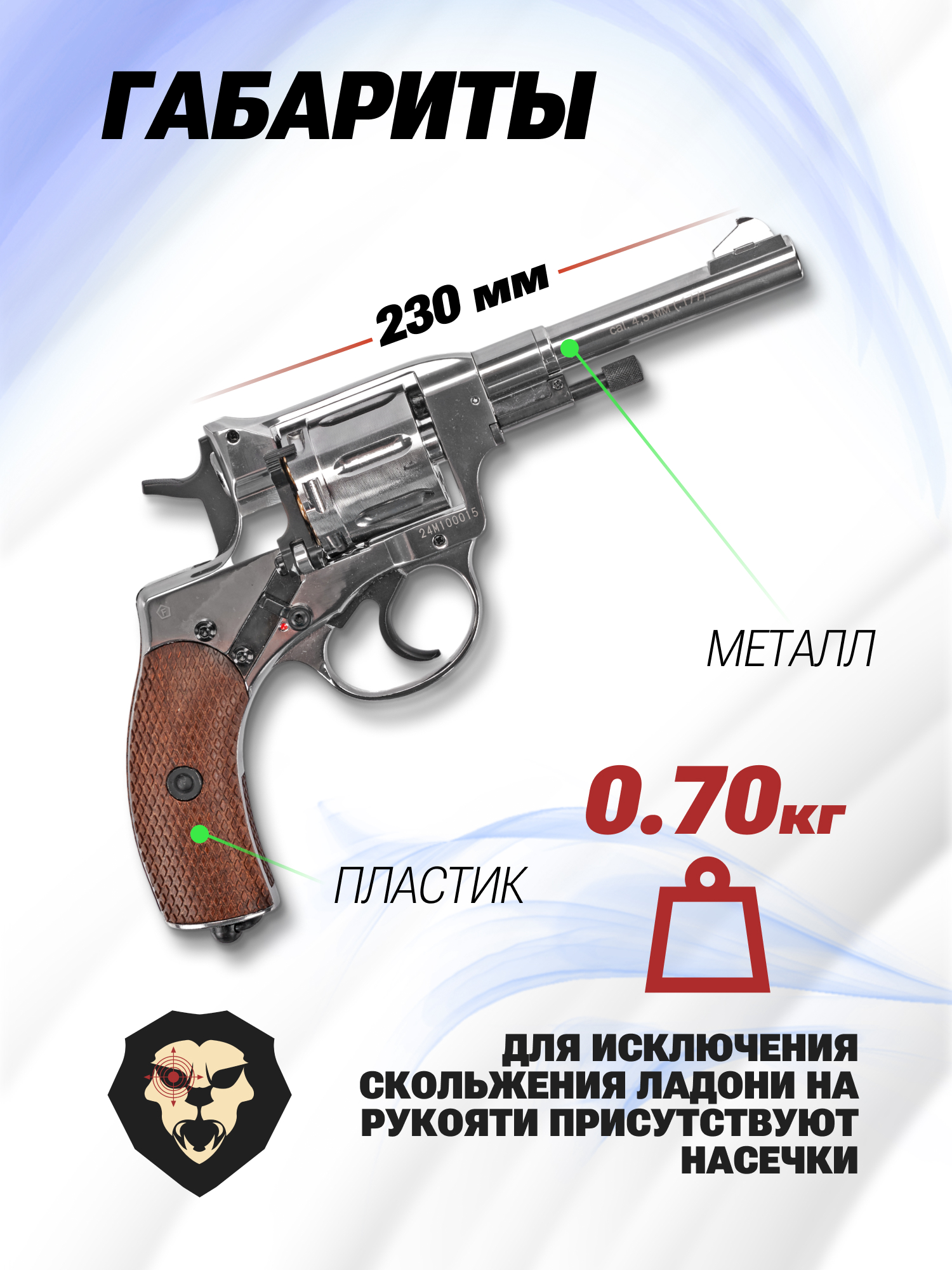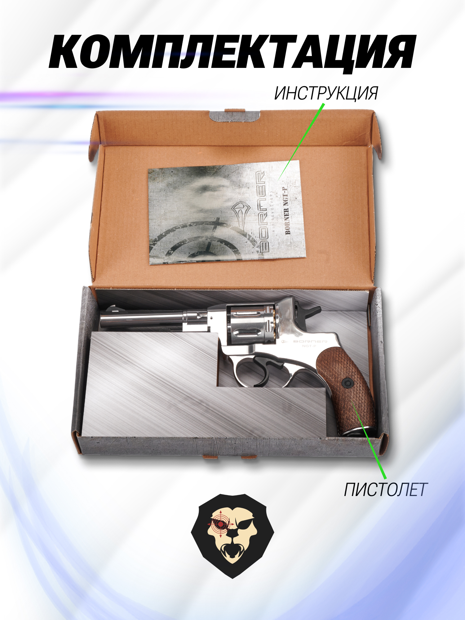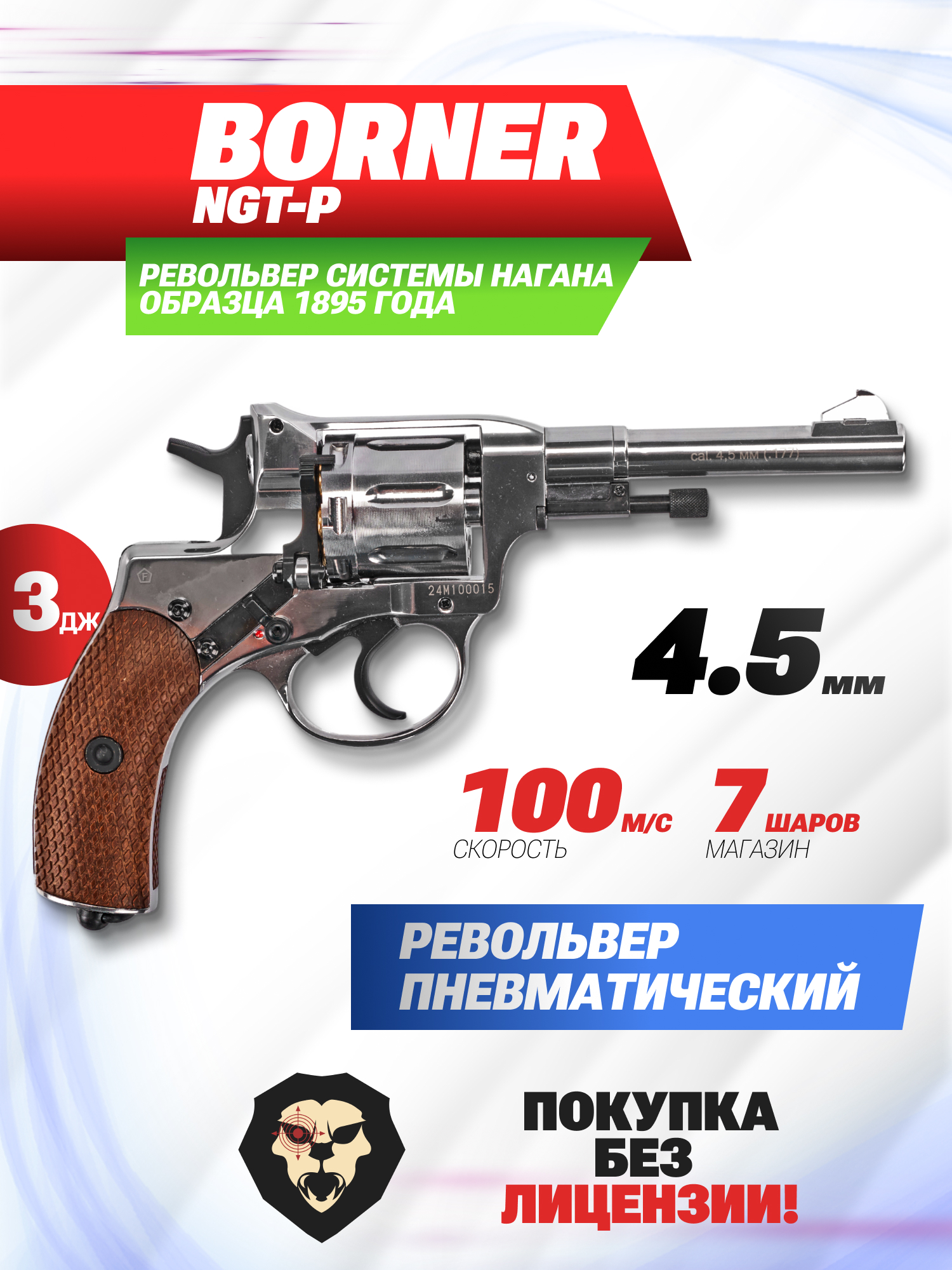 Информация о товаре "Пневматический револьвер Borner NGT-P 4.5 мм (silver, Наган, пулевой)" носит ознакомительный характер, и не является публичной офертой, определяемой положениями Статьи 437 Гражданского кодекса Российской Федерации, характеристики, внешний вид, цвет и комплектация могут быть изменены производителем без уведомления.