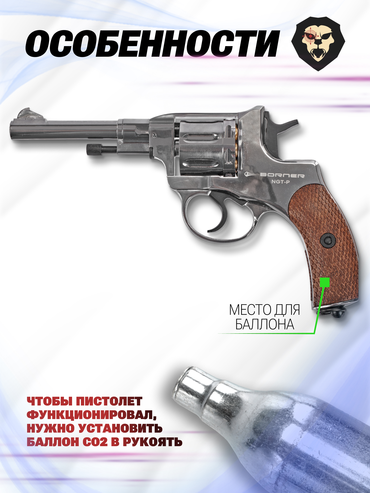 Пневматический револьвер Наган от Borner работает от углекислотного баллона, размещаемого в рукояти. Чтобы установить сменный резервуар 12 грамм CO2, потребуется снять боковую накладку. Поместив емкость с газом в соответствующем отсеке, затягивается поджимной винт, который выполнен в виде антабки со стороны пятки.