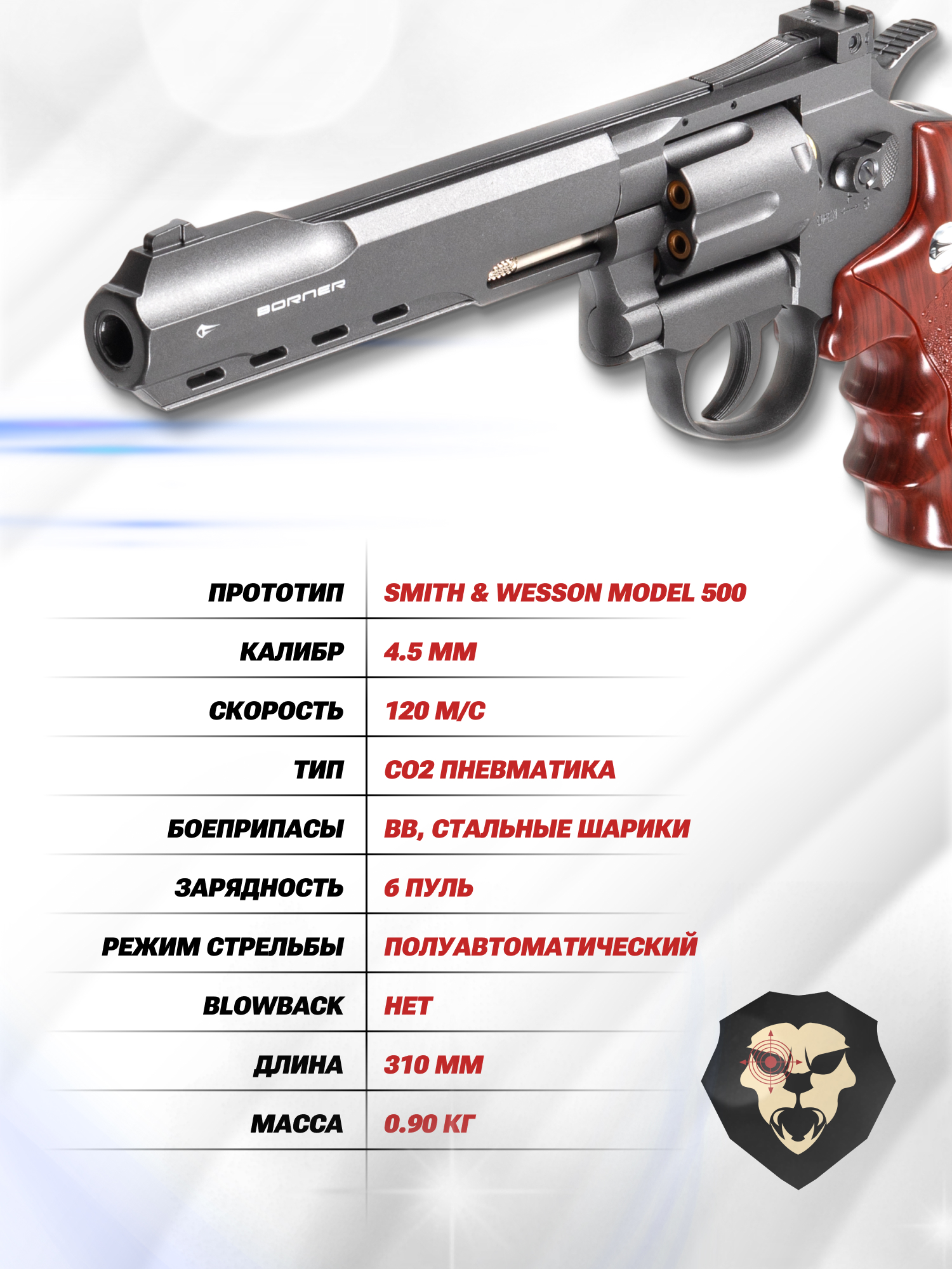 Револьвер - классика стрелкового оружия с возможностью ведения огня в полуавтоматическом режиме. Изобретение уходит корнями к Сэмюэлю Кольту в 1836 год. Образец, представленный к рассмотрению, это пневматическая копия Smith & Wesson Model 500.