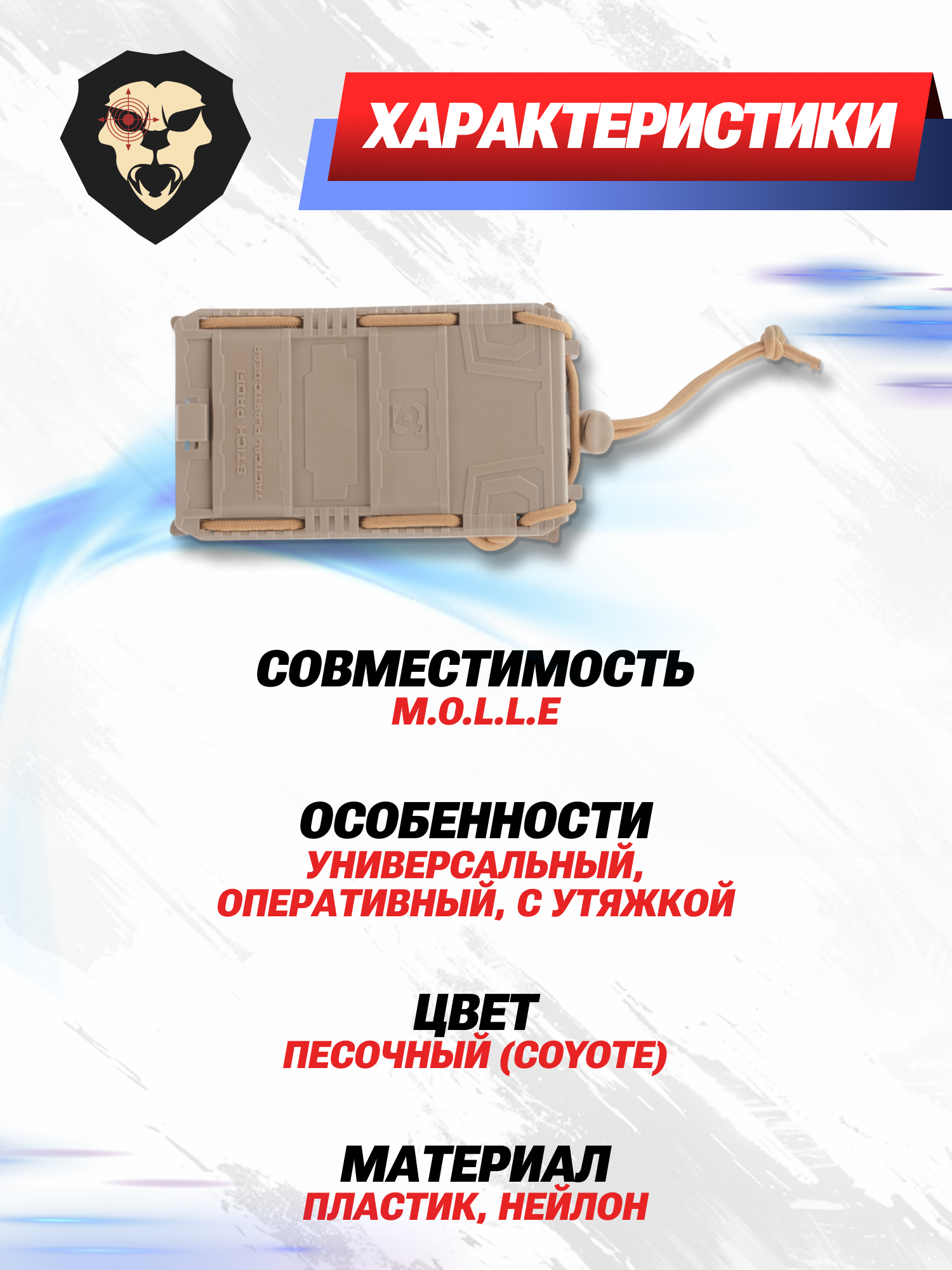 Полимерные детали скрепляет шоккорд с утяжкой, благодаря чему подсумок под магазин Стич Профи стал универсальным - для регулировки потребуется затянуть шнур и продвинуть фиксатор. Детали получили однотонную расцветку Coyote.
