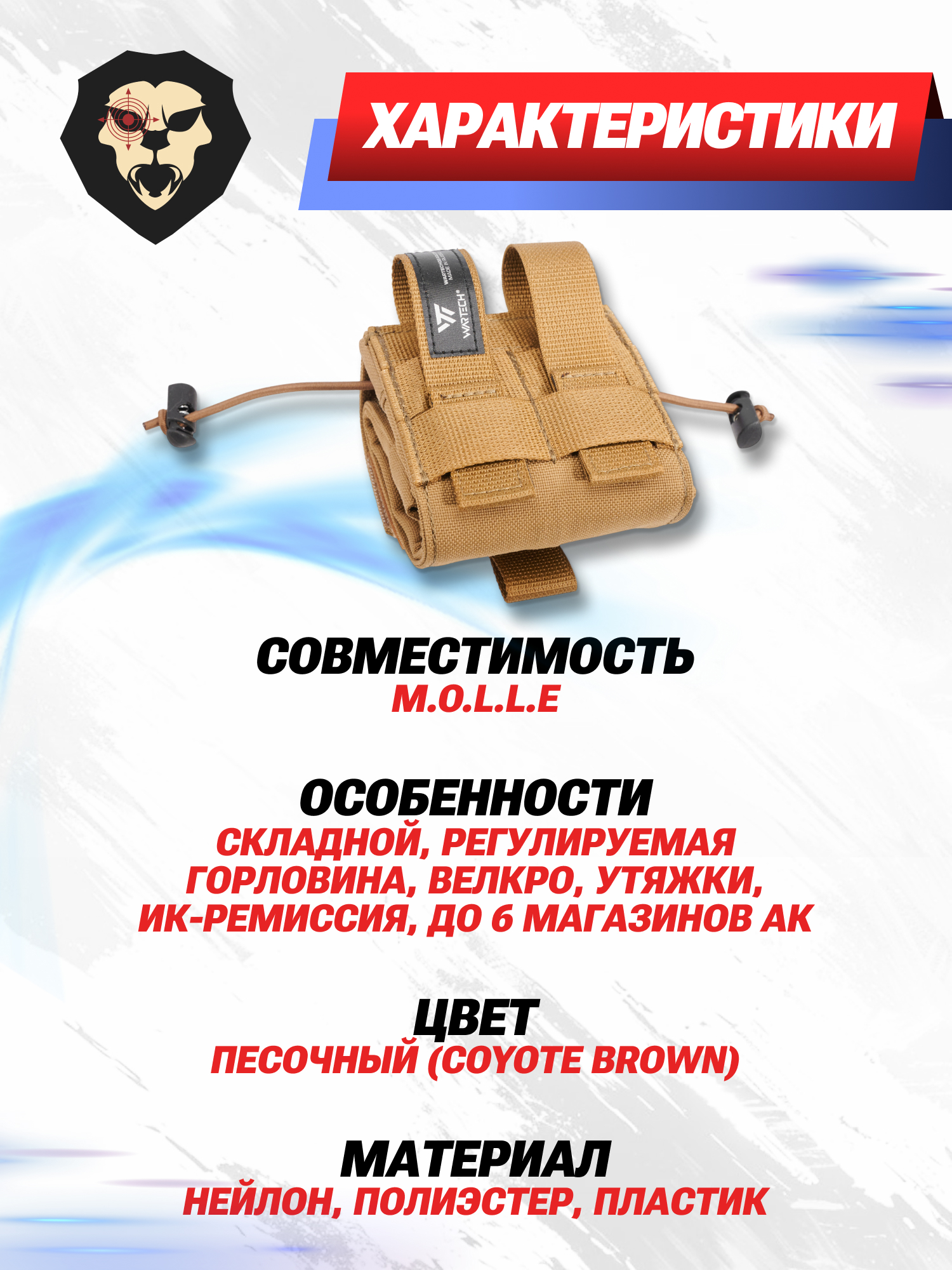 Информация о товаре "Подсумок для сброса Wartech Скатка (койот, UP-114-CB, складной)" носит ознакомительный характер, и не является публичной офертой, определяемой положениями Статьи 437 Гражданского кодекса Российской Федерации, характеристики, внешний вид, цвет и комплектация могут быть изменены производителем без уведомления.