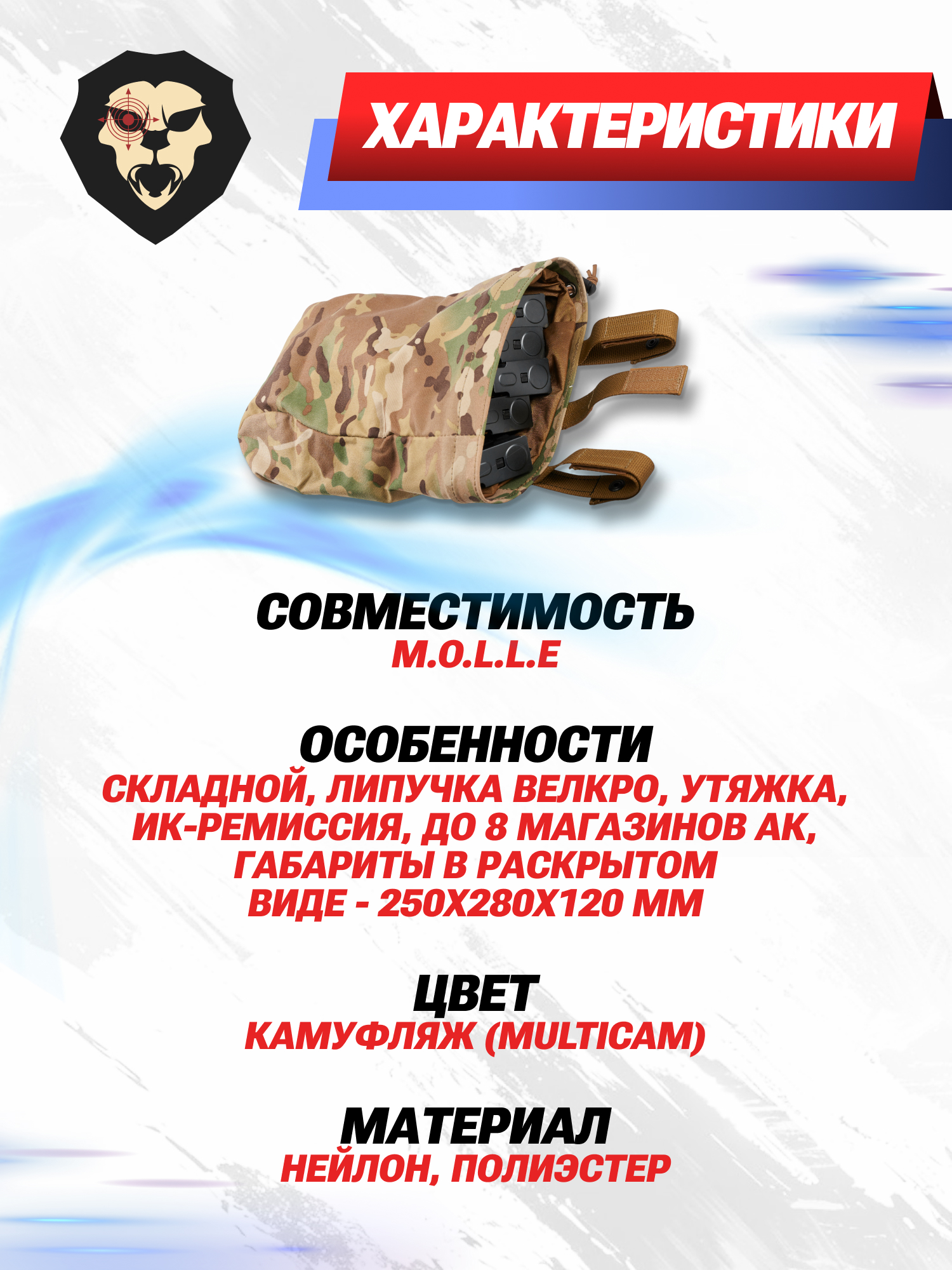 | Особенности | Складной, липучка велкро, утяжка, ИК-ремиссия, до 8 магазинов АК, габариты в раскрытом виде - 250x280x120 мм |