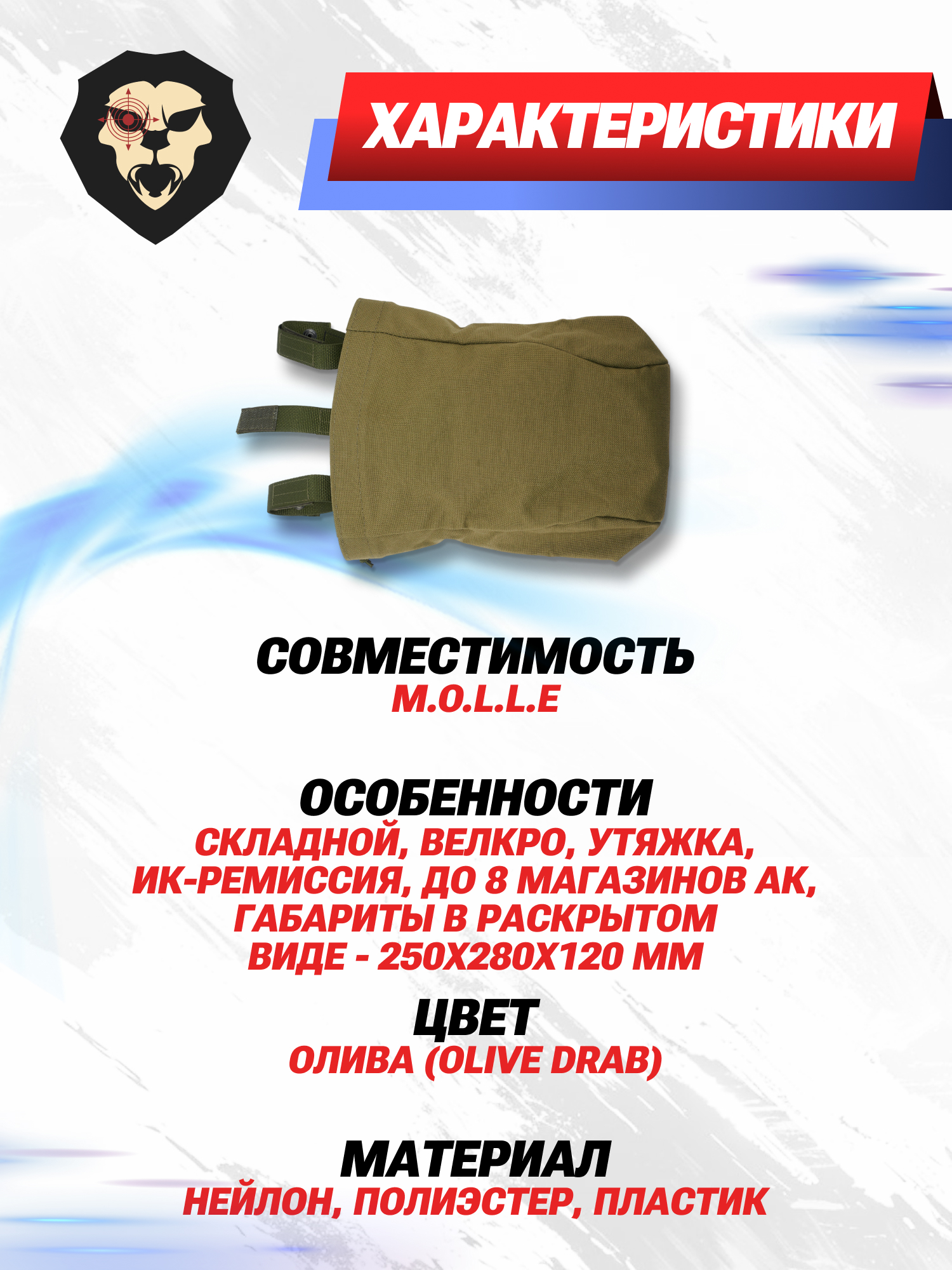 | Особенности | Складной, велкро, утяжка, ИК-ремиссия, до 8 магазинов АК, габариты в раскрытом виде - 250x280x120 мм |