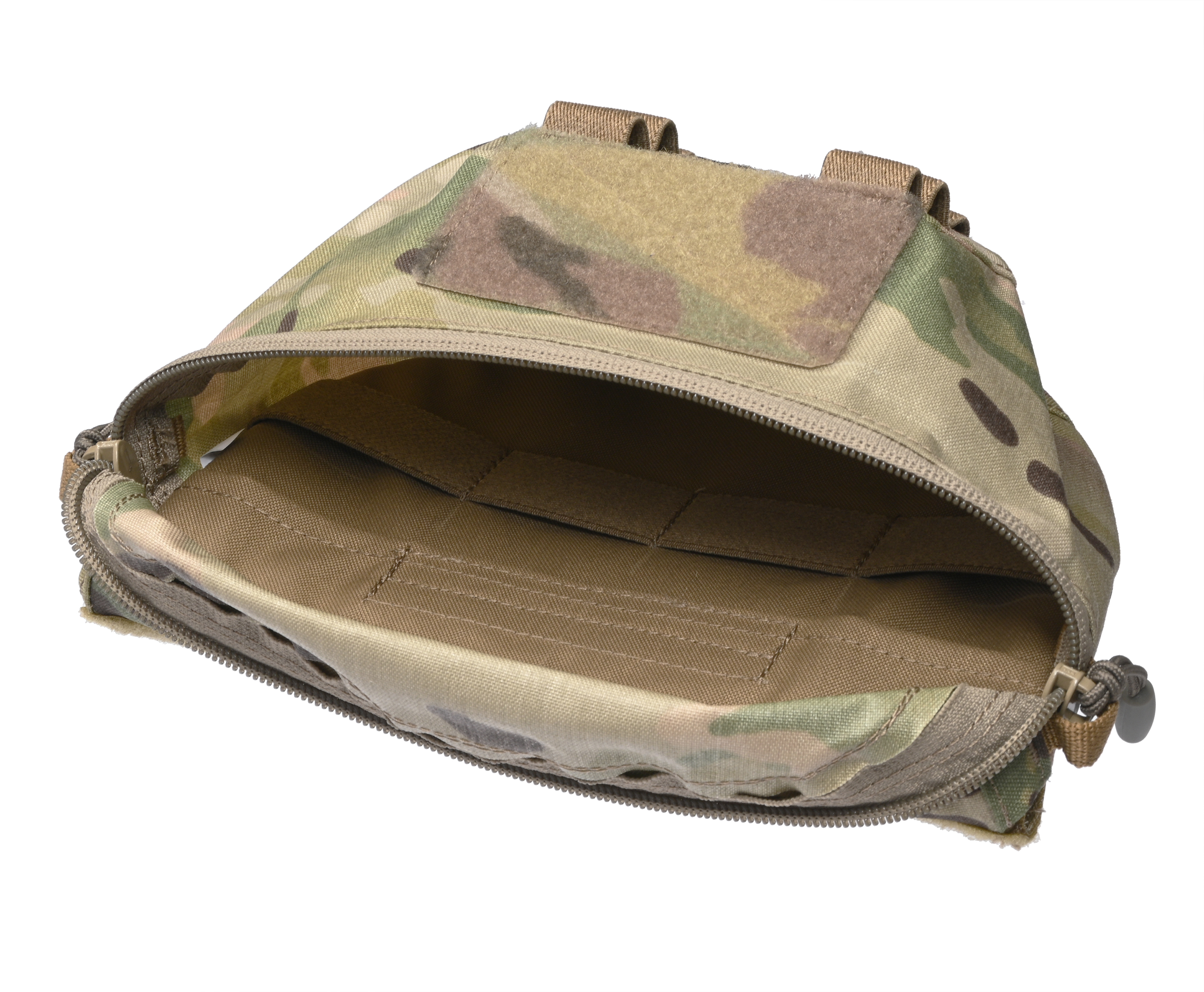Пакман от Ars Arma предполагает наличие единого пространства, закрываемого на молнию с двумя бегунками - длина пулеров позволит сохранить доступ даже если пользователь будет в перчатках. В отсеке присутствует эластичный органайзер, принимающий форму установленной в ячейку вещи. На внешней стороне сделали крепление для четырех ХИСов, место под размещение патча и две боковые петли.