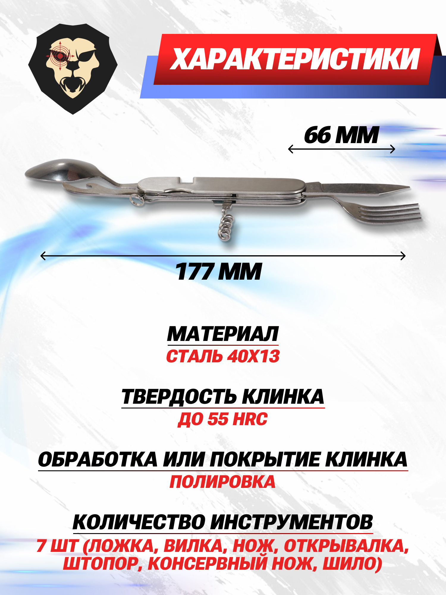| Набор инструментов | Ложка, вилка, нож, открывалка, штопор, консервный нож, шило |
