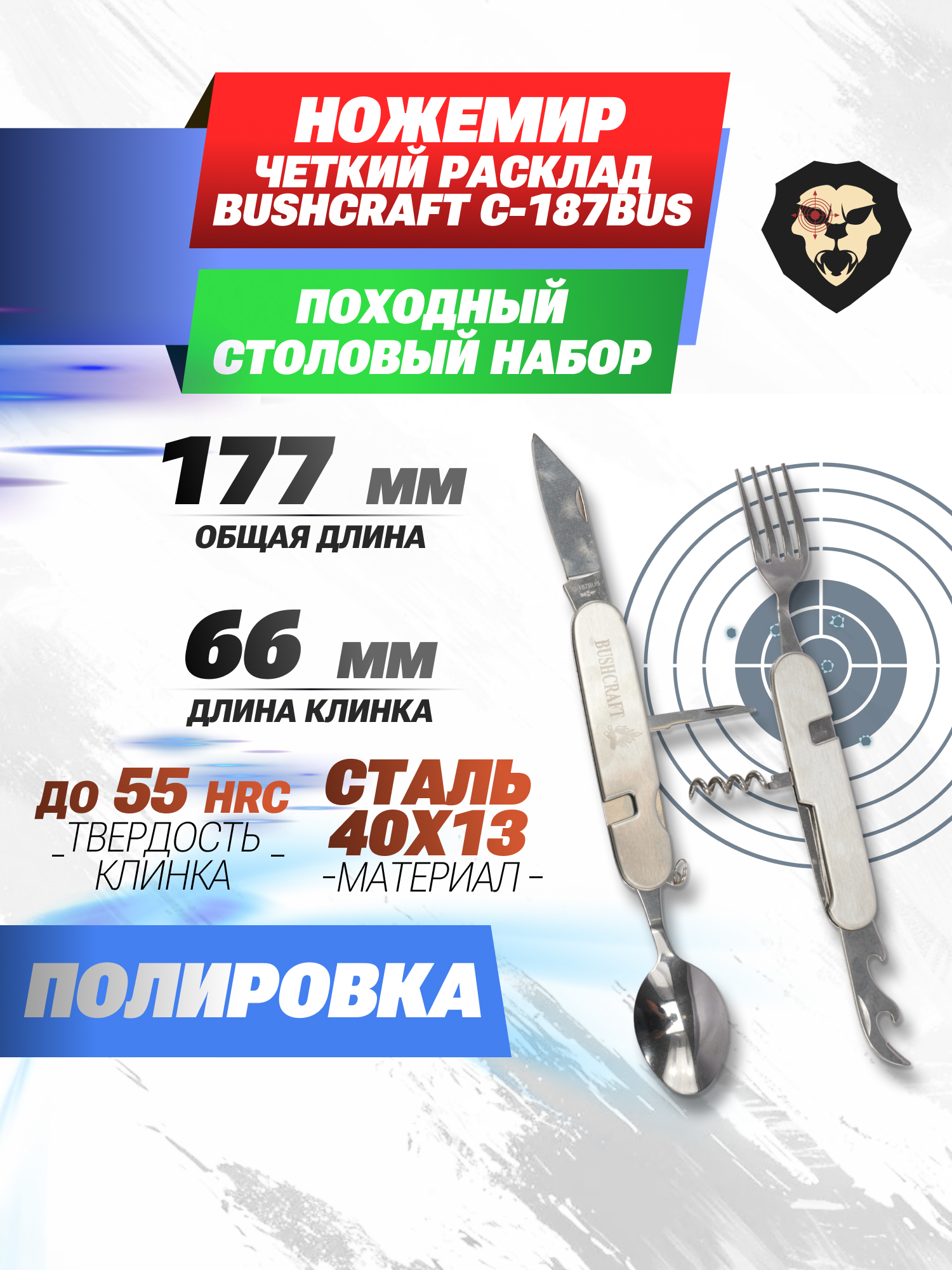 Мультитул - не всегда инструмент для слесарных дел, в таком форм-факторе также выпускаются специальные наборы для комфортного приготовления и последующего употребления пищи в полевых условиях. Модель C-187BUS отличается богатством встроенных функций и удобной конструкцией, что делает ее уместной во всех видах отдыха на природе - комплект Ножемир подойдет как для классического путешествия, так и пополнит бушкрафт снаряжение.