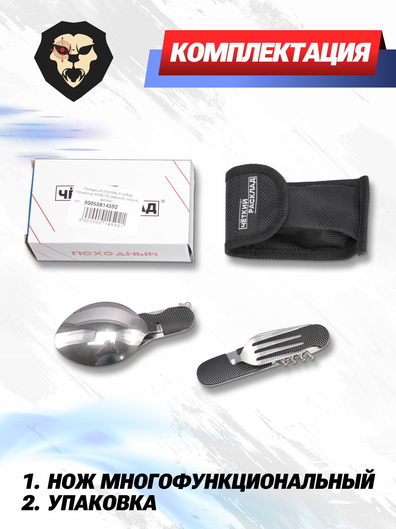Артикул производителя MNG-15 Походный столовый набор Ножемир MNG-15 (черный, ложка, вилка) по низкой цене 672 руб. Модель со штрихкодом производителя Вы можете оплатить наложенным платежем с доставкой или в отделении транспортной компании (ПЭК, СДЭК, Boxberry). Ваш заказ со штрихкодом 2000000145921 забрать на почте с оплатой при получении в любой части Российской Федерации.