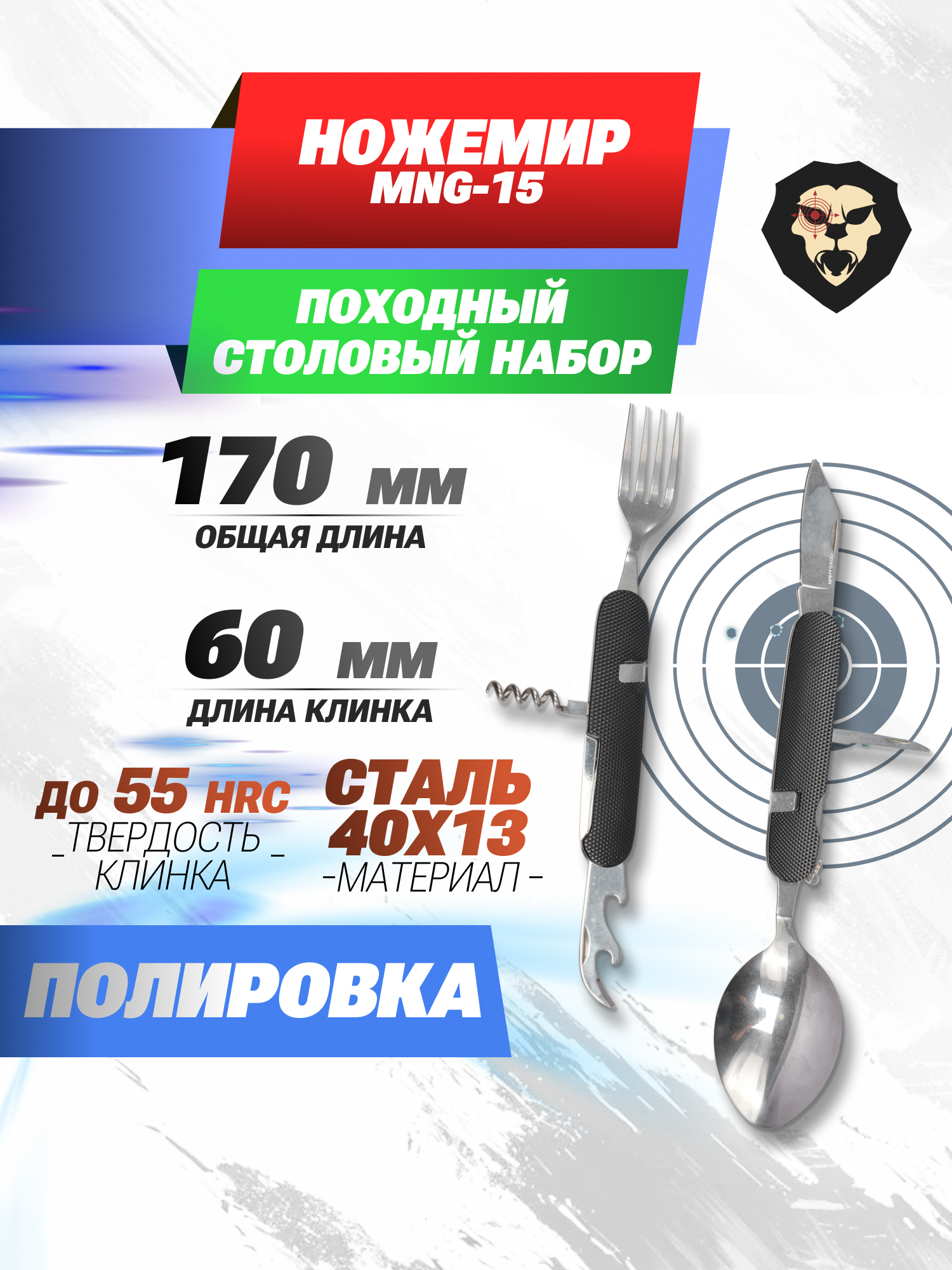 Рассматриваемый комплект включает базовый минимум для подготовки и непосредственного приема продуктов питания в условиях автономности. Походный столовый набор Nozhemir MNG-17 состоит из 7 приборов - перочинного и консервного ножа с открывалкой, ложки и вилки, а также шила и штопора.