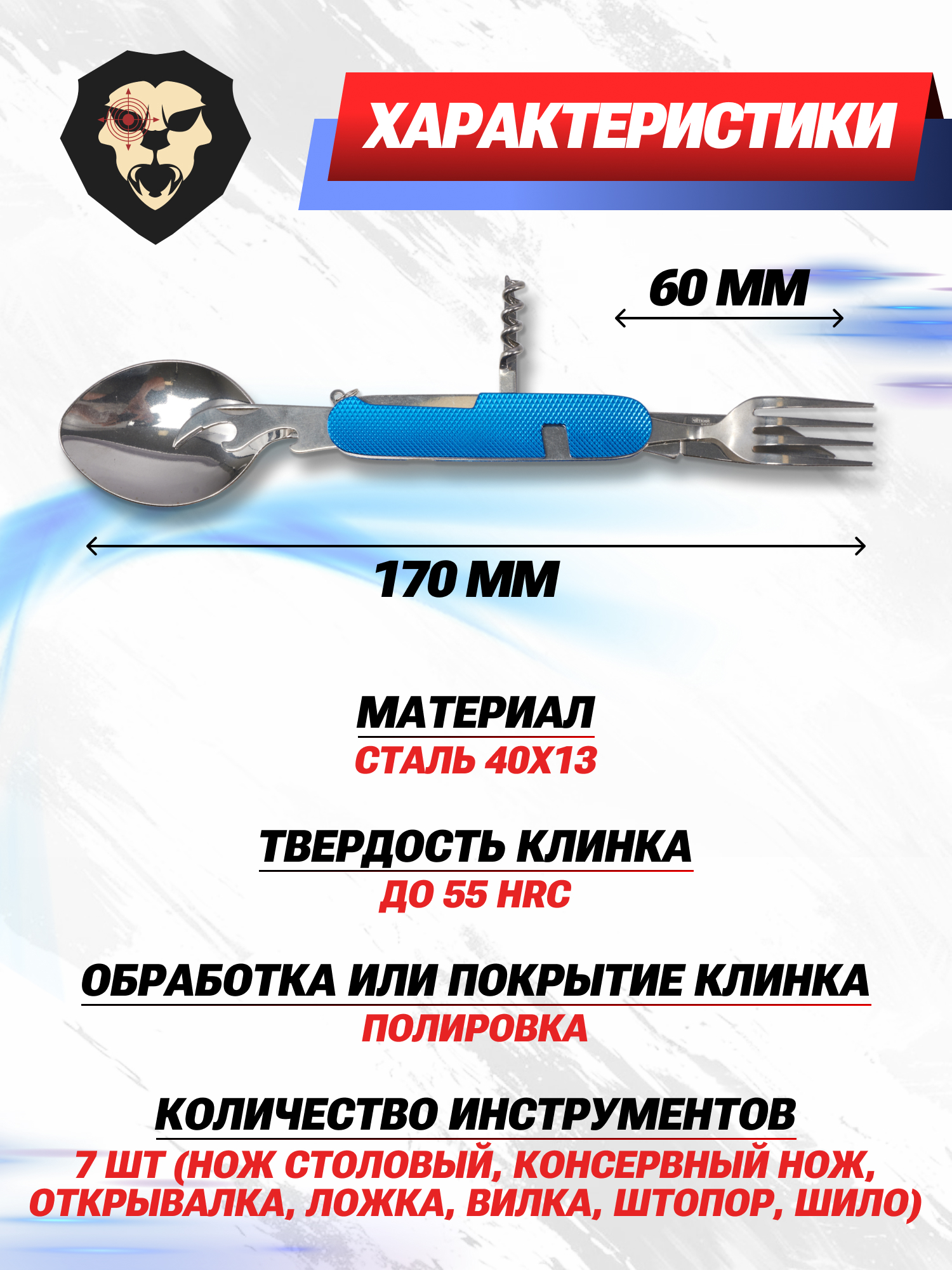 Рассматриваемое изделие представляет собой раздваиваемый складной мультиинструмент. В состав вошли 7 принадлежностей - ложка и вилка, открывалка, штопор и шило, а также перочинный и консервный нож. Его габариты в сложенном виде составляют 111x51x38 мм - таким образом, набор без труда поместится в карманах.