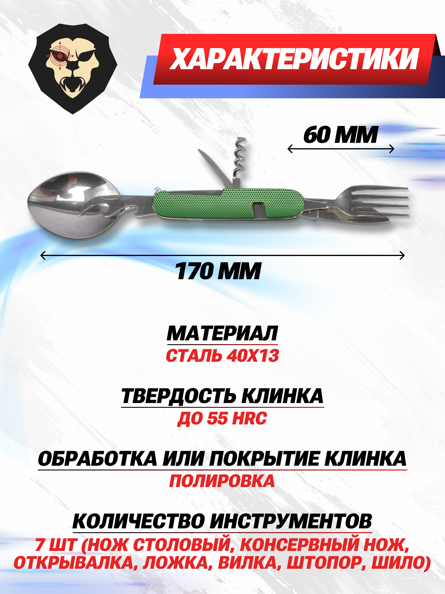 | Набор инструментов | Нож столовый, консервный нож, открывалка, ложка, вилка, штопор, шило |