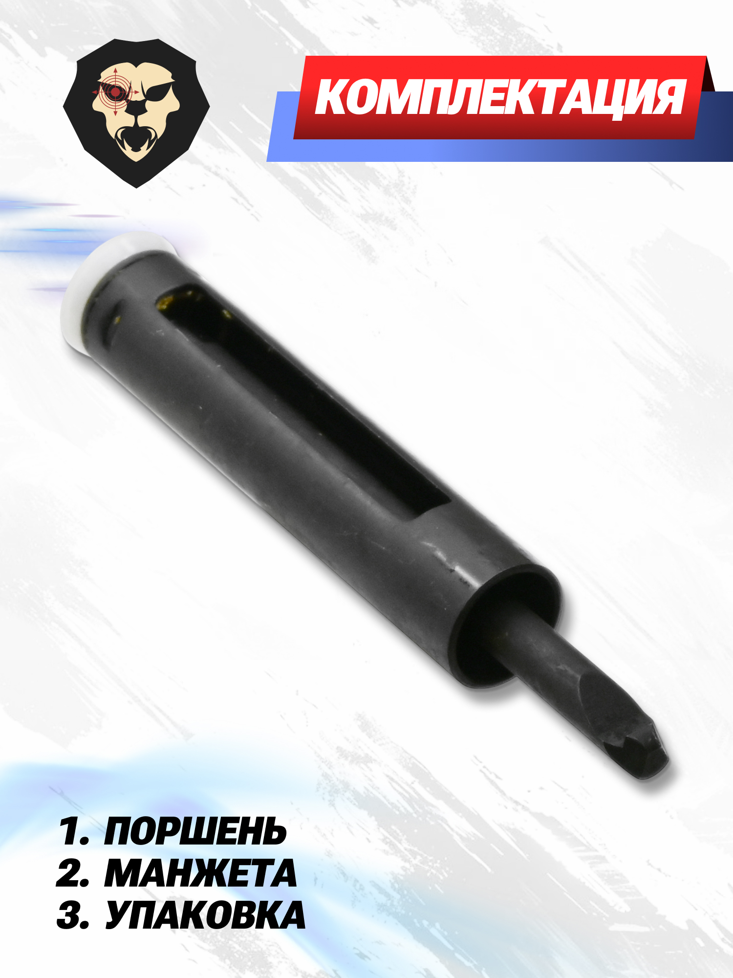 Также отмечается отсутствие отверстий в донце для снижения компрессии. На поршне установлена манжета. Деталь изготовлена из металла - поверхность вороненая, что защищает элемент от коррозии.