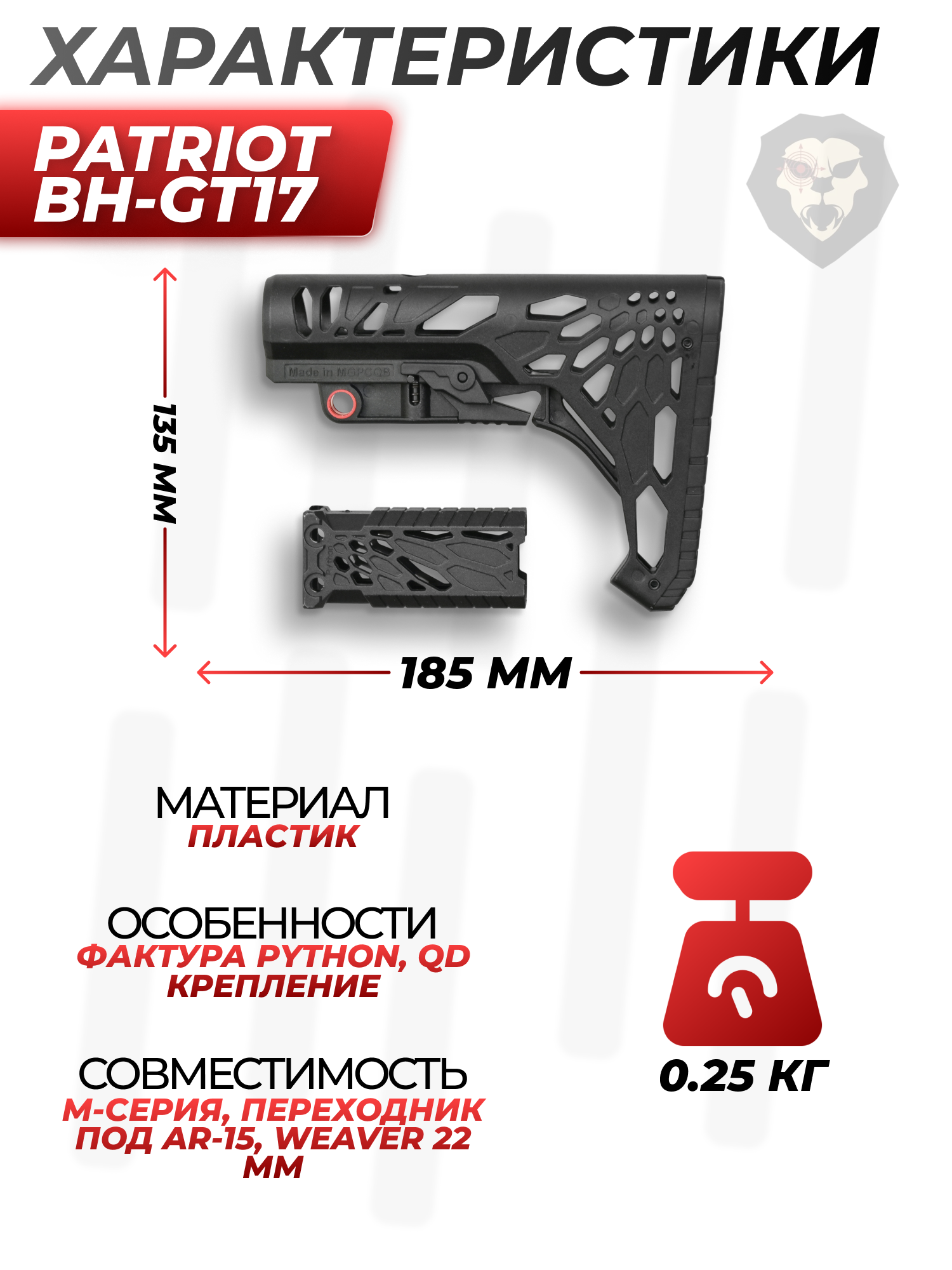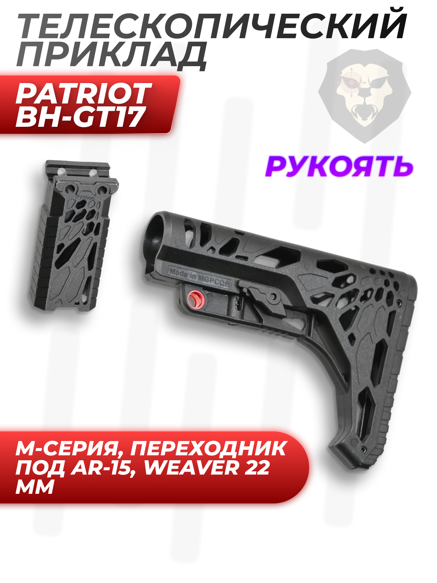 Артикул производителя BH-GT17 Приклад телескопический Patriot BH-GT17 (с рукоятью) по низкой цене 2590 руб. Модель со штрихкодом производителя Вы можете оплатить наложенным платежем с доставкой или в отделении транспортной компании (ПЭК, СДЭК, Boxberry). Ваш заказ со штрихкодом 2000000070124 забрать на почте с оплатой при получении в любой части Российской Федерации.